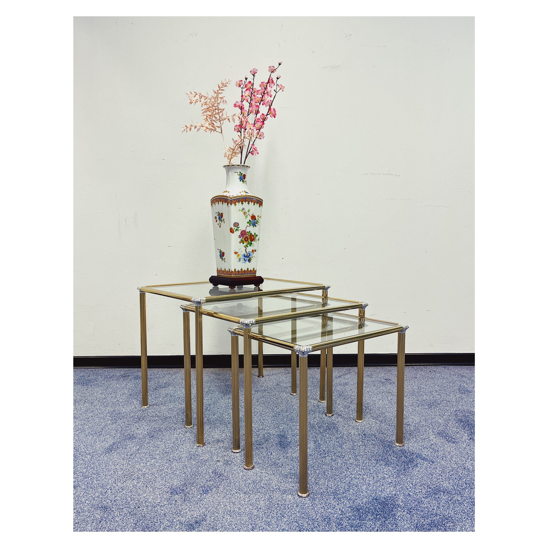 Mimiset van goud messing en glas. De 3 tafeltjes bieden ruimte voor decoratie, dienen als bijzetmeubel voor de bank, maar kunnen ook los als tafeltje gebruikt worden. De glasplaten liggen los in het gouden onderstel en de hoeken zijn verstevigd door zilver chroom. De nestling set heeft wat kleine gebruikssporen maar zijn zeker nog klaar voor een volgende ronde!
