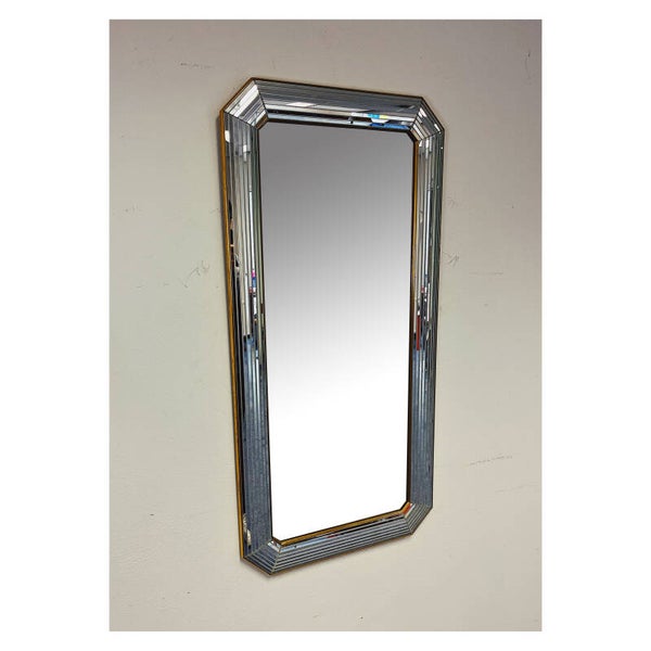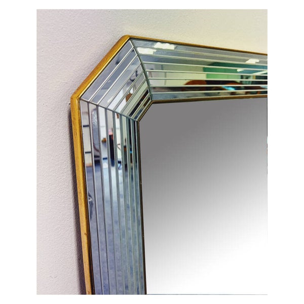 Grote Deknudt design spiegel. De spiegel heeft prachtige facet geslepen details en wordt afgewerkt met gouden messing details. DeKnudt was een grote spiegel fabrikant vanaf de jaren 70 tot heden. De spiegel heeft een stevig ophangsysteem en is gemerkt aan de achterzijde. De spiegel heeft wel wat zichtbare gebruikssporen zoals een klein chipje is uit het glas aan de bovenzijde en wat slijtage aan de gouden randen.