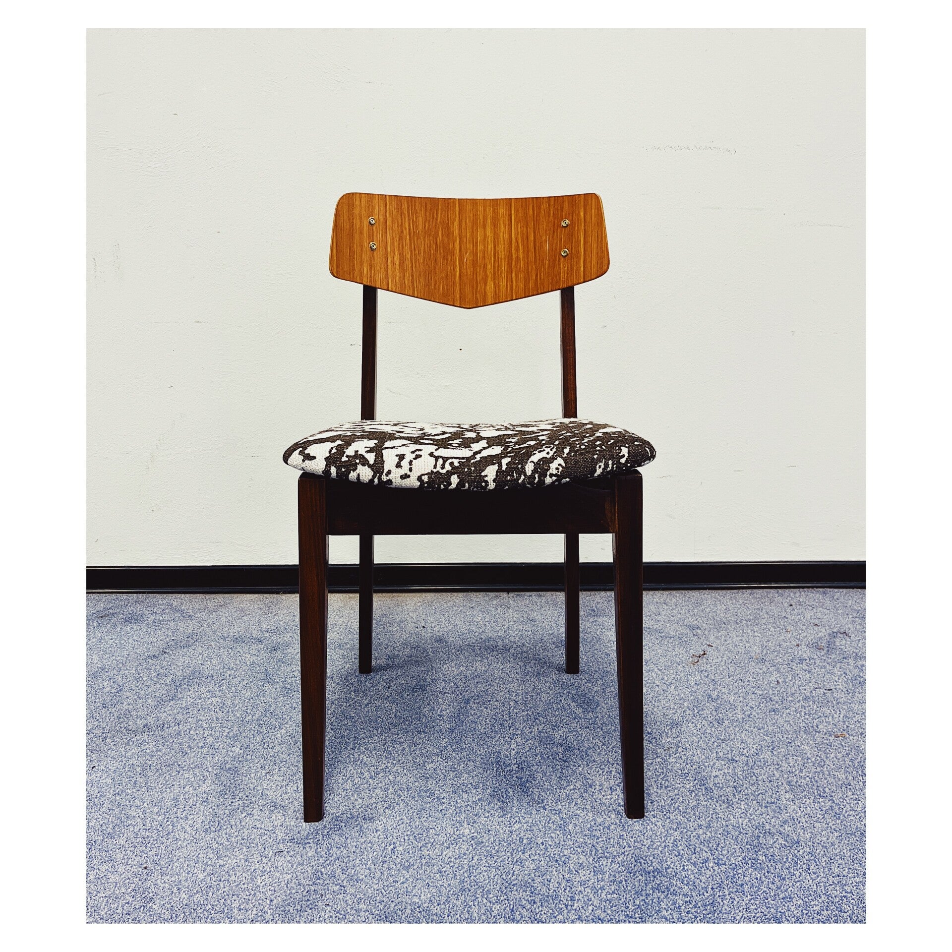 Vintage Point is met veel enthousiasme een samenwerking aangegaan met twee zeer getalenteerde meubelstoffeerders. Jacqueline en Brigitte hebben deze prachtige dinerstoel met vakwerk, aandacht en liefde geheel opnieuw gestoffeerd. De stoel is in top conditie en de bijzondere zwart witte print van het zitvlak maakt het geheel een aanwinst voor je interieur!