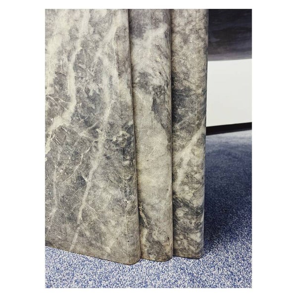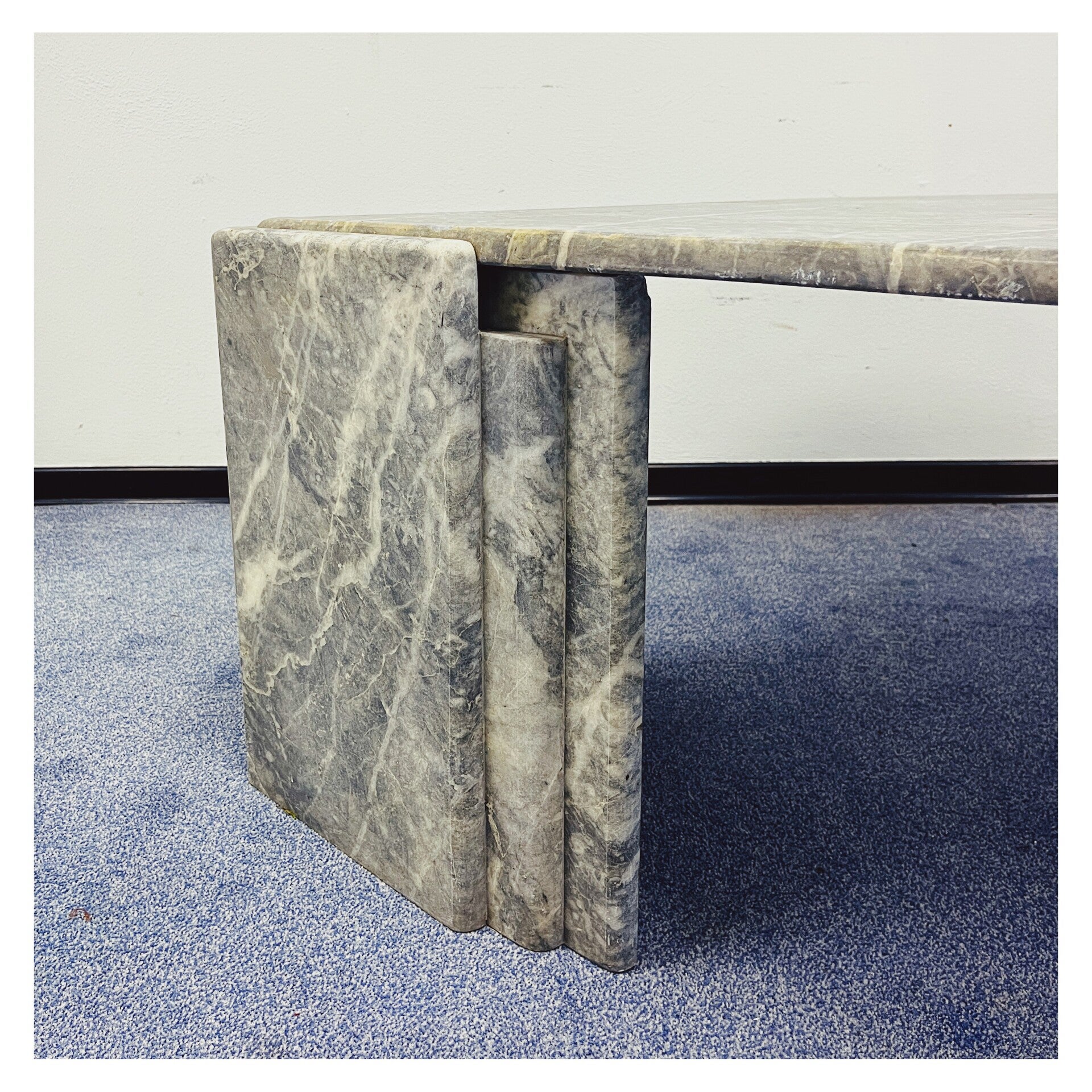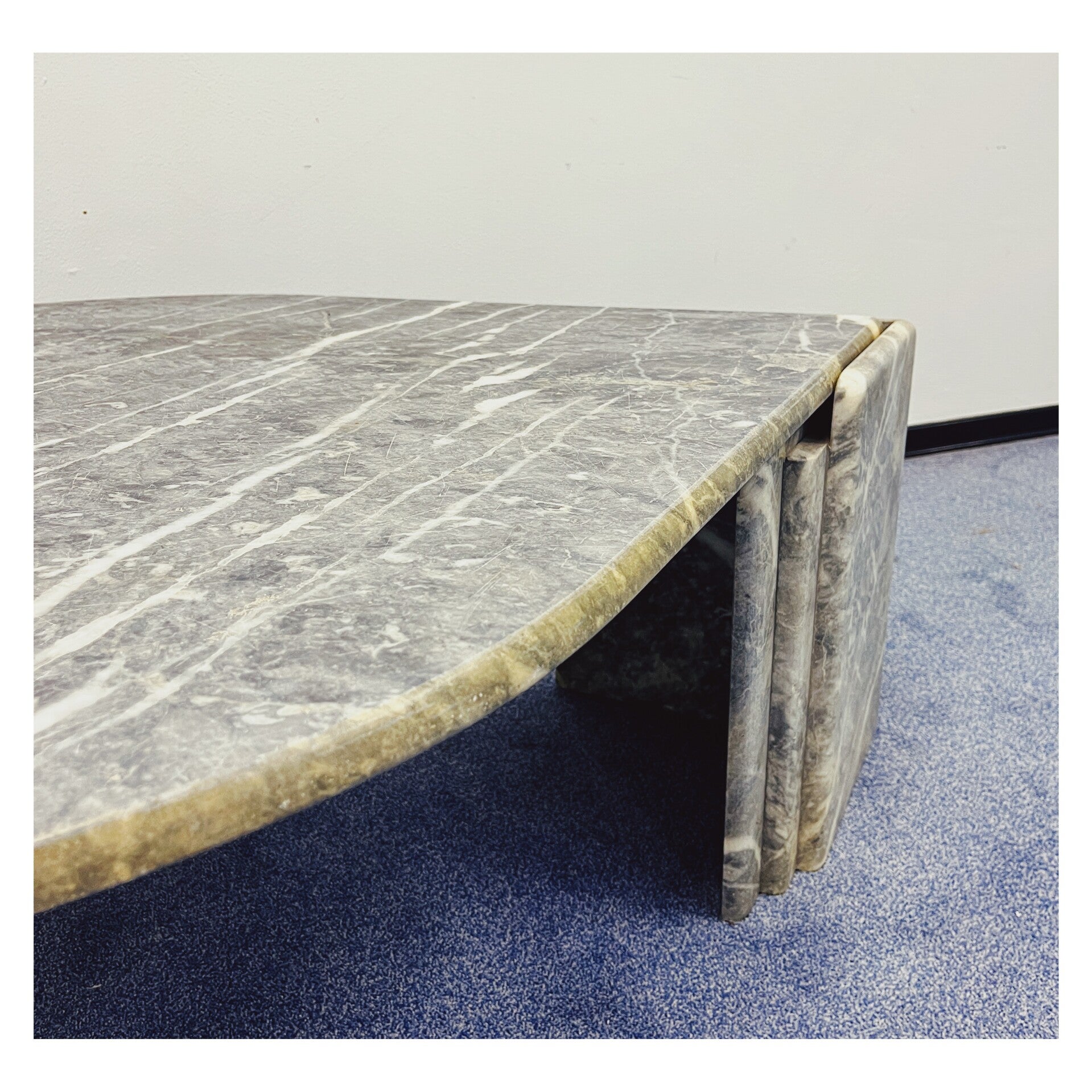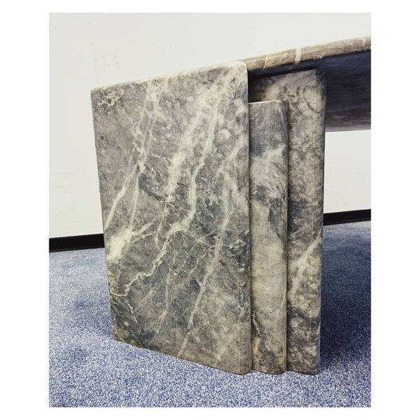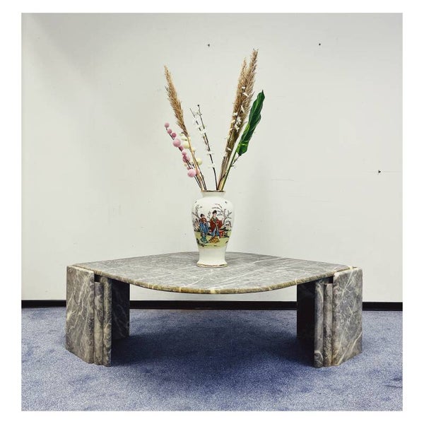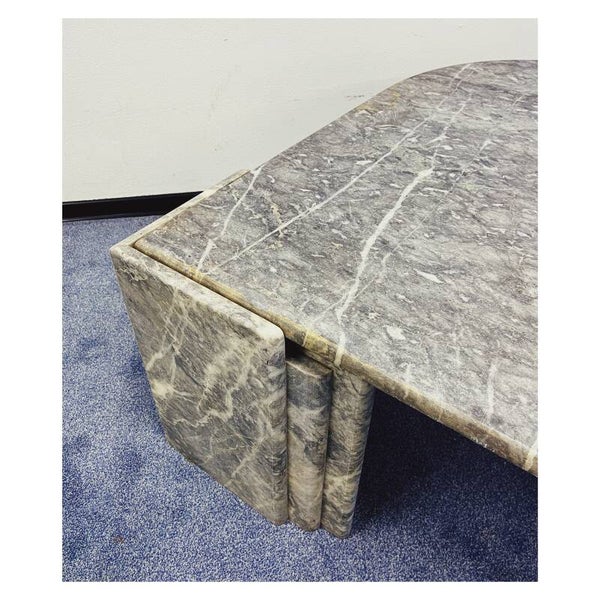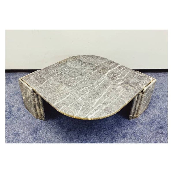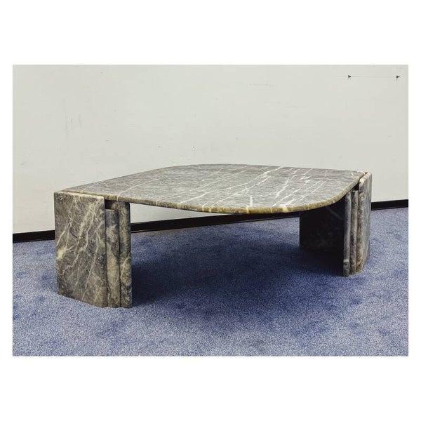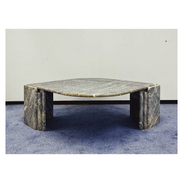 Italiaanse salontafel van grijs/wit marmer. De tafel heeft een druppel vormig bovenblad die stevig in een tweedelig onderstel rust. Het bovenblad en de twee poten kunnen dus los van elkaar. De tafel is in goede vintage conditie en zal een mooie natuurlijke look creëren in je interieur.