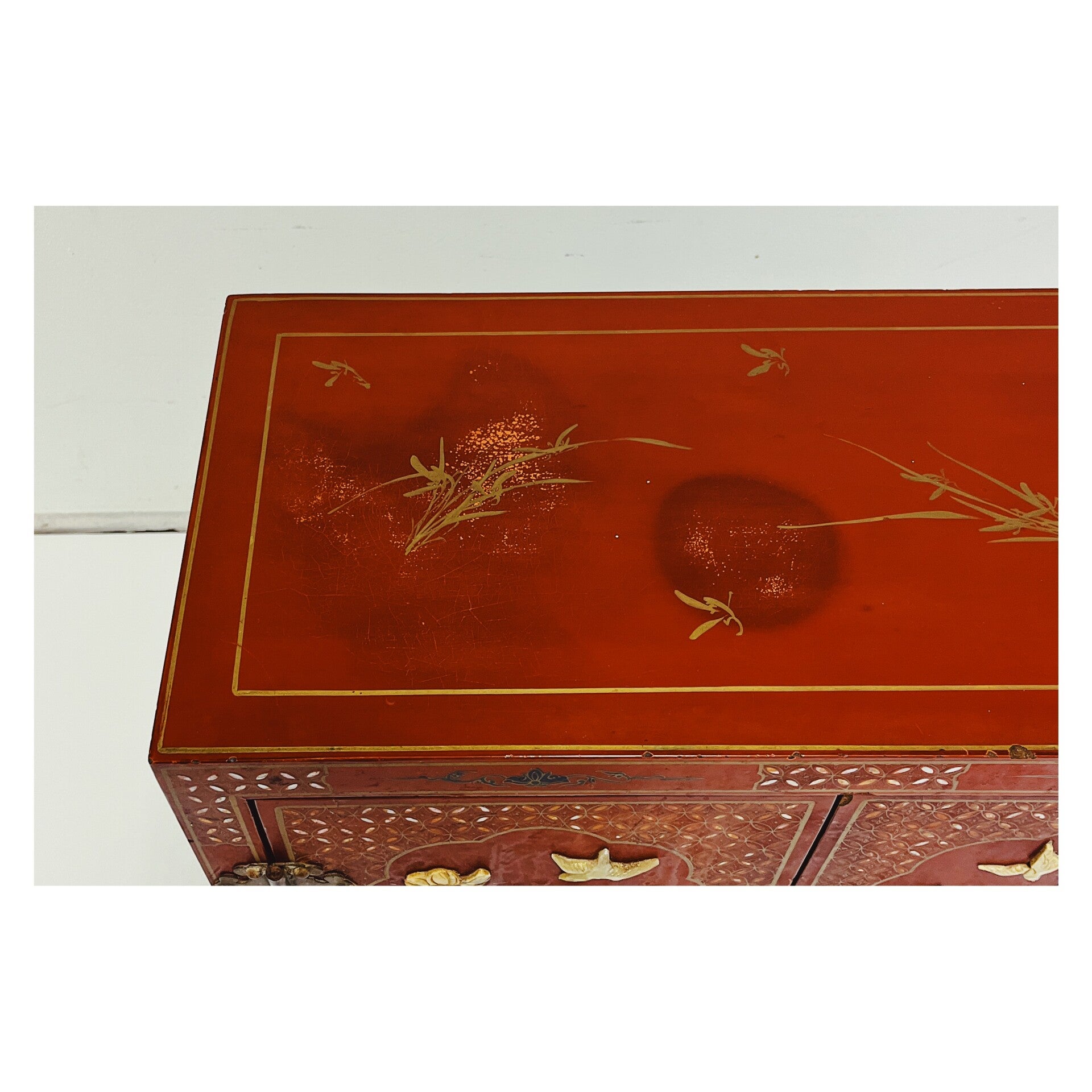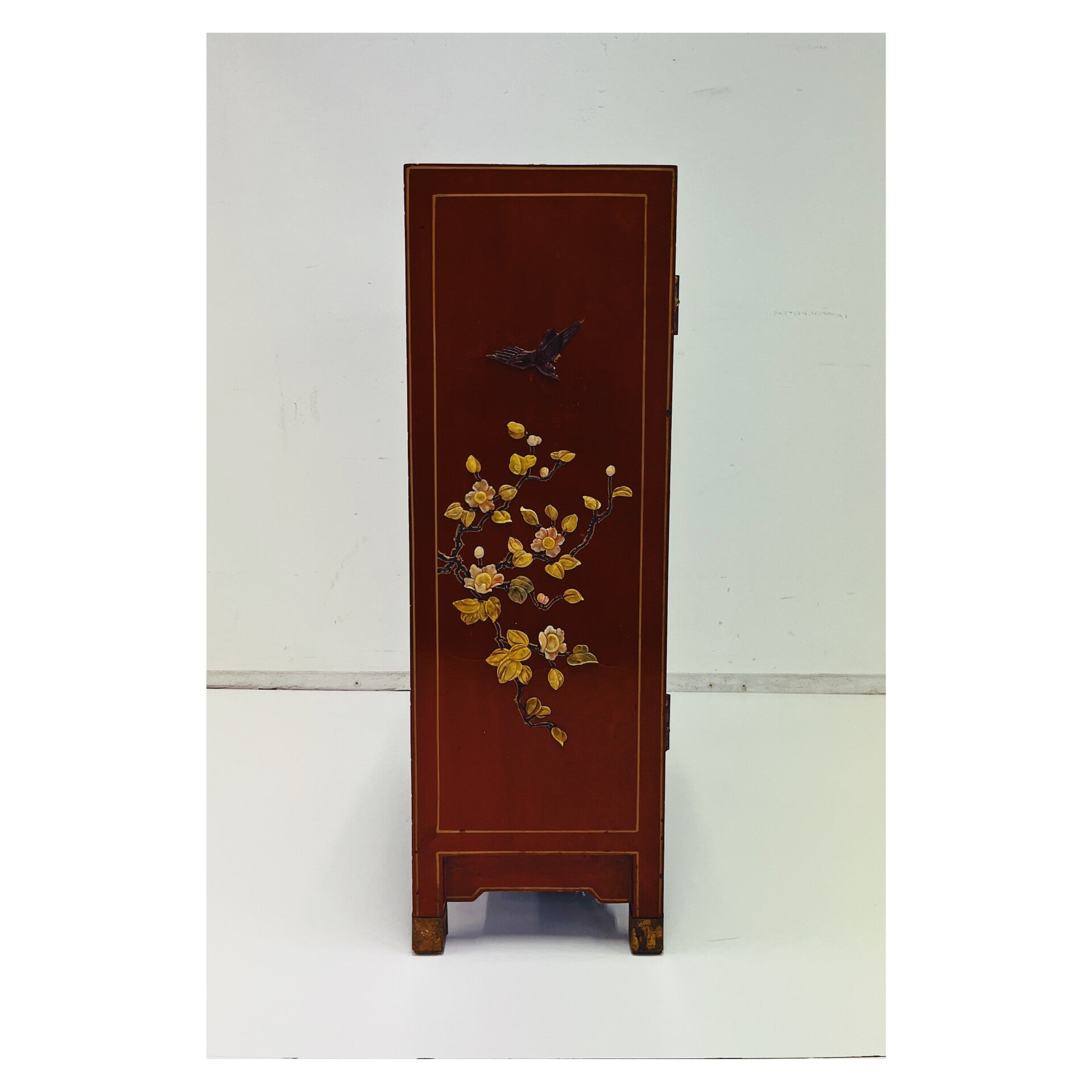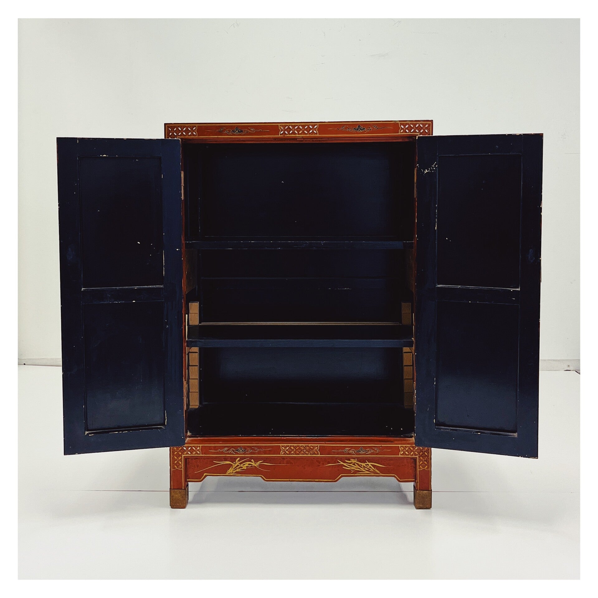 Handgeschilderde Chinese kast! Let op dit model is wat kleiner dan de gebruikelijke Chinese kasten. De rode kast heeft prachtige met de hand beschilderde versieringen en prachtige parelmoer en speksteen decoraties op de voor- en zijkanten. Het meubel bestaat uit twee deuren die wijd opengeklapt kunnen worden. De deuren hebben beide het traditionele traditionele hang en sluit werk van de Chinese kasten! De kast heeft wat gebruikssporen naar leeftijd.