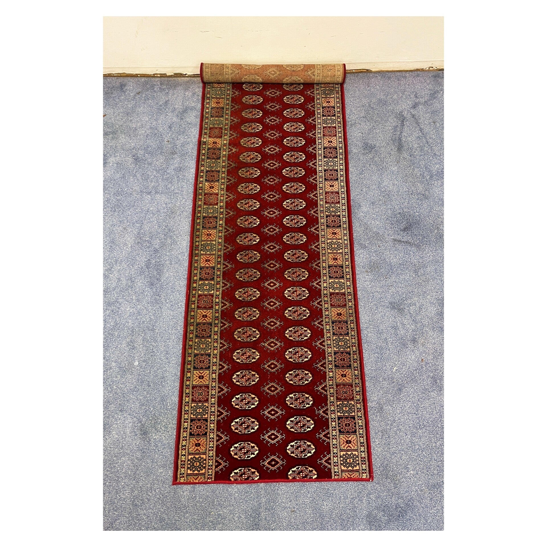 Mooie lange rode loper met mooie geometrische vormen. De basiskleur is rood maar het kleed heeft ook andere kleuren. Perfect voor een evenement en als entree loper. De huurprijs is per gebruiksdag.Afmetingen297 x 82cm