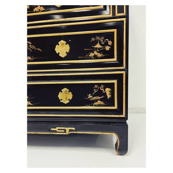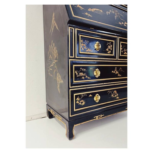 Prachtige Chinese secretaire. Het bureau is versierd met handgeschilderde decoraties en heeft het traditionele Chinese hang- en sluit werk. De kast beschikt over twee ruime laden, en twee kleine laden. Door het bovenste gedeelte uit te klappen creëer je een perfecte werkplek. In het bovenste gedeelte bevinden zich twee kleine lades en een aantal handige opbergvakjes. Het meubel is in goede conditie gezien de leeftijd met hier en daar wat gebruikssporen en er mist een messing hangertje aan één lade. Dit meubel zal een pronkstuk worden van je interieur.