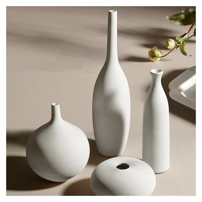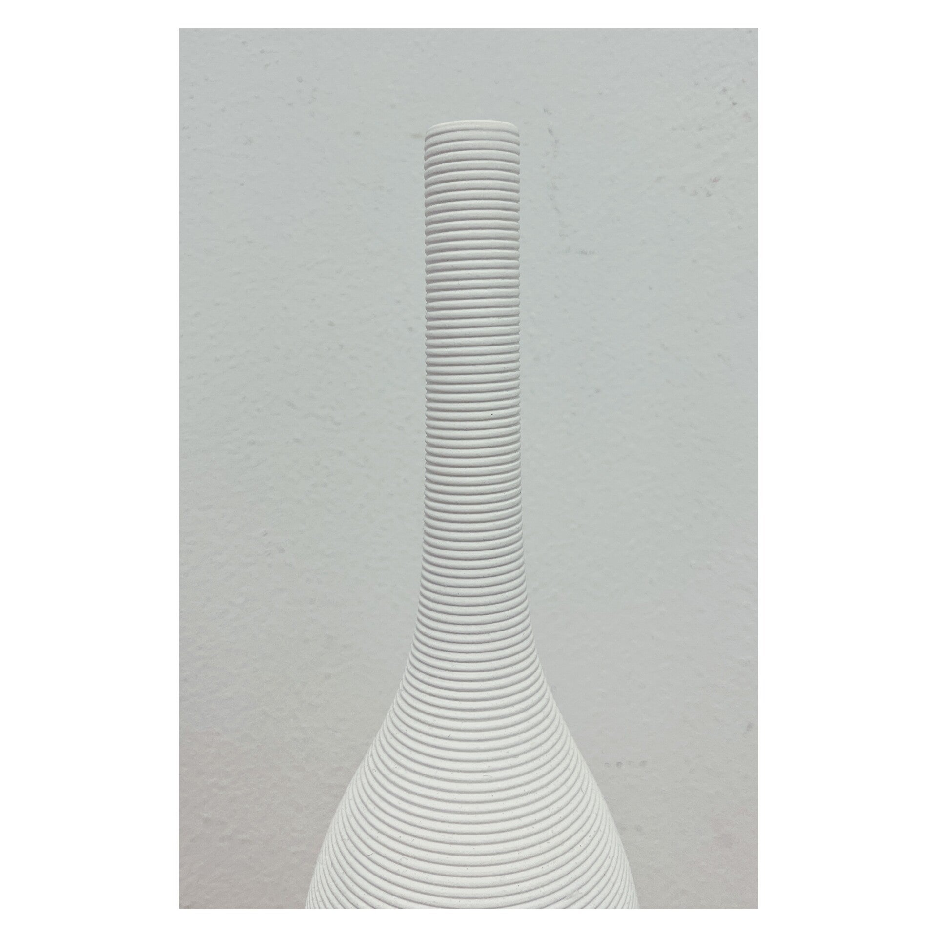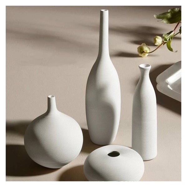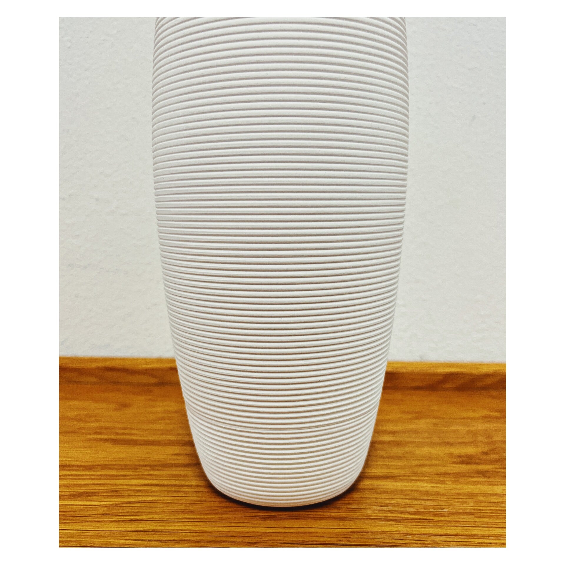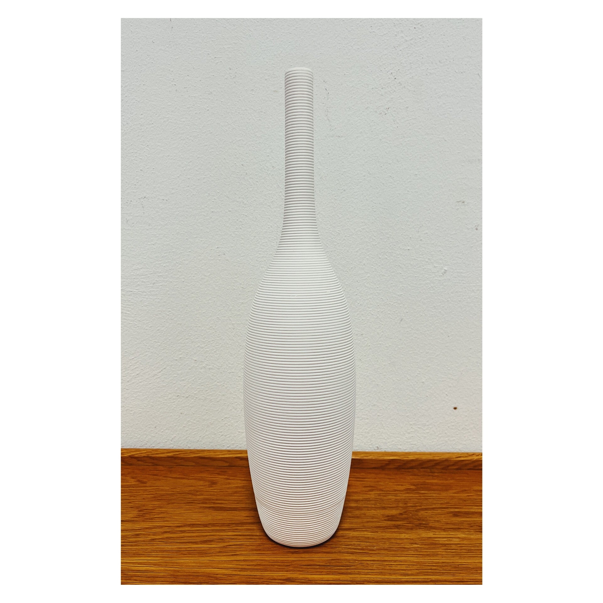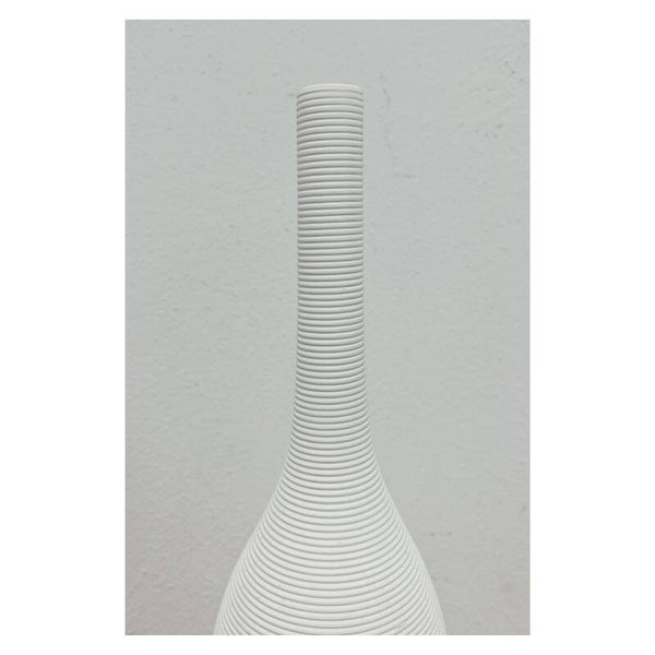 Moderne minimalistische witte vaas. De vaas is vervaardigd uit keramiek en heeft een fles vorm met horizontale groeven.AfmetingenHoogte: 38cm
