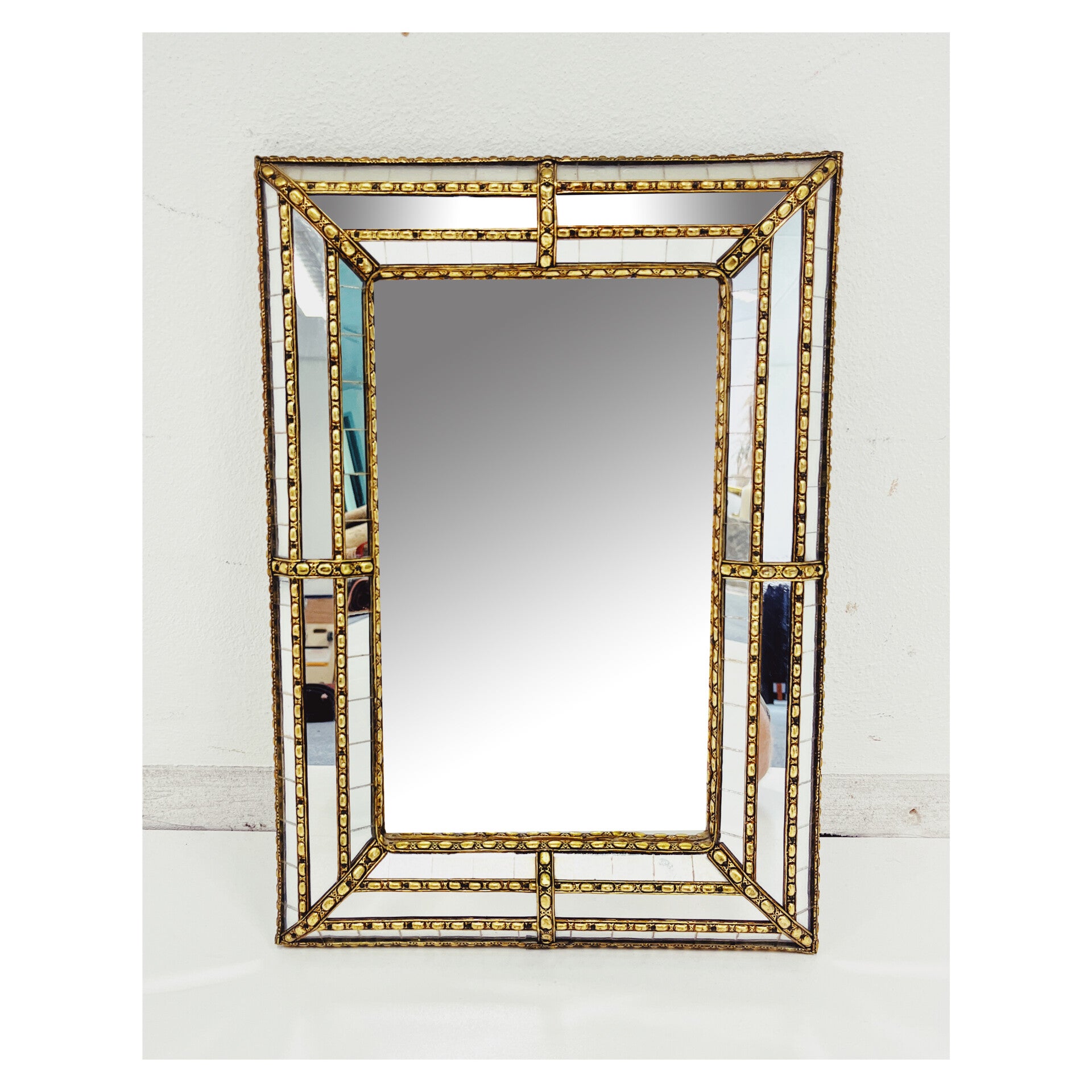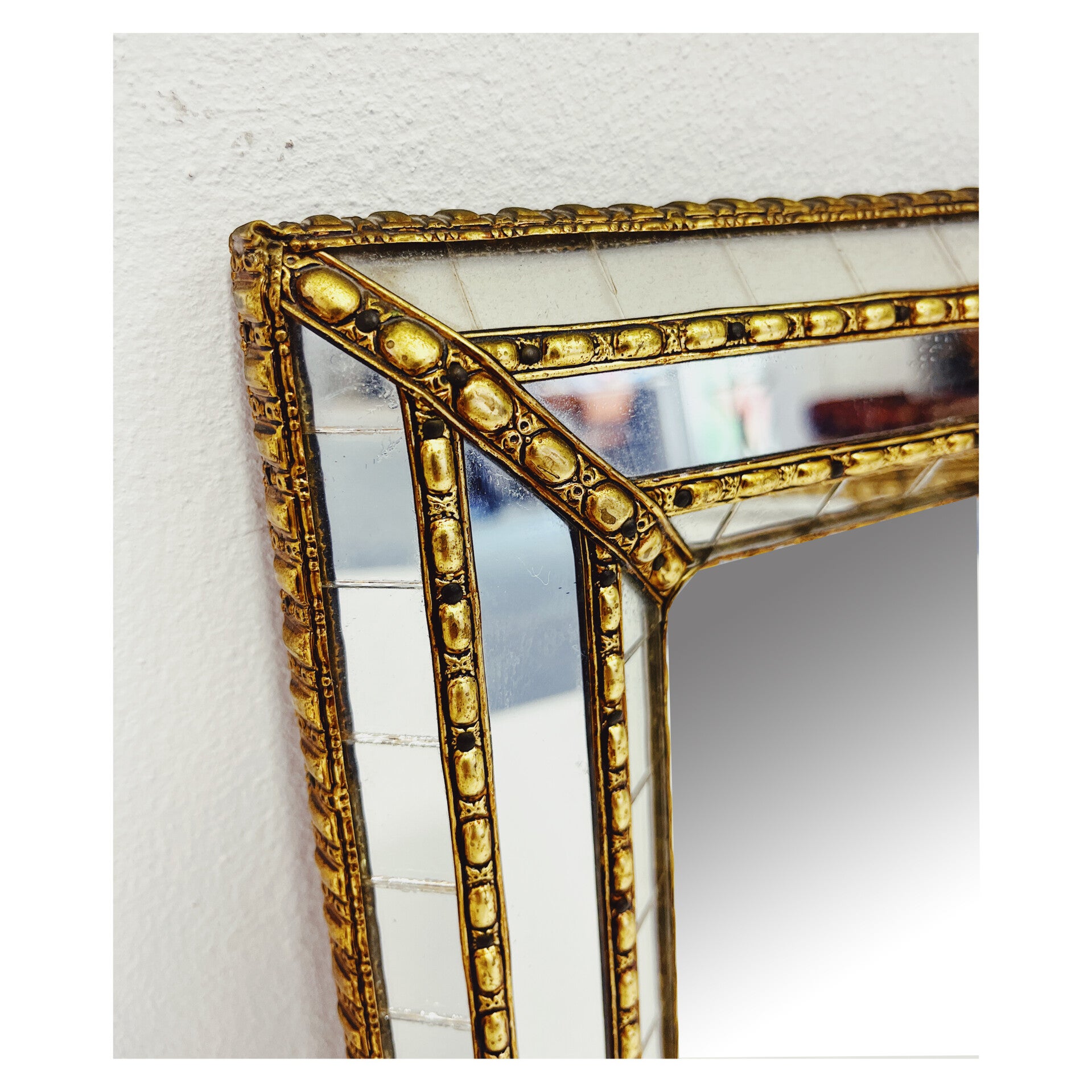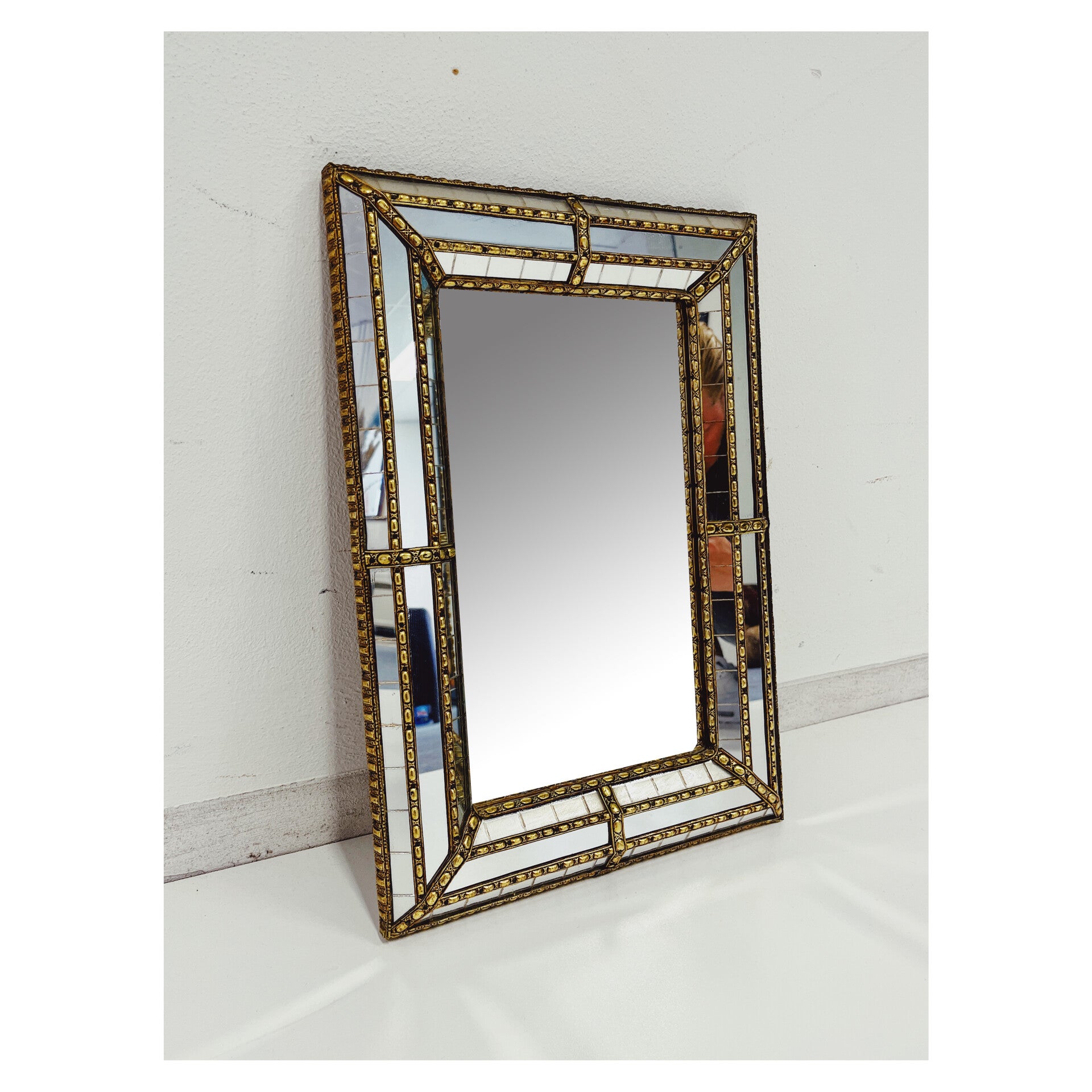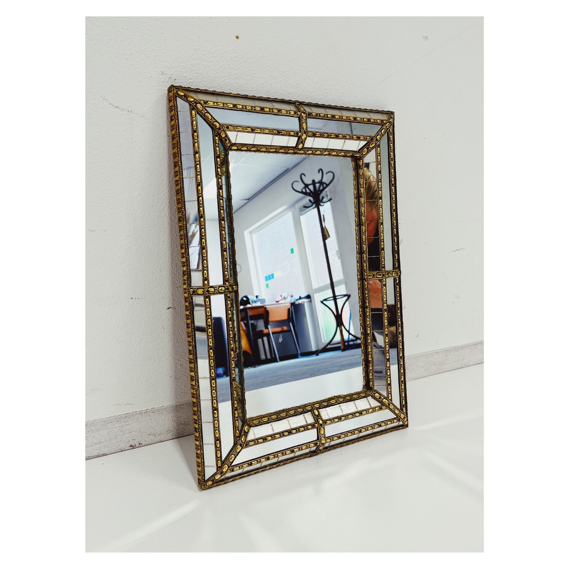 Deknudt design spiegel. Deze kleine spiegel is wel een heel bijzonder exemplaar! De spiegel heeft prachtige facet geslepen details in de randen en wordt afgewerkt met gouden messing details. DeKnudt was een grote spiegel fabrikant vanaf de jaren 70 tot heden. Dit spiegel wat gebruikssporen passend bij de leeftijd en heeft een stevig ophang systeem.