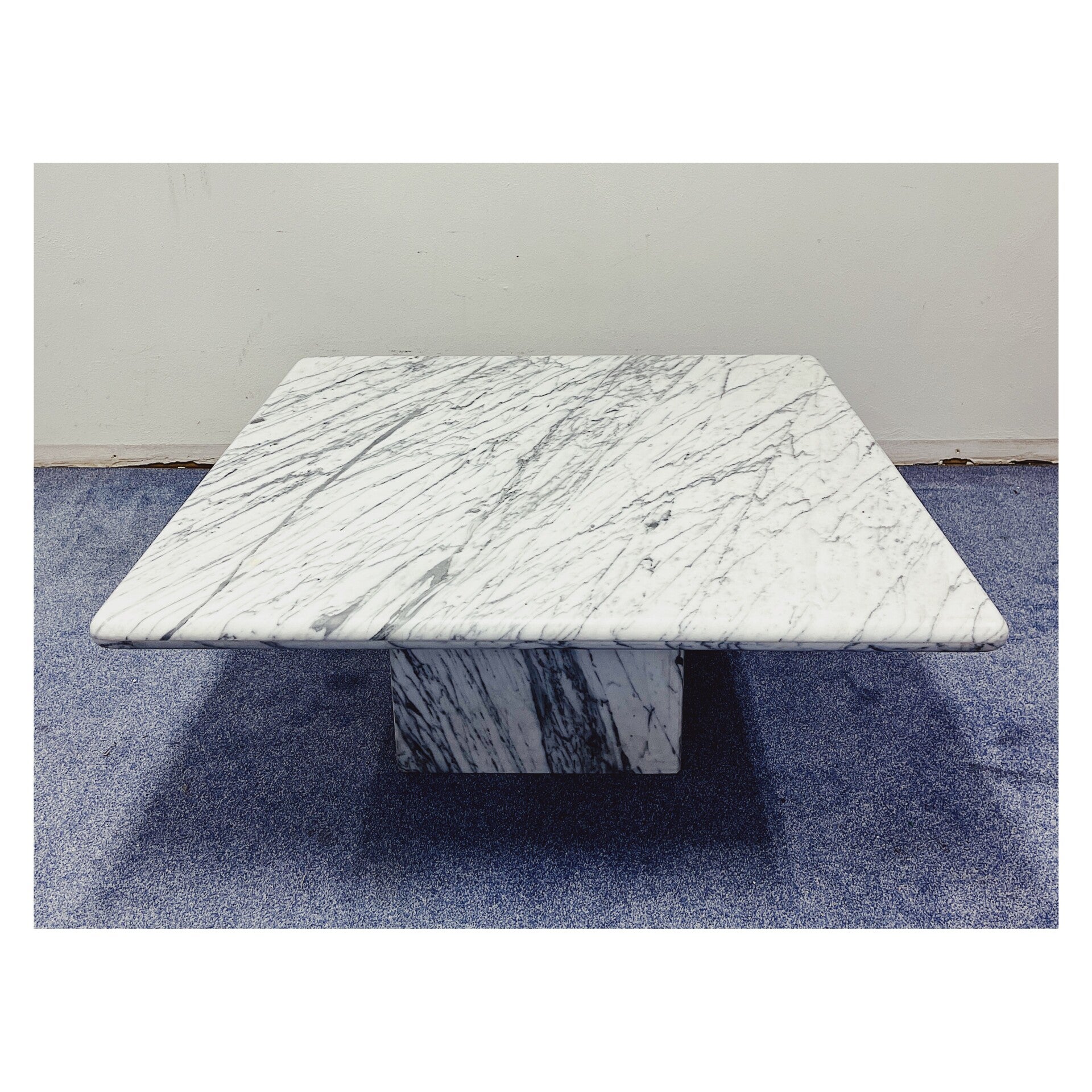 Deze oogverblindende salontafel is vervaardigd uit wit geaderd marmer. Deze natuurstenen tafel past perfect in een chique interieur. Het bovenblad en de voet zijn los van elkaar te vervoeren. Let op deze tafel is zeer zwaar maar dus ook van zeer goede kwaliteit. De tafel is in goede vintage conditie met hier en daar wat gebruikssporen.