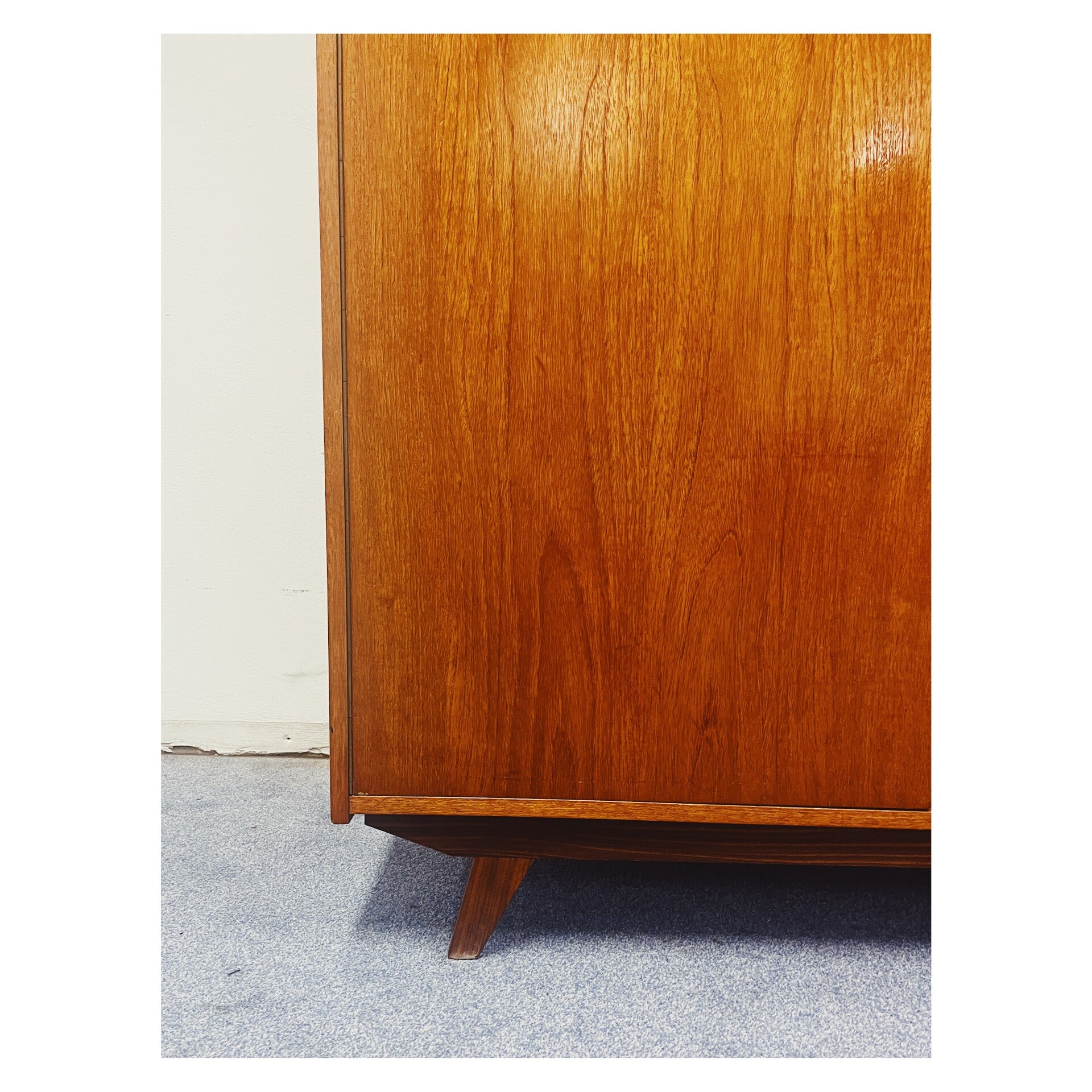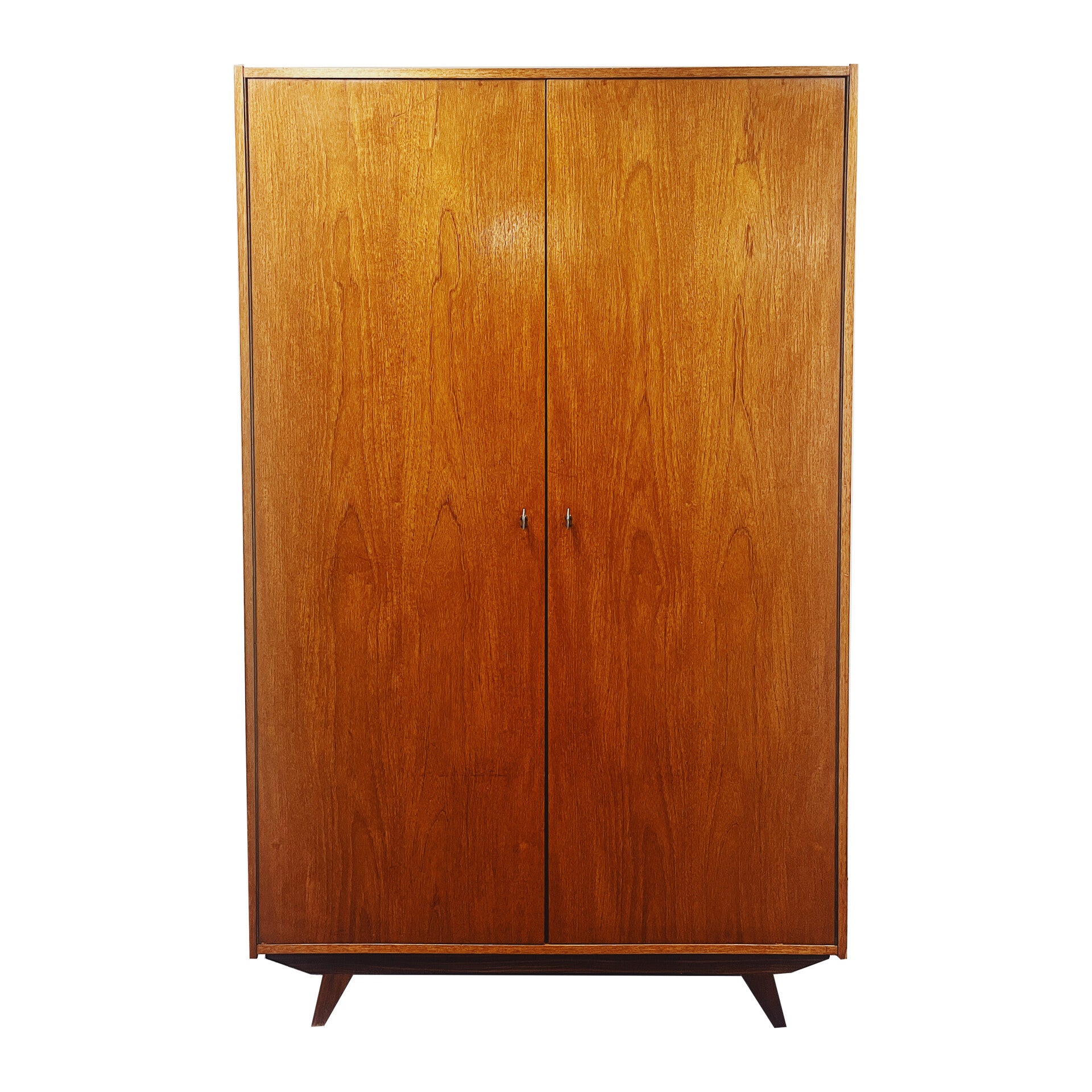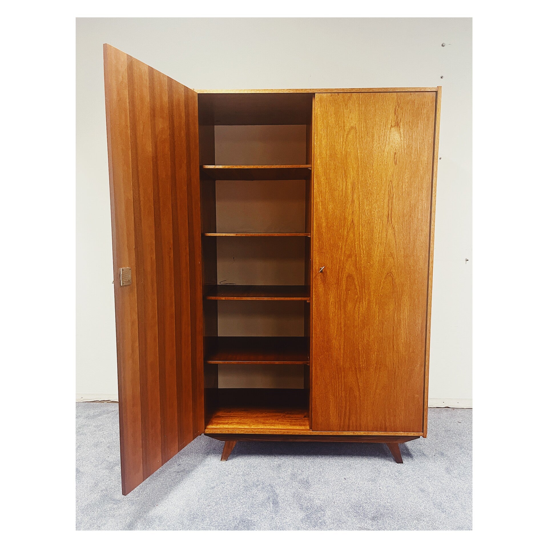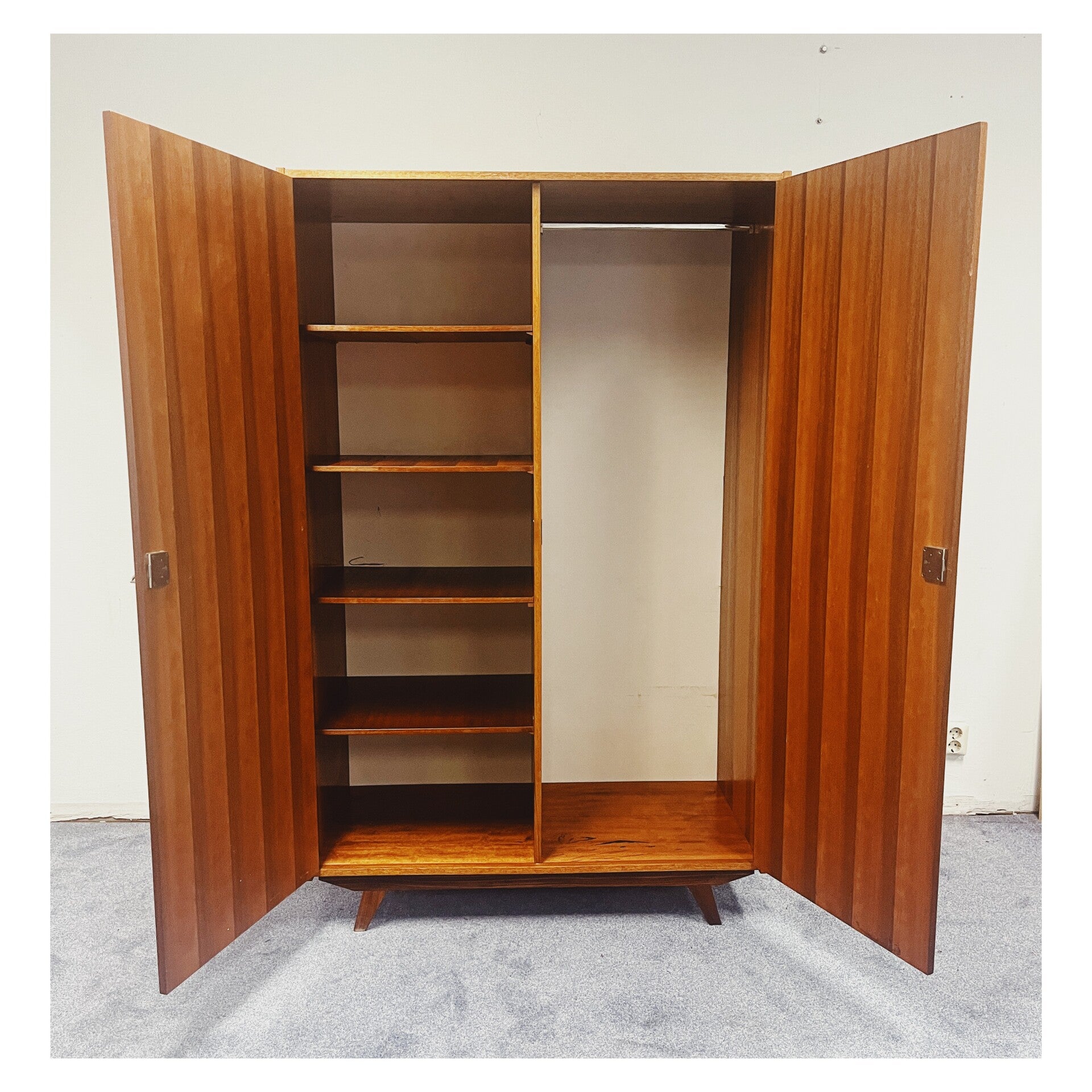 Vintage 60's kledingkast. De kast bezit een hanggedeelte aan de linkerzijde en heeft aan de rechterzijde vier opbergvakken met legplanken. De kast kan worden afgesloten met een bijbehorende sleutel. De kast is in goede vintage conditie met hier en daar wat gebruikssporen.