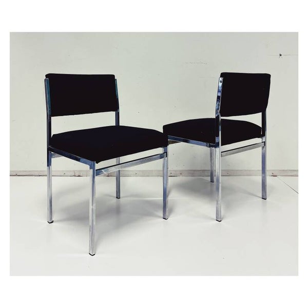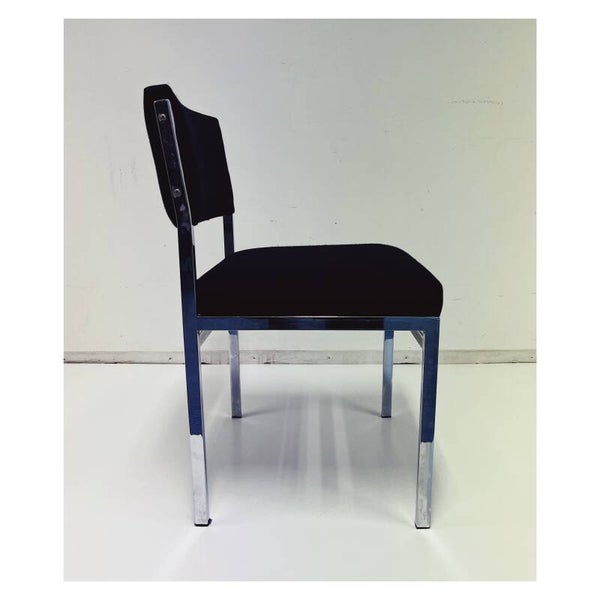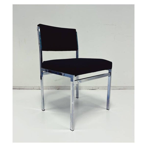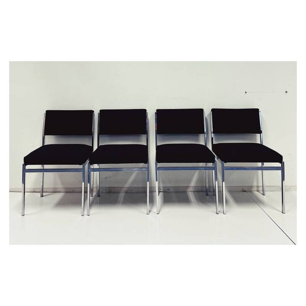 Vintage industriële eetkamerstoelen set van vier. De stoelen hebben een rug- en zitvlak van zwart stof en een chromen onderstel. De stoelen zijn in goede staat met wat gebruikssporen naar leeftijd en zitten heerlijk.