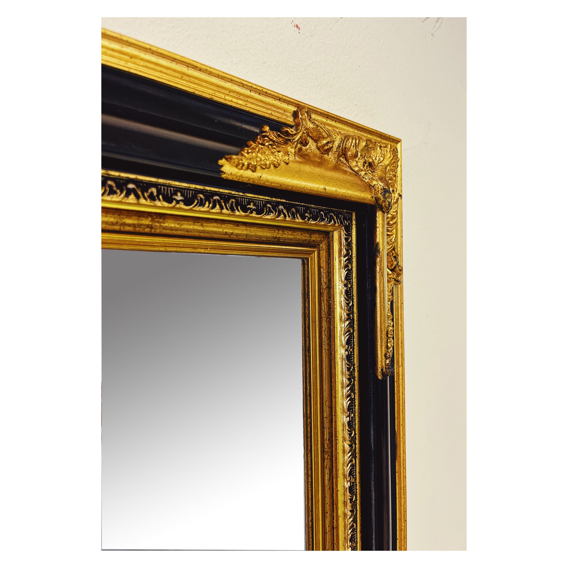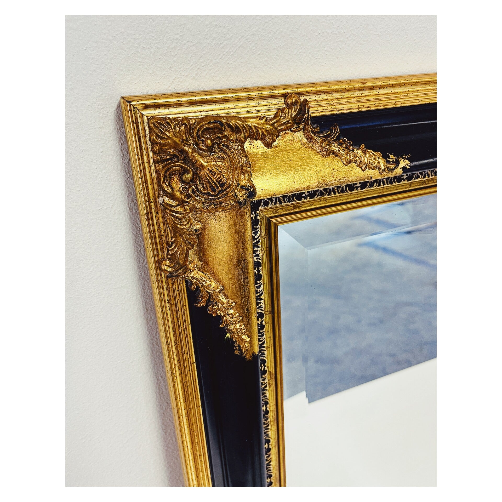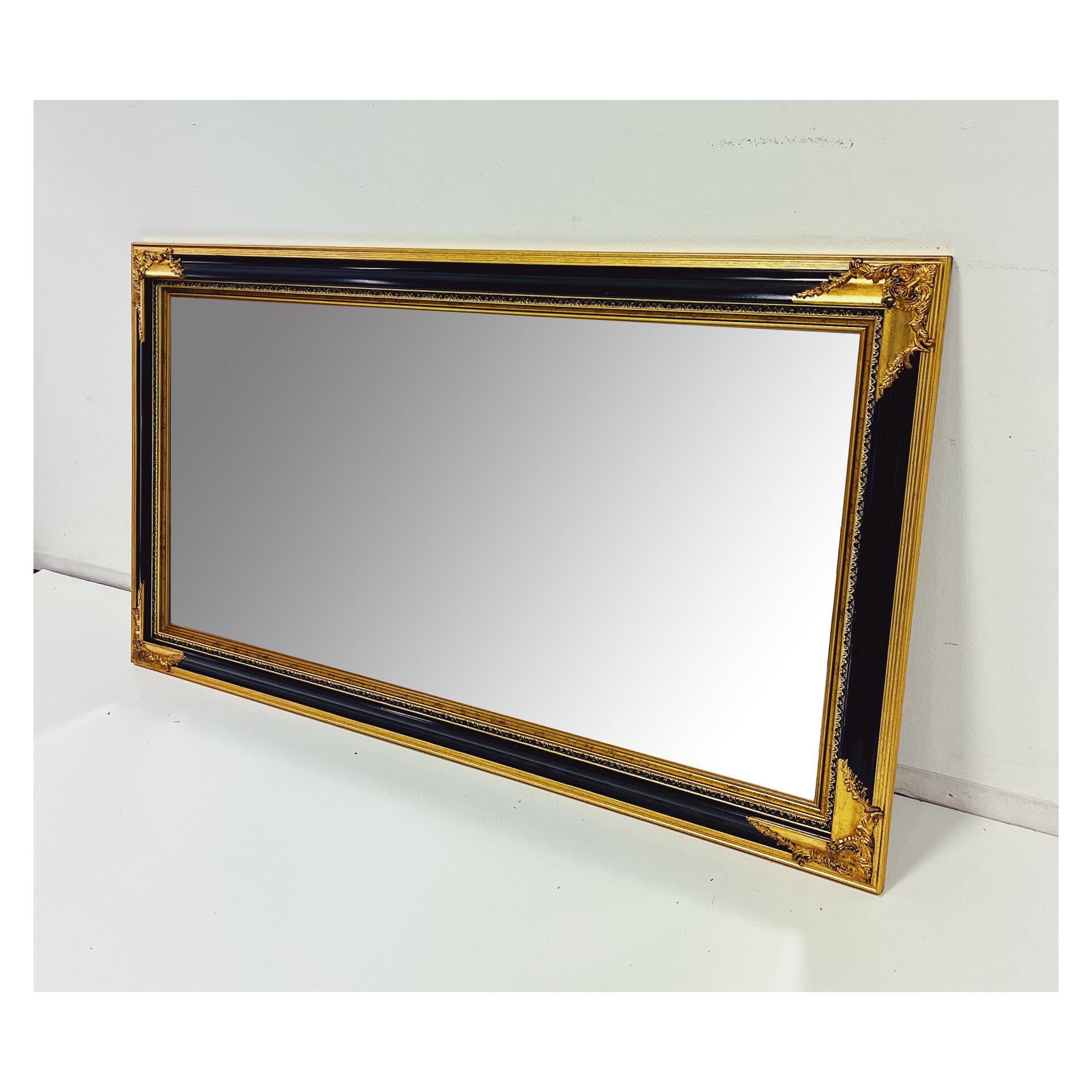 Klassieke spiegel met decoratief houten frame. De rechthoekige spiegel heeft een sierlijke uit hout gesneden lijst in de kleuren zwart en goud. De spiegel is in top staat en kan zowel horizontaal als verticaal worden opgehangen.