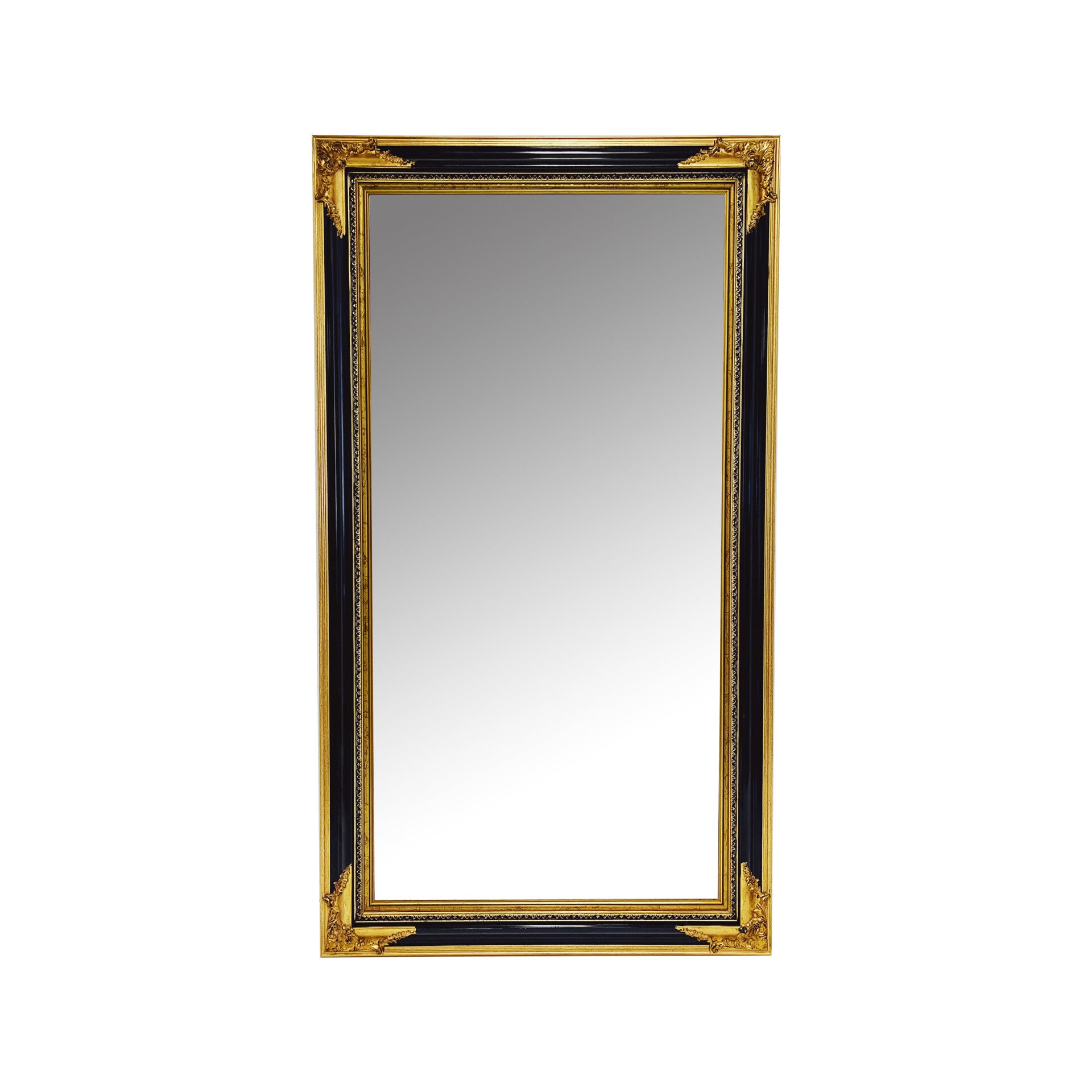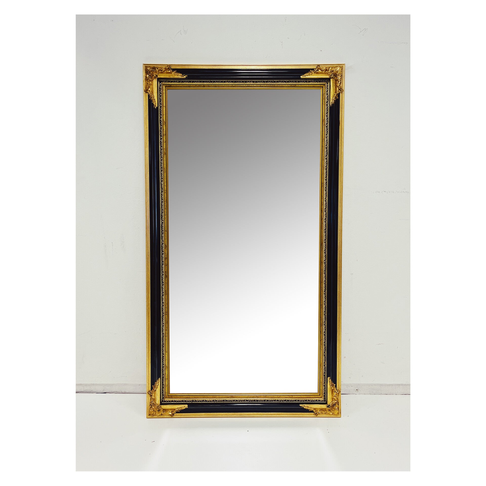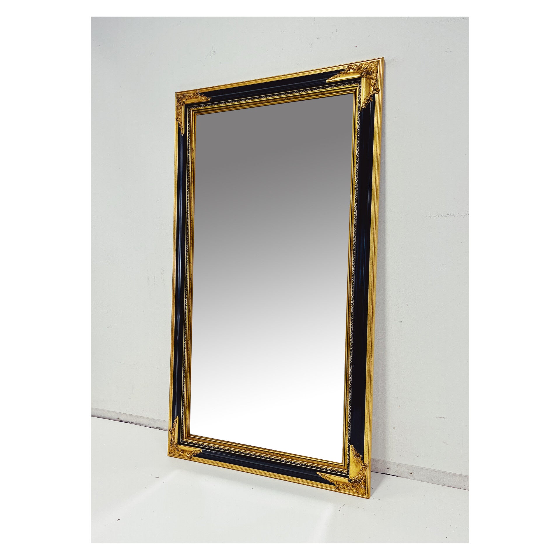 Klassieke spiegel met decoratief houten frame. De rechthoekige spiegel heeft een sierlijke uit hout gesneden lijst in de kleuren zwart en goud. De spiegel is in top staat en kan zowel horizontaal als verticaal worden opgehangen.