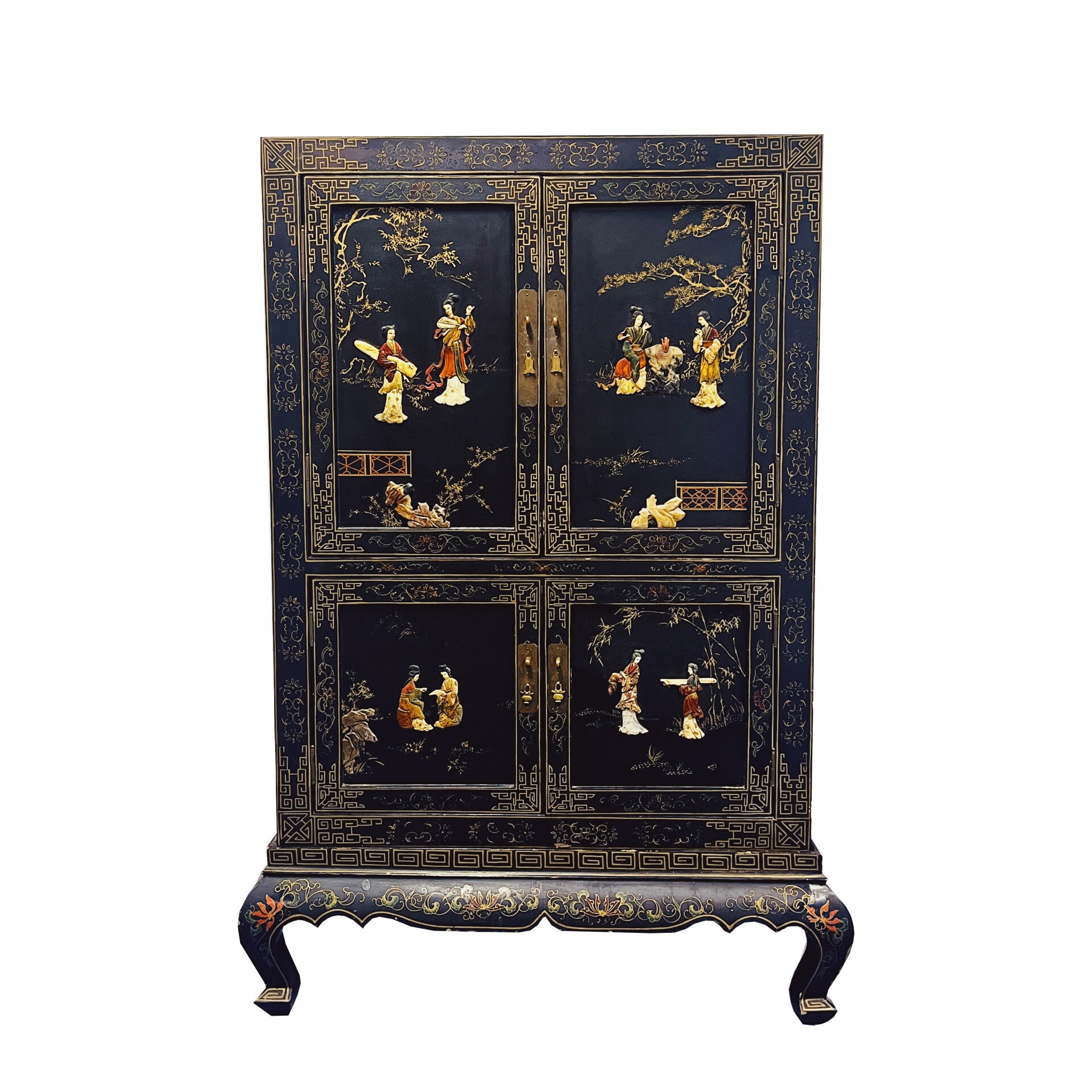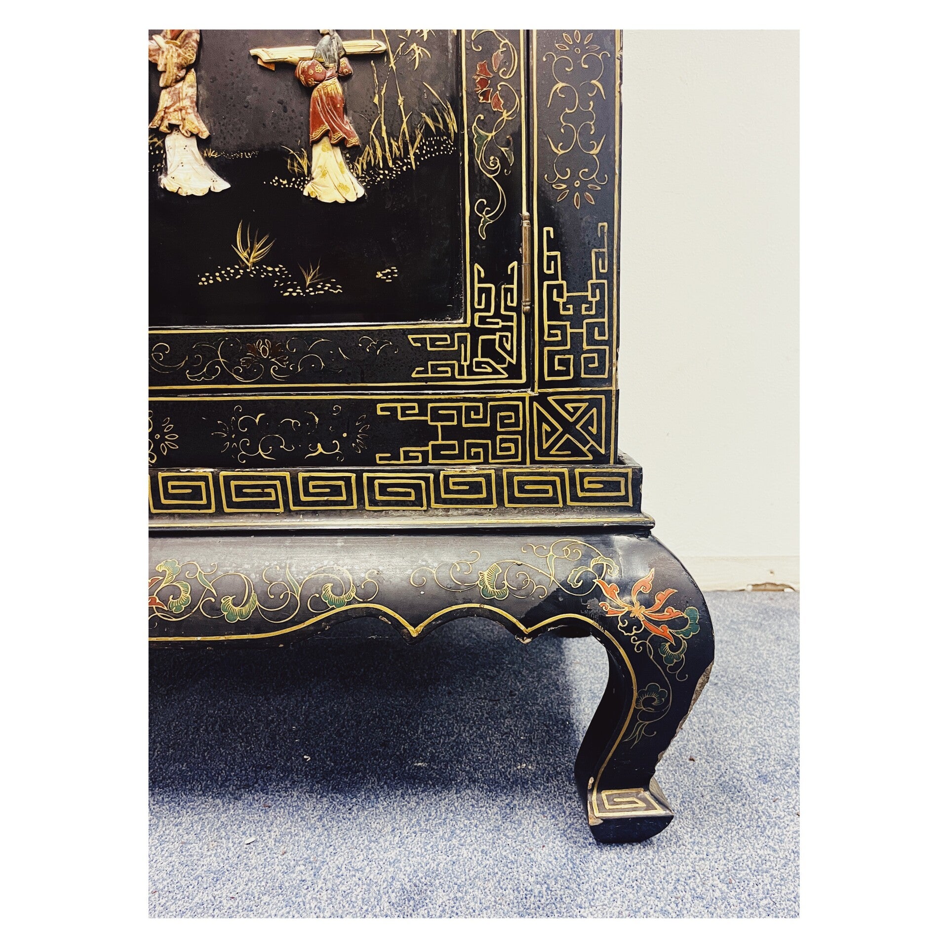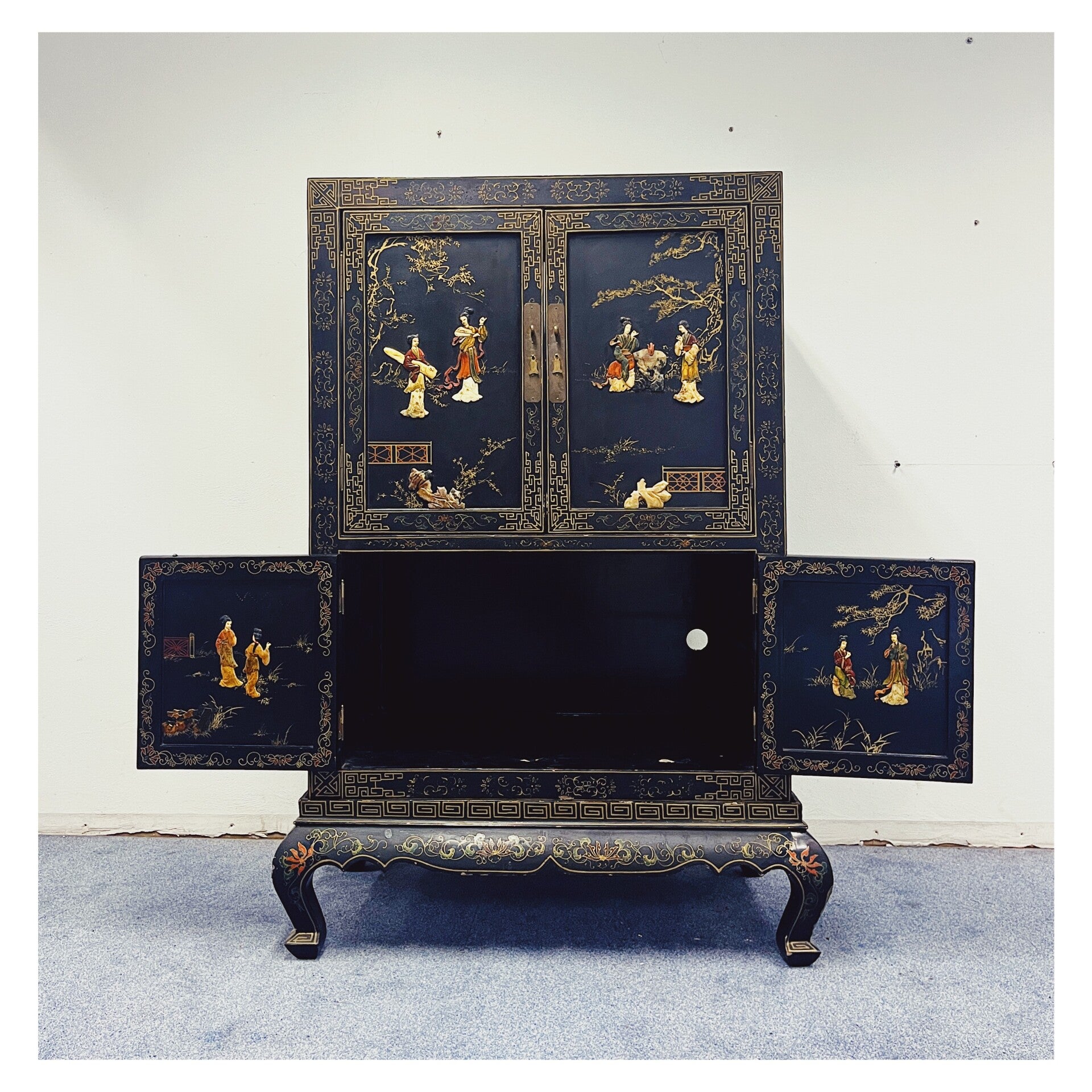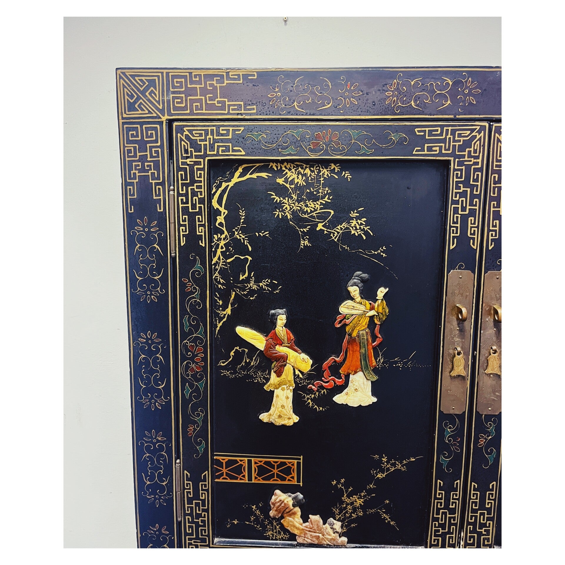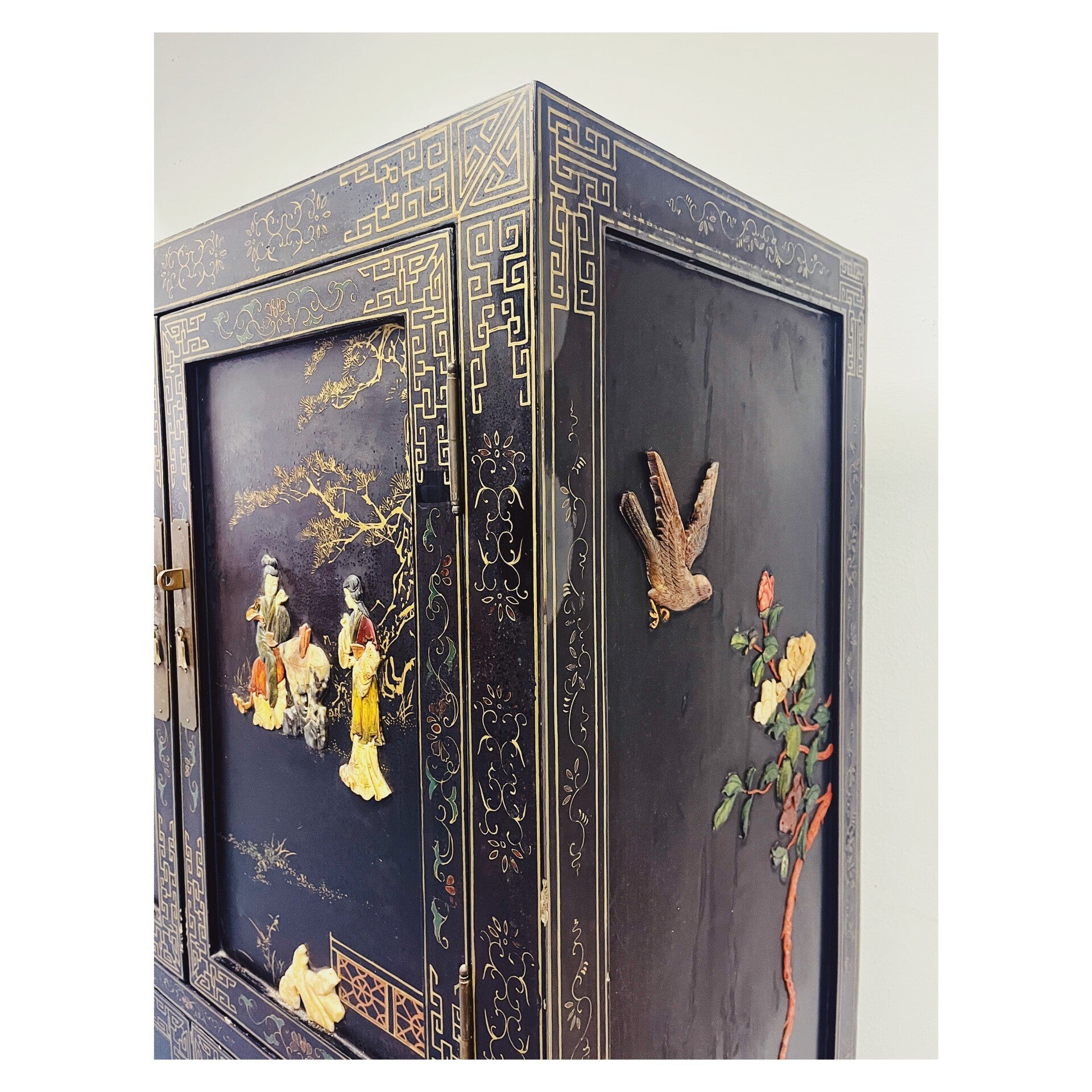 Schitterende Chinese kast. De kast heeft verschillende schilderingen en daarnaast ook decoraties ingelegd met speksteen!