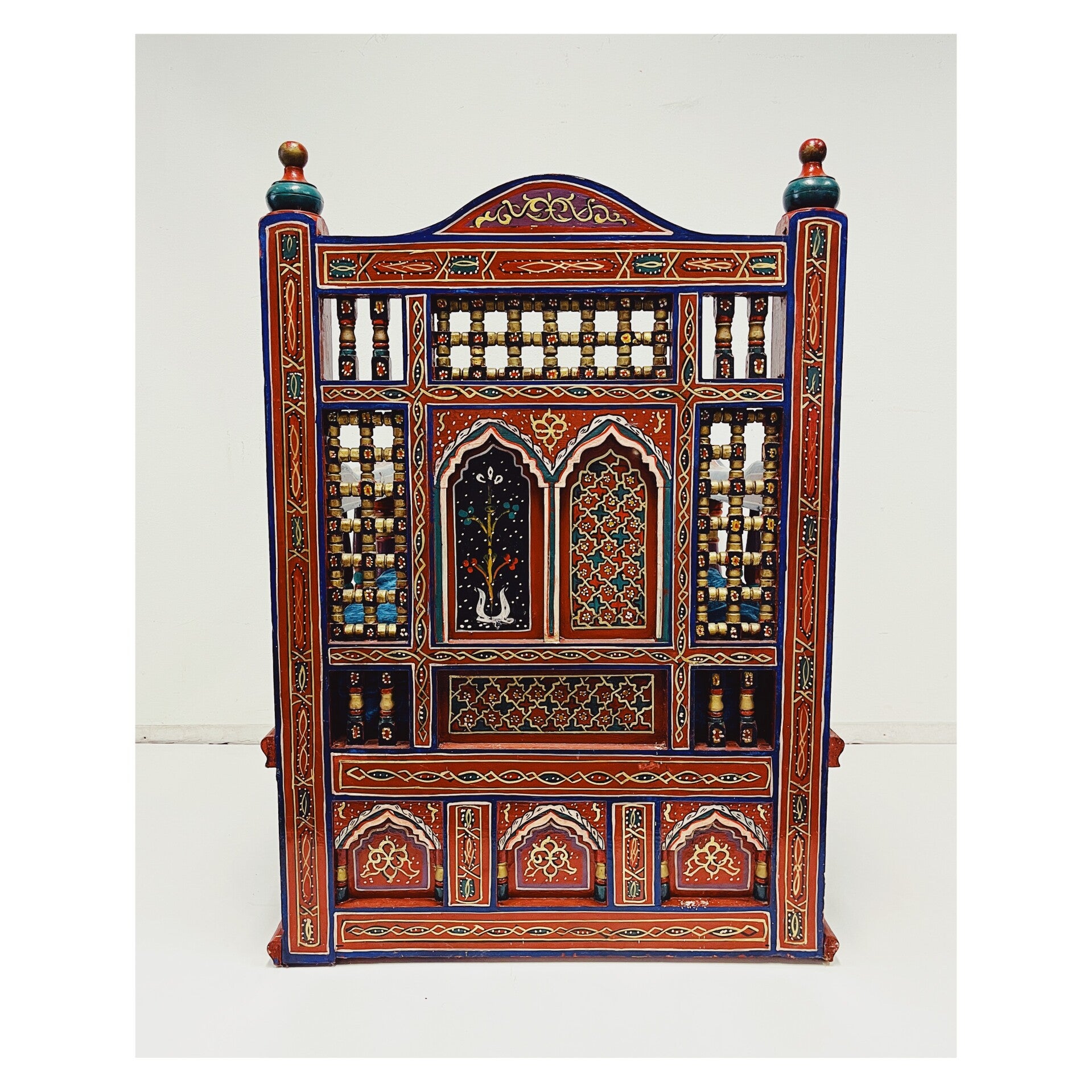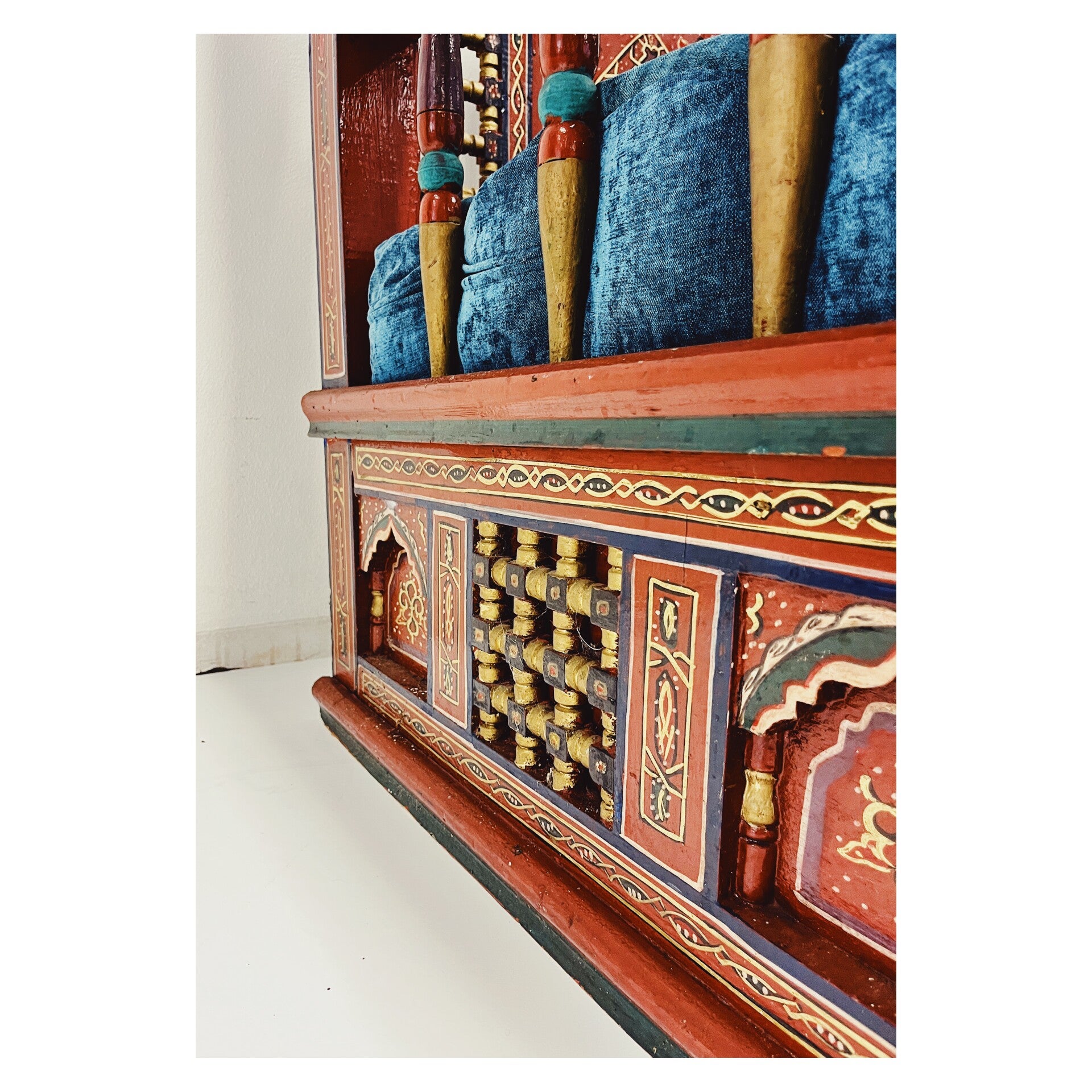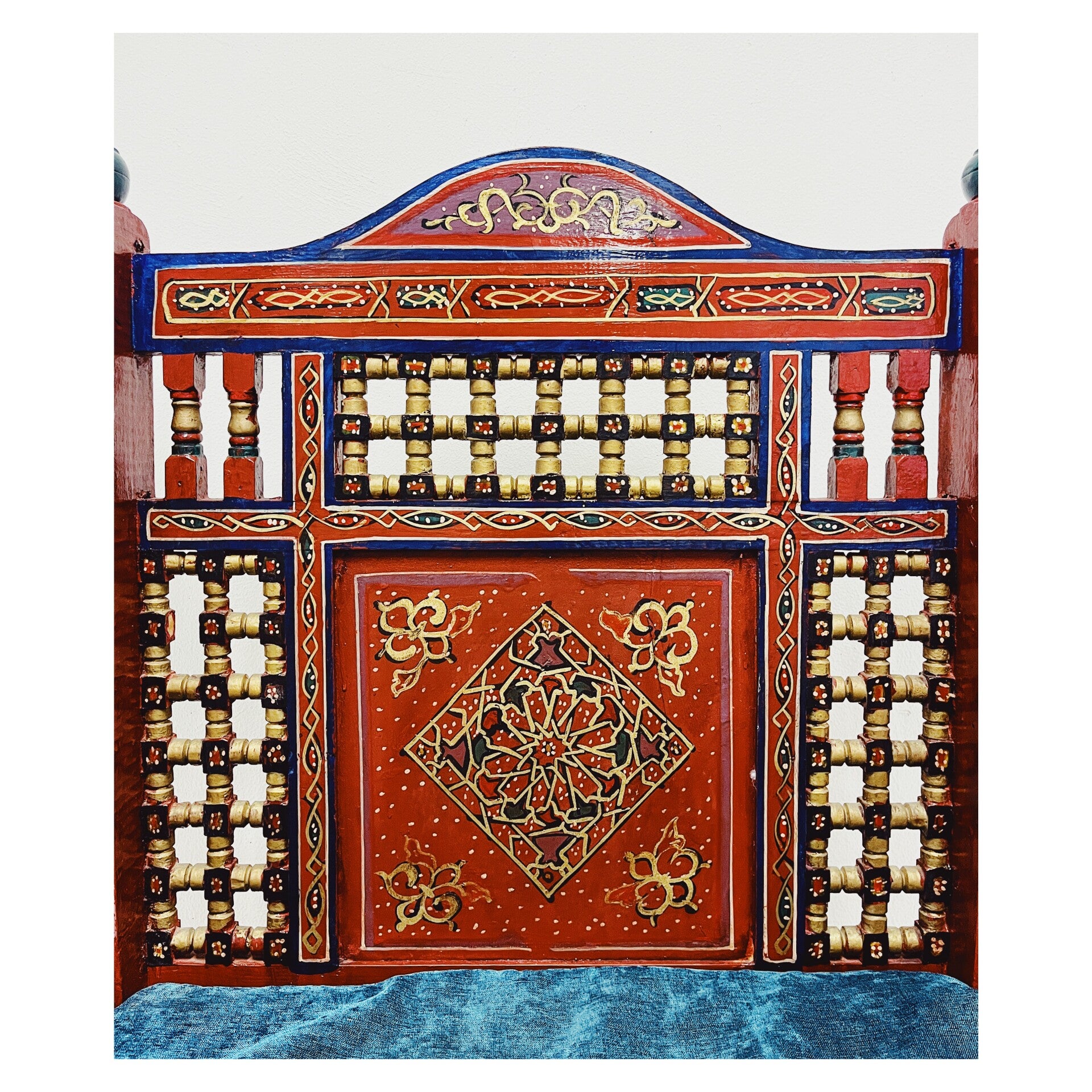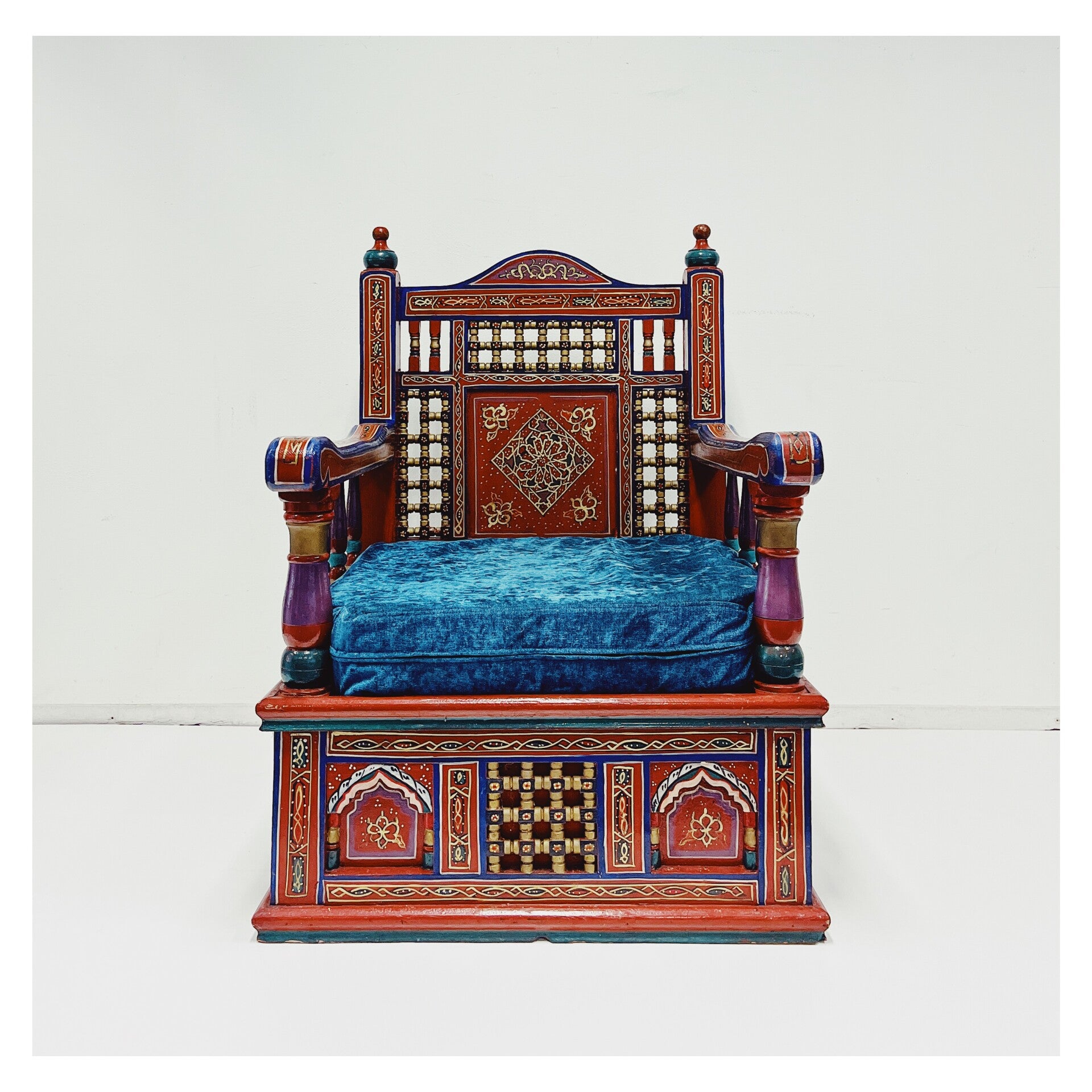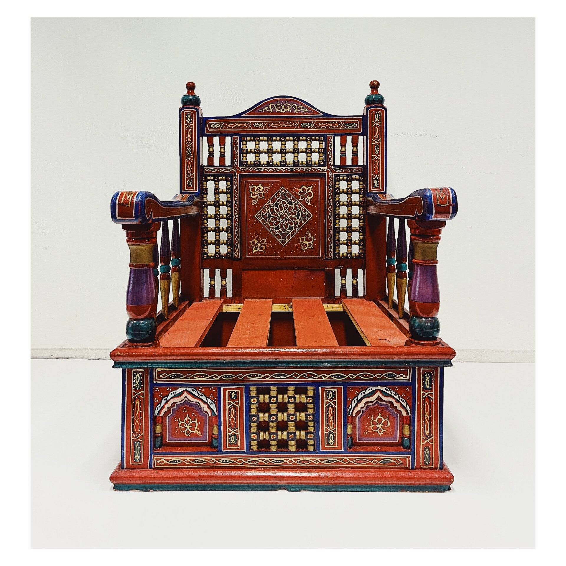Marokkaanse stoel met bijpassend kussen. Dit marokkaanse meubel is geheel met de hand gemaakt volgens zeer oude traditie. Het beschilderen van dit meubel is een zeer tijdrovende klus gelet op de soms zeer gedetailleerde motieven. De stoel is in hele goede conditie en een waanzinnige aanwinst voor je interieur!