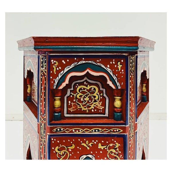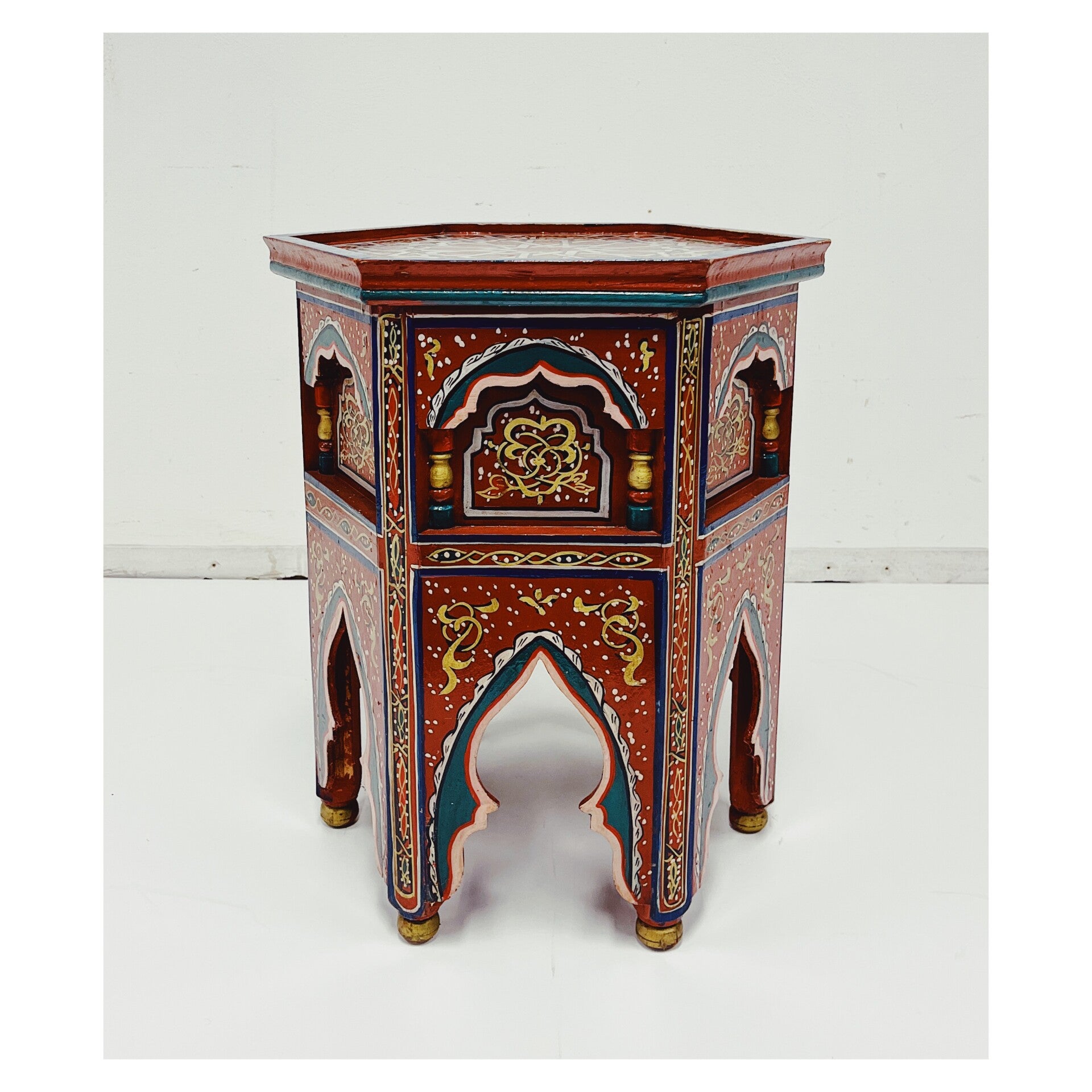 Marokkaans bijzettafeltje. Dit marokkaanse meubel is geheel met de hand gemaakt volgens zeer oude traditie. Het beschilderen van dit meubel is een zeer tijdrovende klus gelet op de soms zeer gedetailleerde motieven. De bijzettafel is in hele goede conditie en een waanzinnige aanwinst voor je interieur!