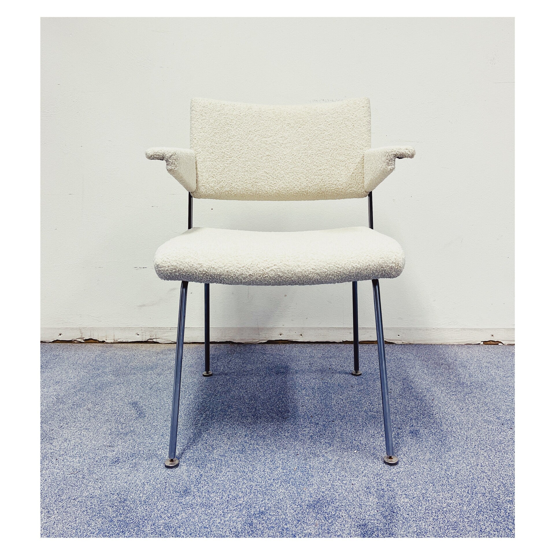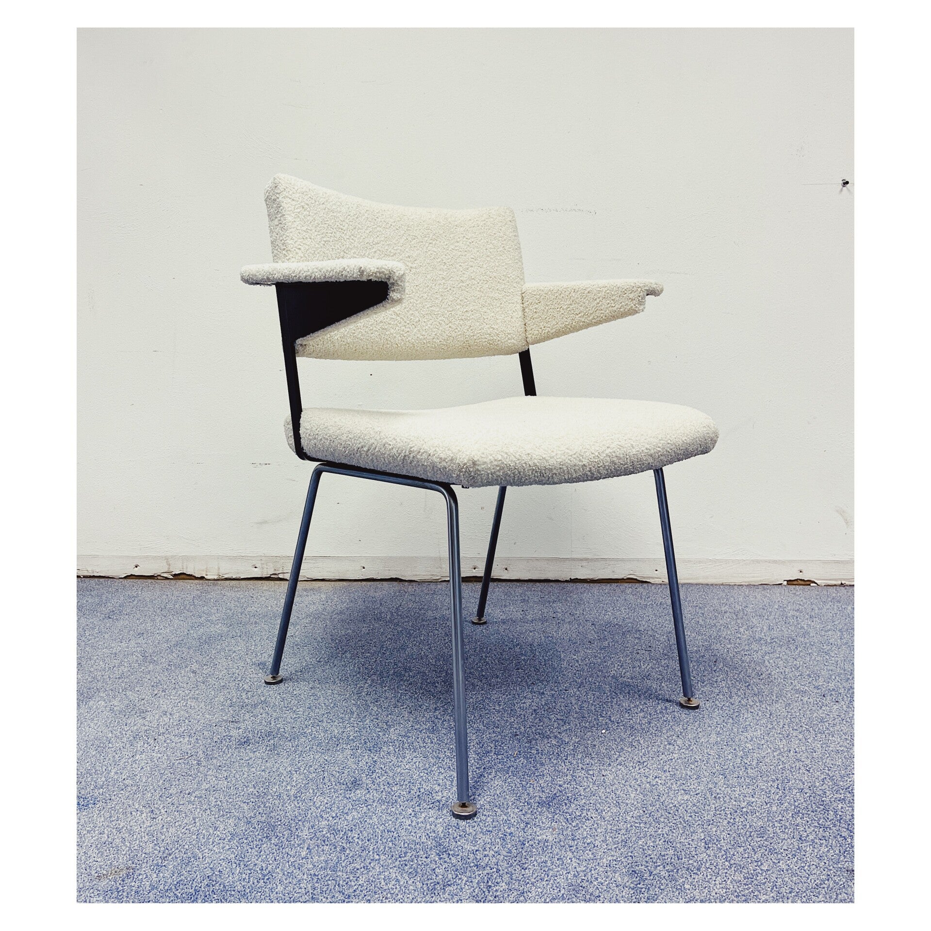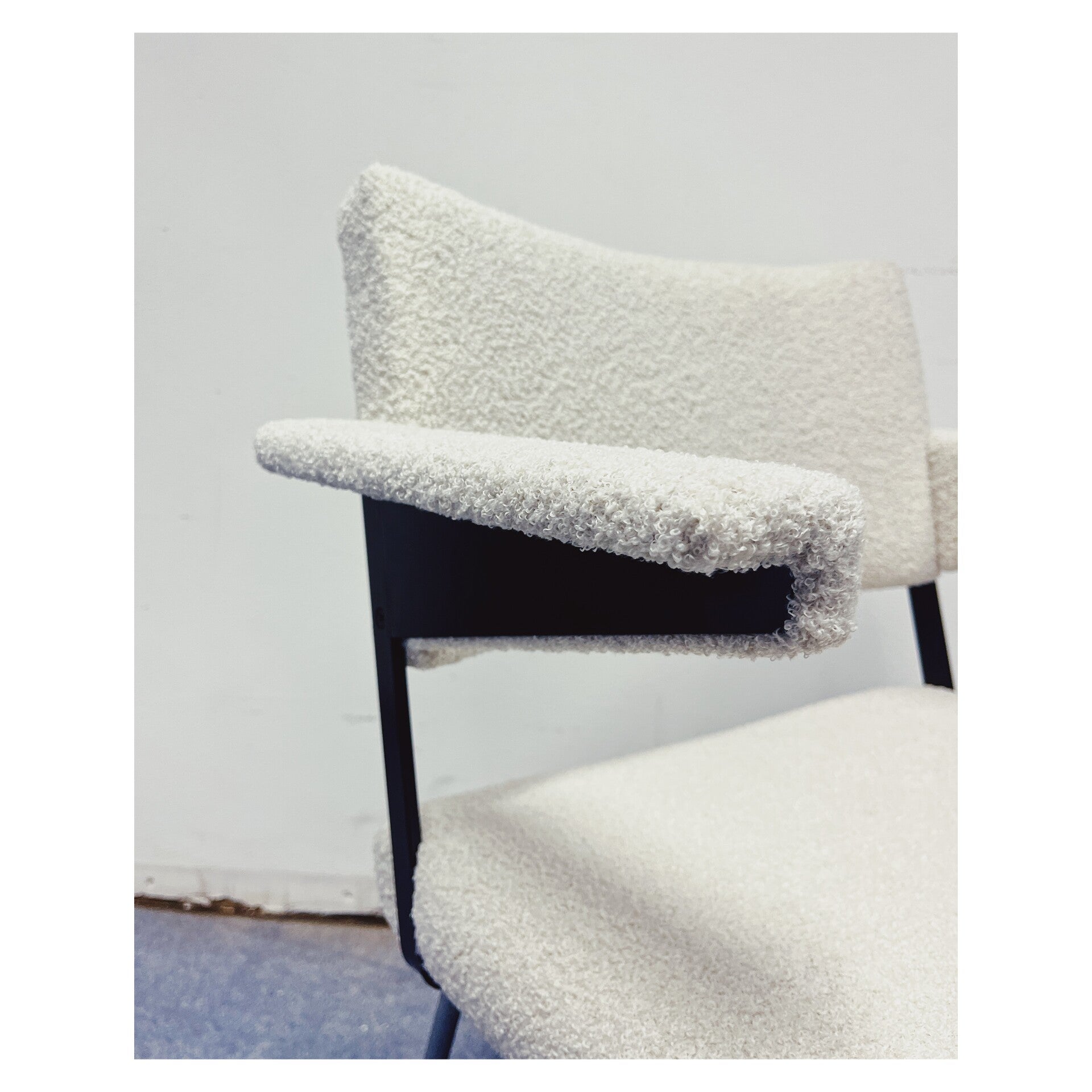 Vintage Point is met veel enthousiasme een samenwerking aangegaan met twee zeer getalenteerde meubelstoffeerders. Jacqueline en Brigitte hebben deze prachtige bouclé stoelen met vakwerk, aandacht en liefde geheel opnieuw gestoffeerd. De dinerstoelen zijn bekleed met een witte teddy stof en hebben een chromen onderstel. De onderzijde is gemerkt met "Gispen". De stoelen zijn in perfecte staat en worden per stuk verkocht!