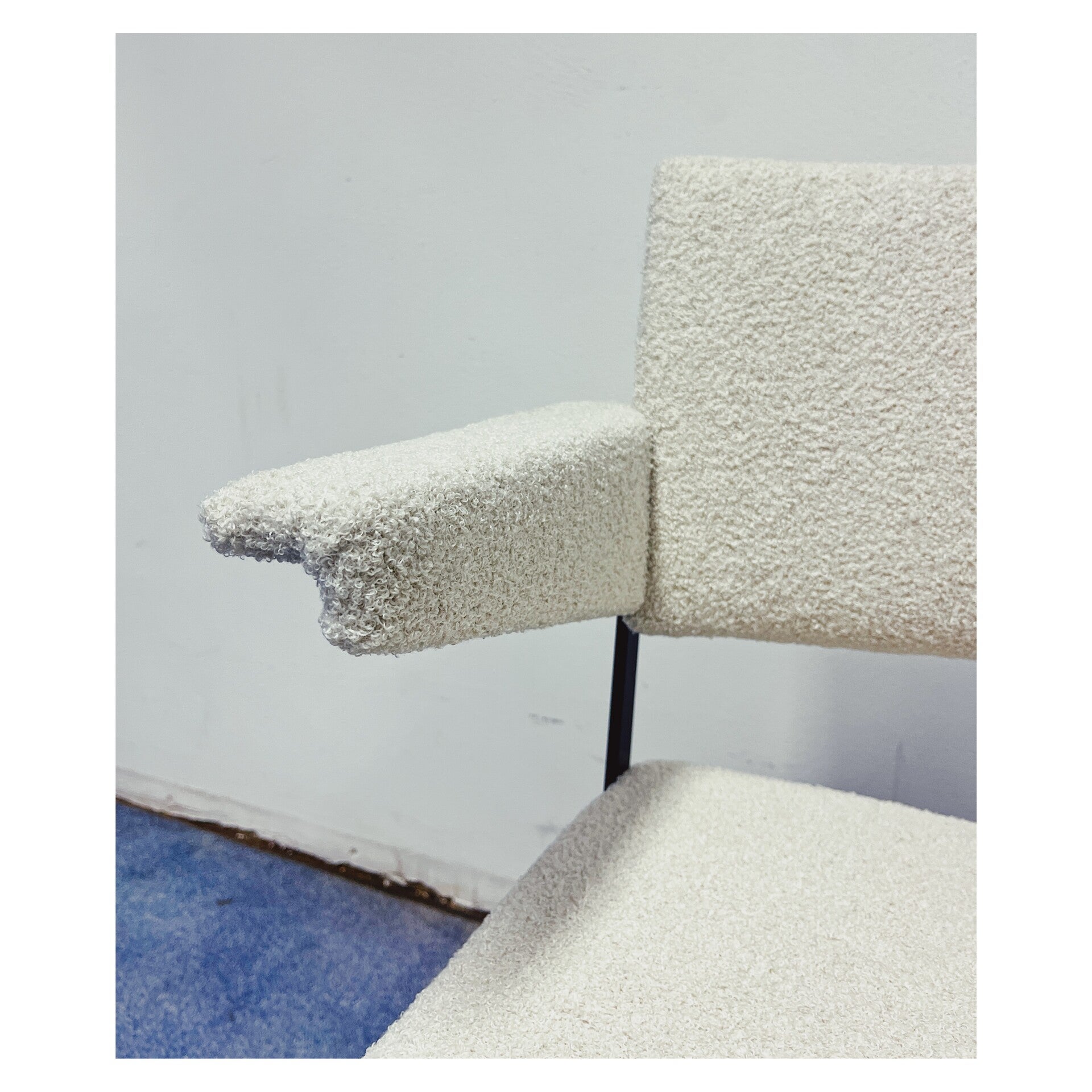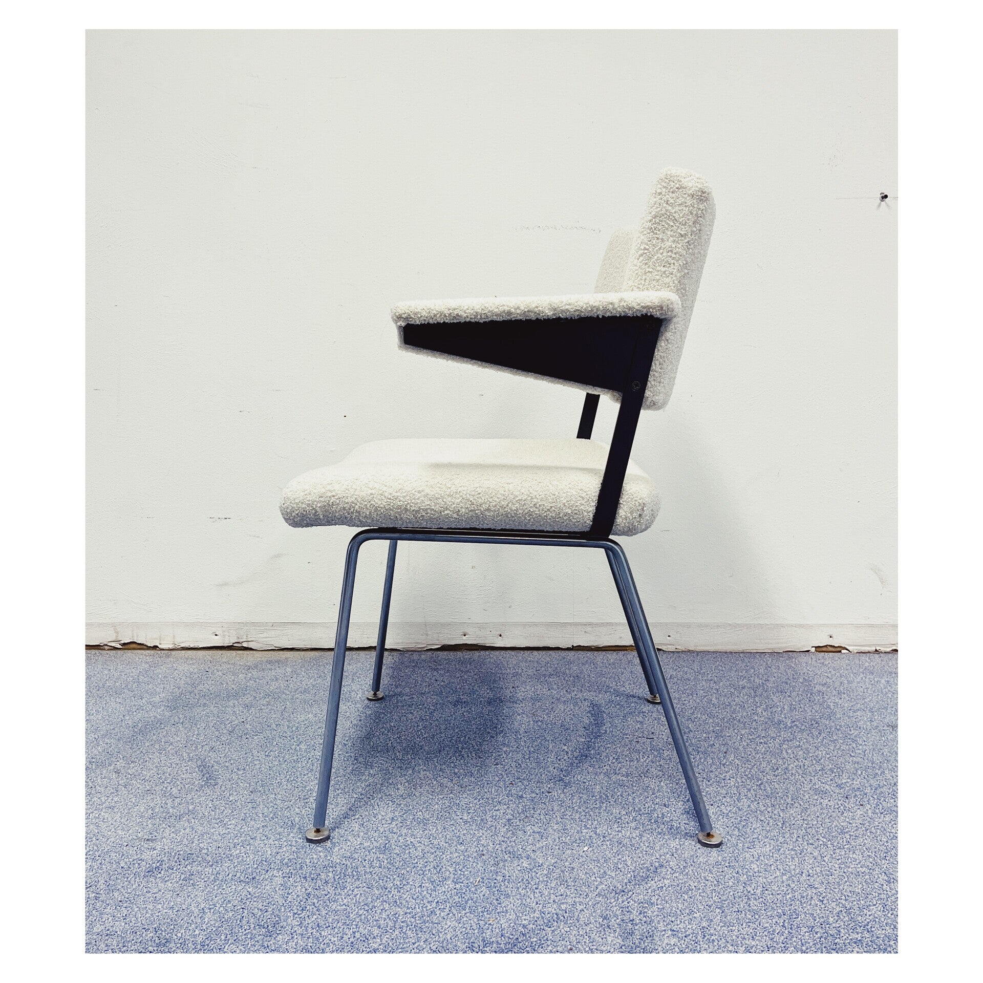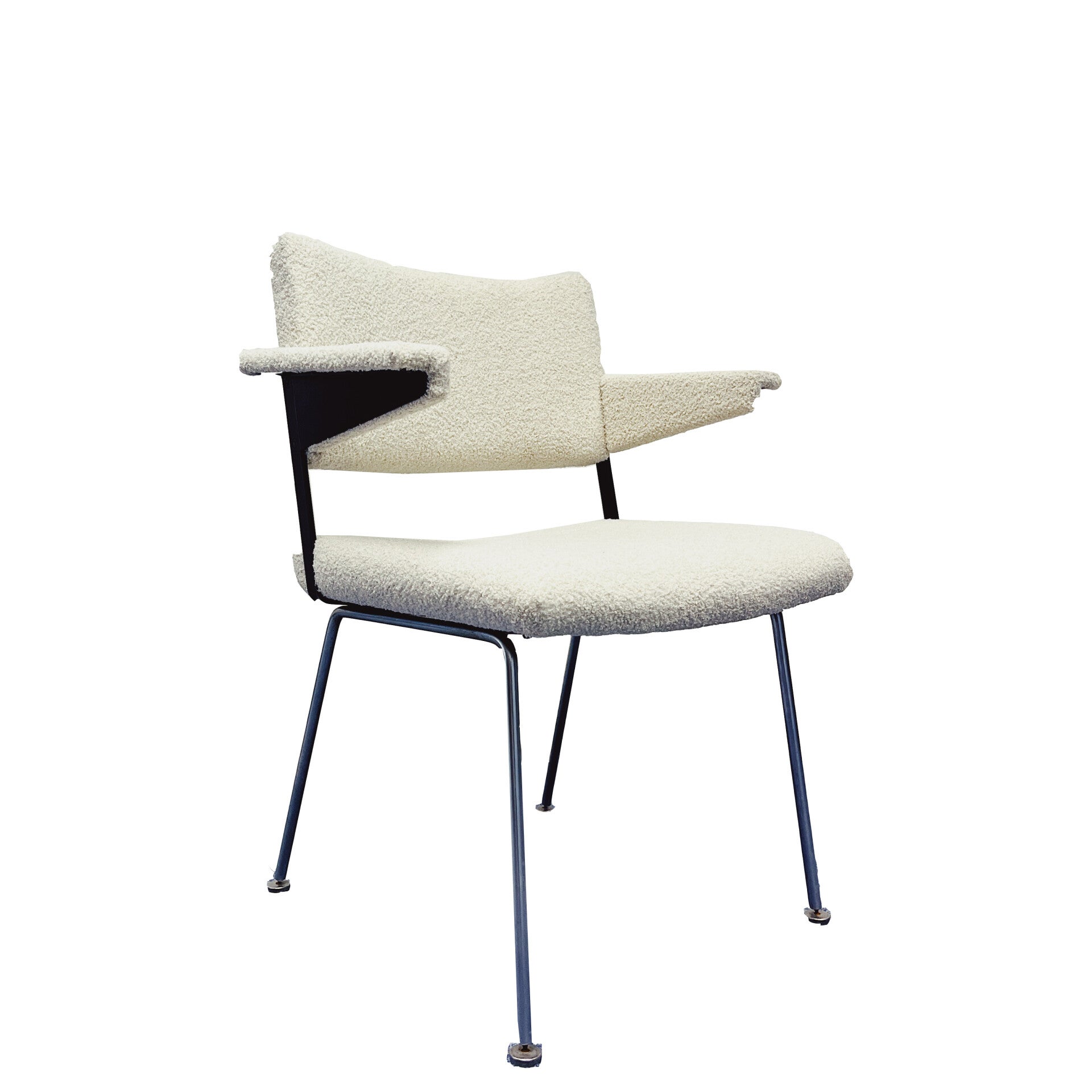 Vintage Point is met veel enthousiasme een samenwerking aangegaan met twee zeer getalenteerde meubelstoffeerders. Jacqueline en Brigitte hebben deze prachtige bouclé stoelen met vakwerk, aandacht en liefde geheel opnieuw gestoffeerd. De dinerstoelen zijn bekleed met een witte teddy stof en hebben een chromen onderstel. De onderzijde is gemerkt met "Gispen". De stoelen zijn in perfecte staat en worden per stuk verkocht!