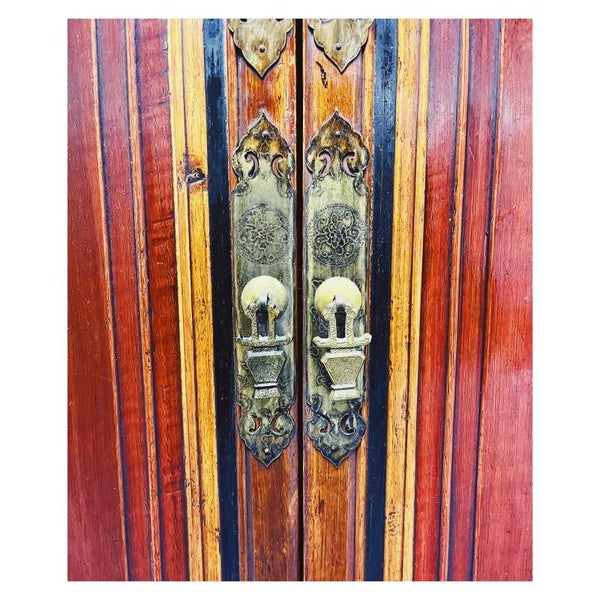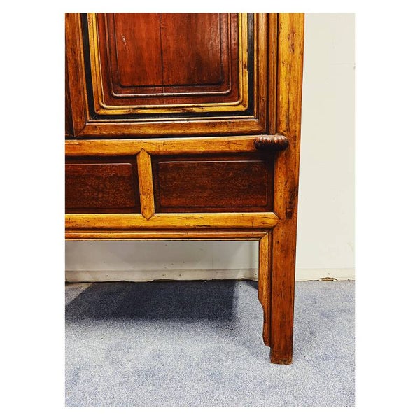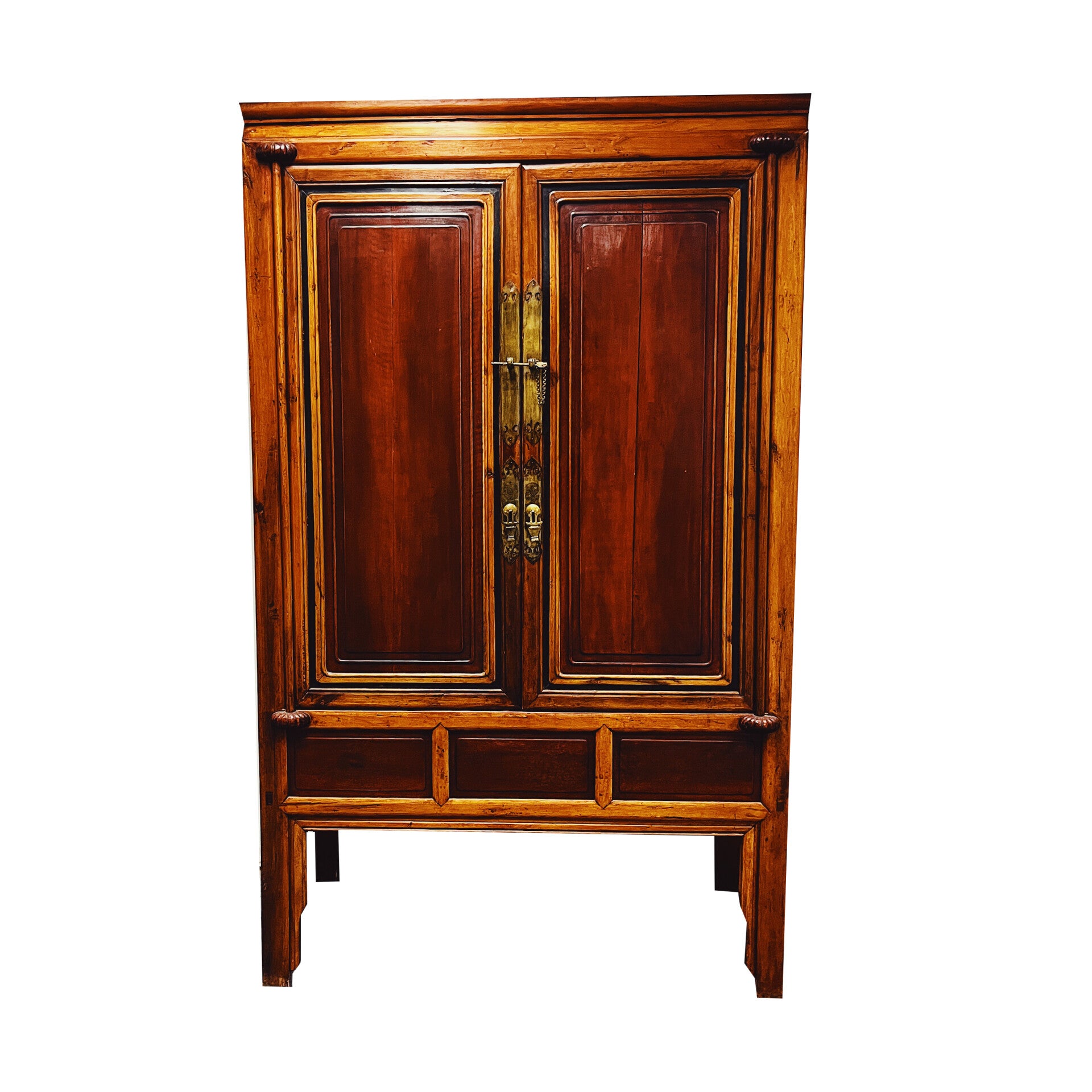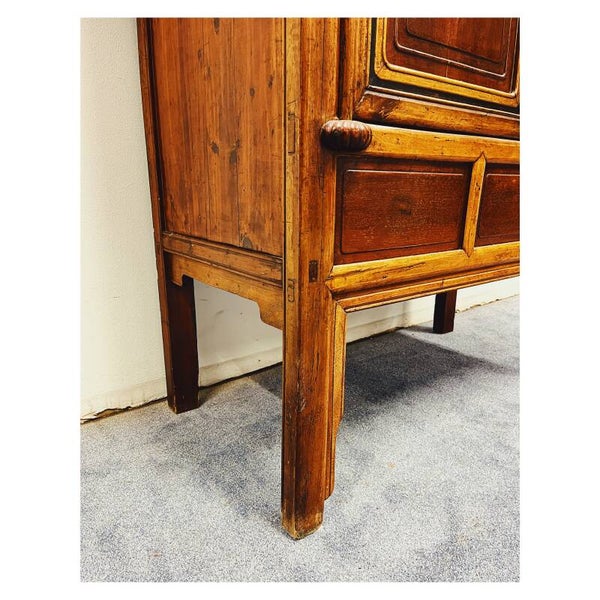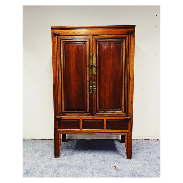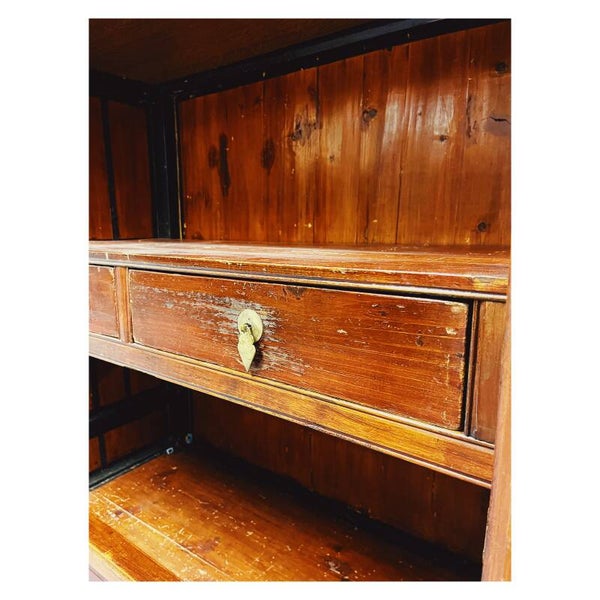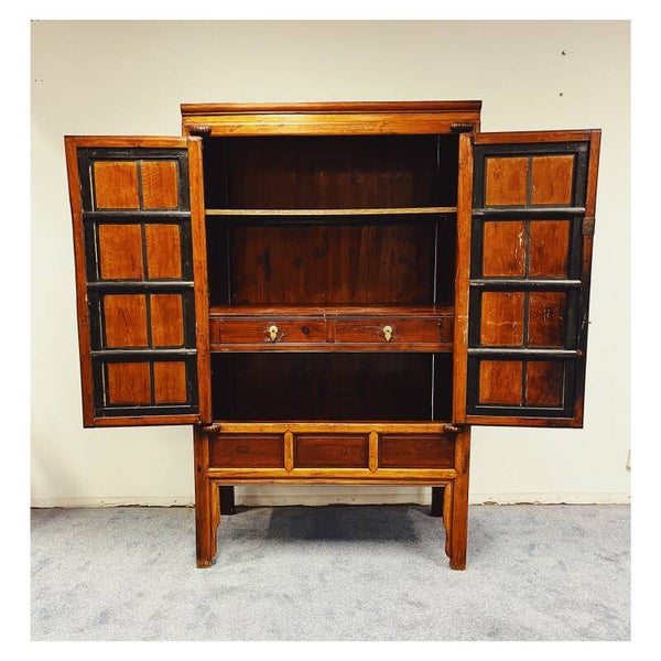 Antieke Chinese kast. De kast heeft twee deuren met traditioneel hang en sluitwerk. Aan de binnenkant van beide deuren bevind zich een plank voor het scheiden van spullen en nog twee extra laden.