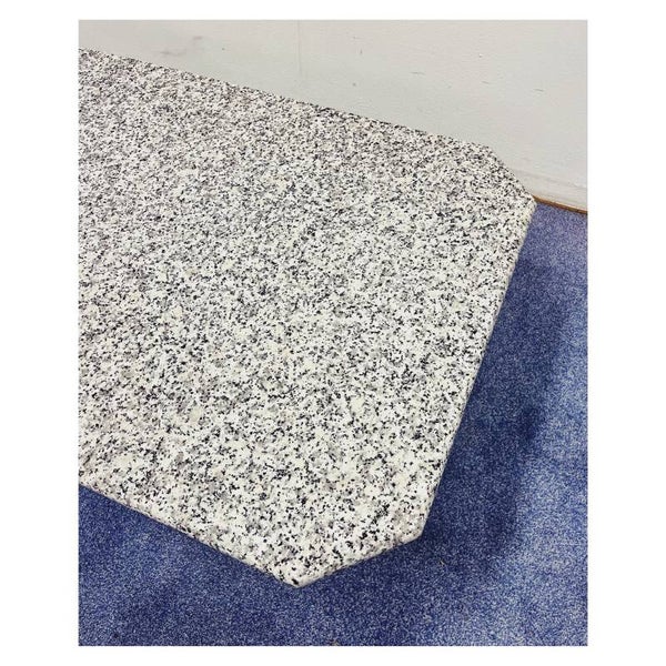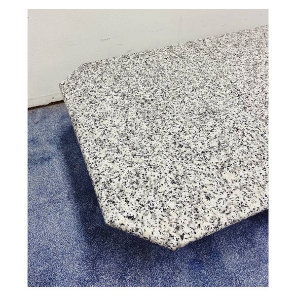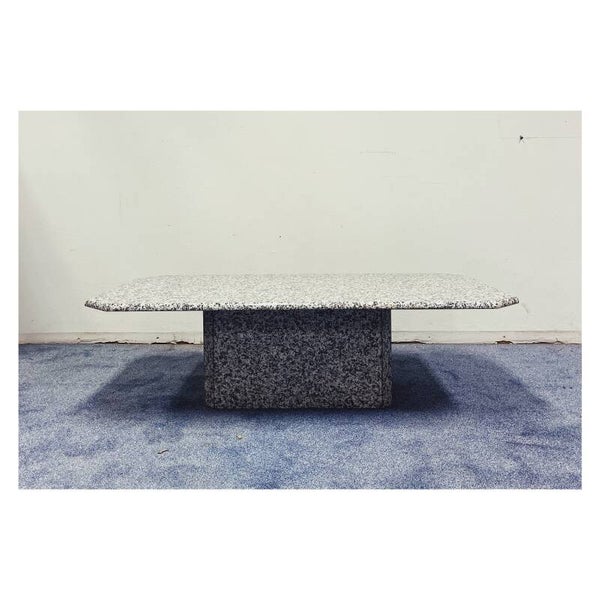 Salontafel gemaakt van het natuursteen graniet. Het tafelblad en het onderstel zijn los van elkaar. De tafel heeft een leuke spikkelvorm op het blad, wat kenmerkend is voor graniet. De salontafel verkeerd in een hele goede staat.