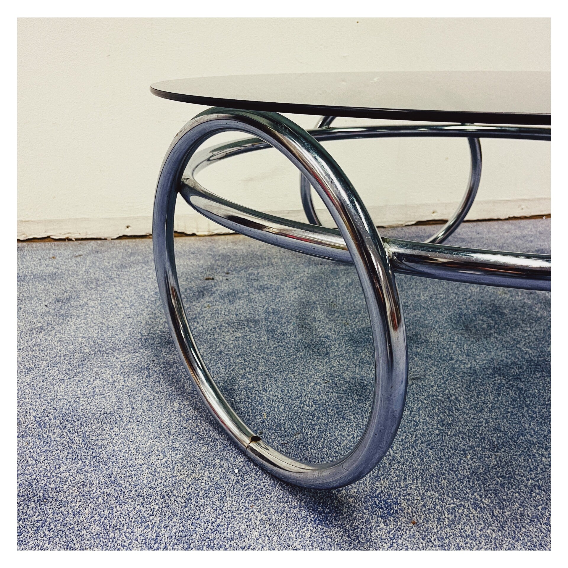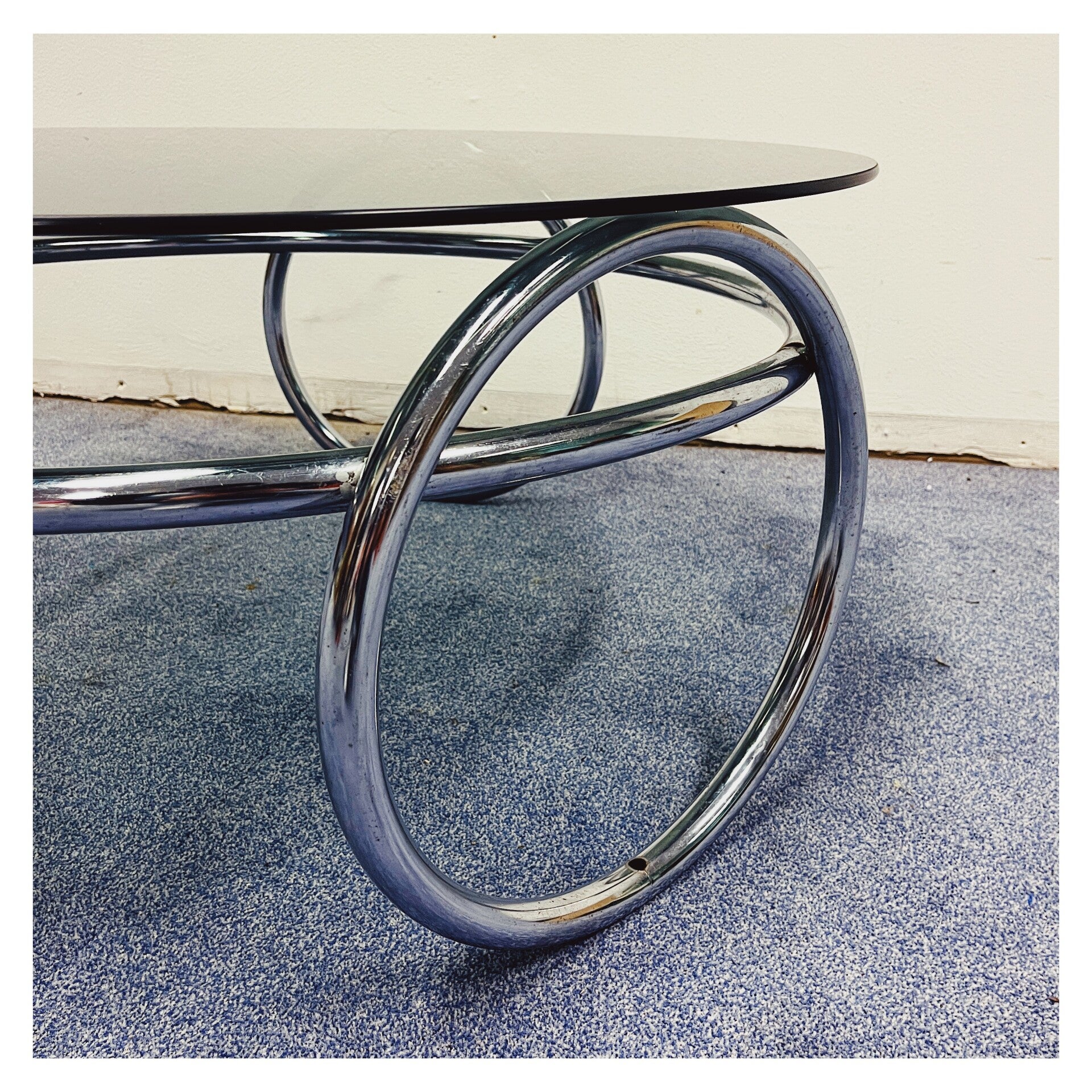 Unieke space age 70's salontafel. De tafel heeft een zilver messing glanzend onderstel. Op dit onderstel ligt een groot messing rookglas. De tafel is in goede conditie met hier en daar wat hele kleine krasjes op het glas.