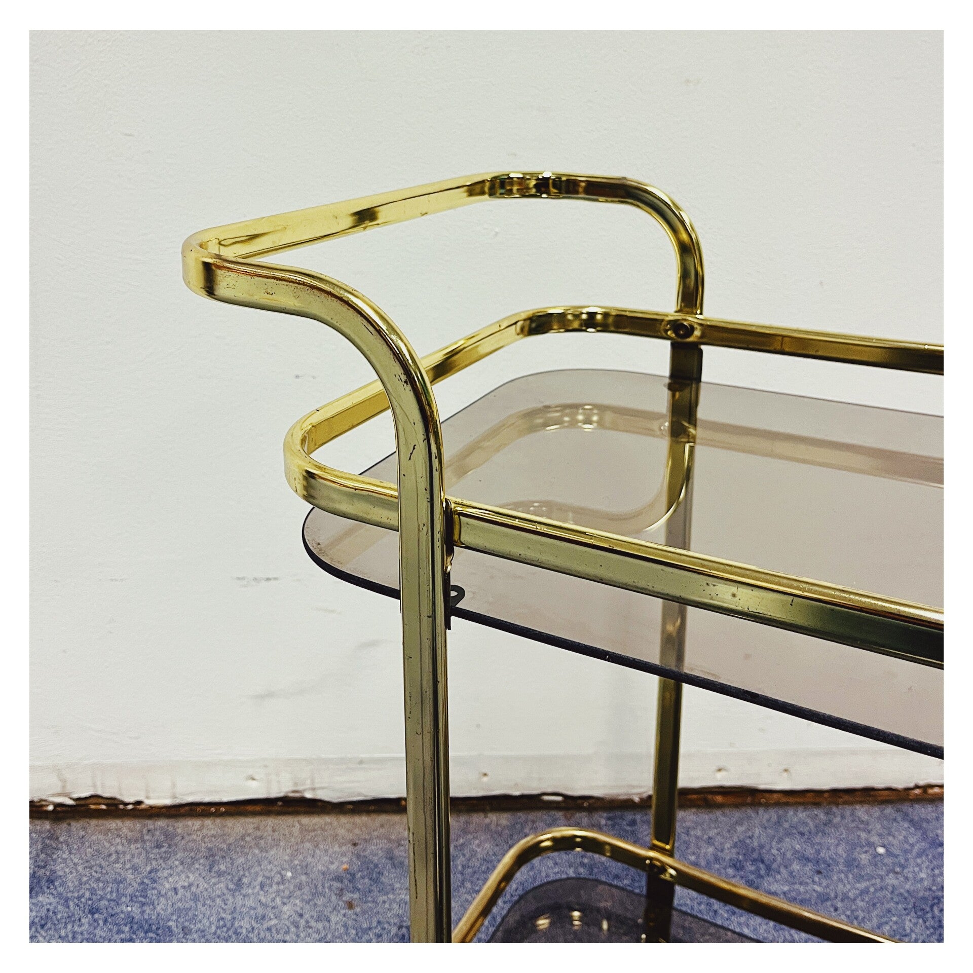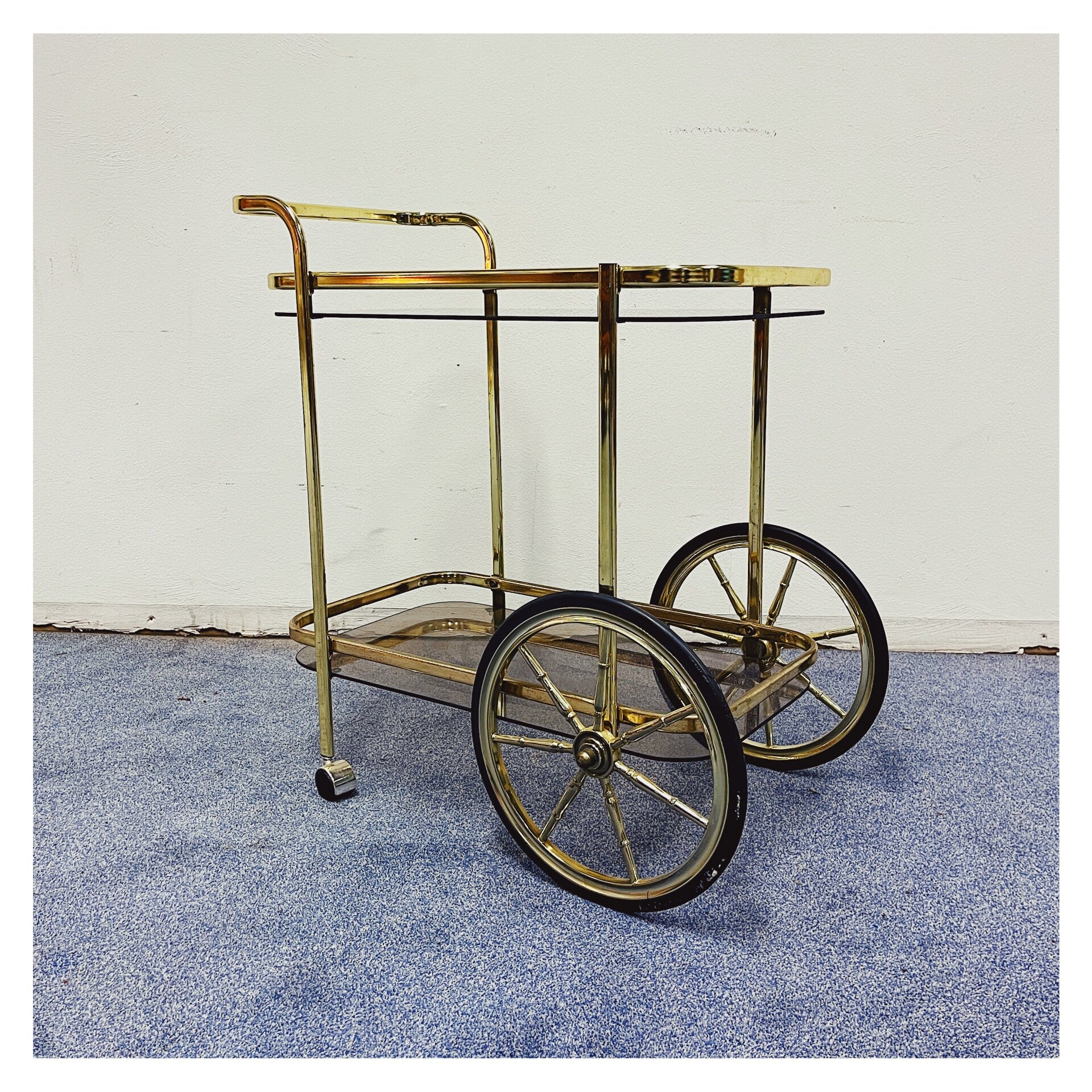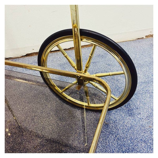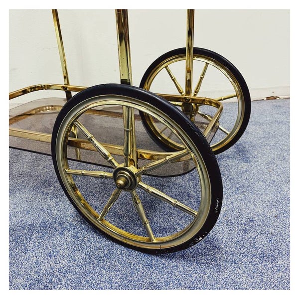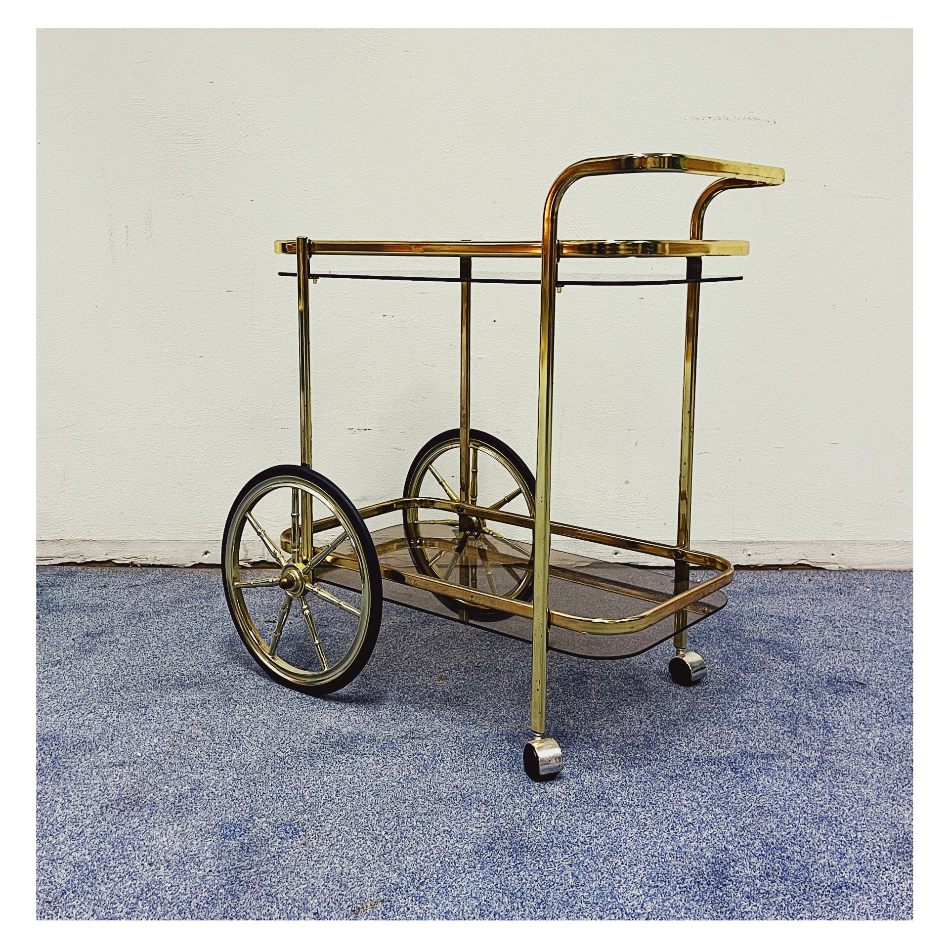 Vintage Gouden 70's Trolley. De bar-cart heeft een goud montuur. De trolley heeft twee lagen die elk een rookglazen blad hebben. Beide bieden ruimte om de mooiste accessoires of drankjes tentoon te stellen. De bar-cart is in goede vintage conditie met minimale gebruikssporen.