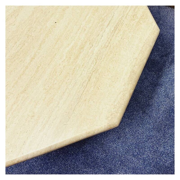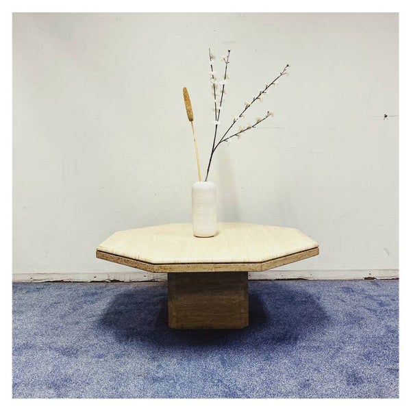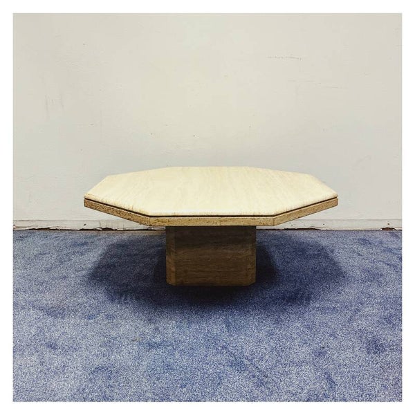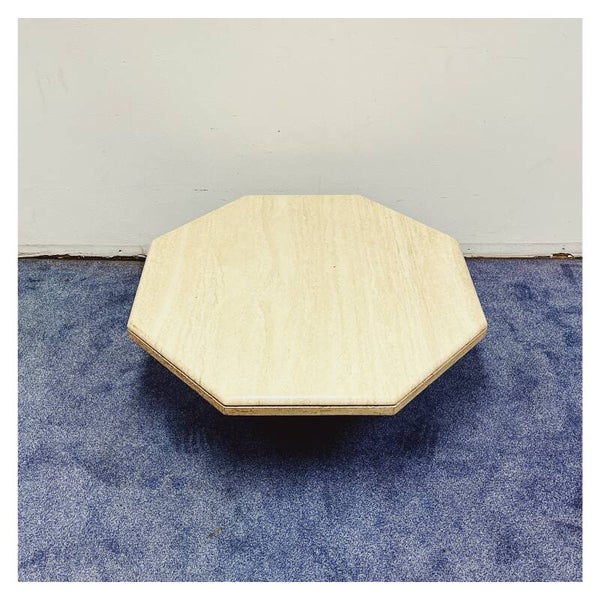 Salontafel van travertijn. De salontafel bestaat uit een open kubus met daarop een achthoekig bovenblad. De tafel is vervaardigd uit het prachtige wit/beige kleurige natuursteen genaamd travertijn. De tafel is in goede staat met hier en daar wat verkleuringen en oneffenheden!