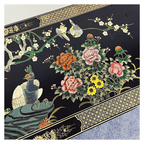 Chinese salontafel / Tv Kastje van zwart gelakt hout. Het geheel is rijkelijk versierd met prachtige kleuren en menselijke scenes op een zwarte achtergrond. De tafel heeft minimale gebruikssporen en bezit drie opberglades.