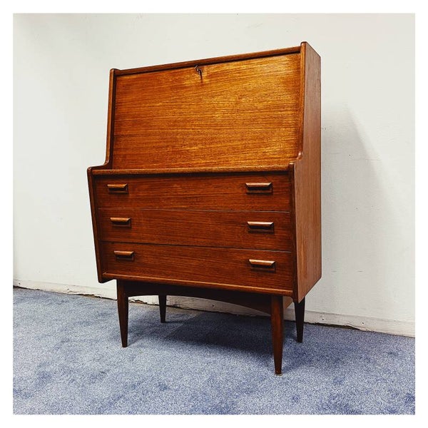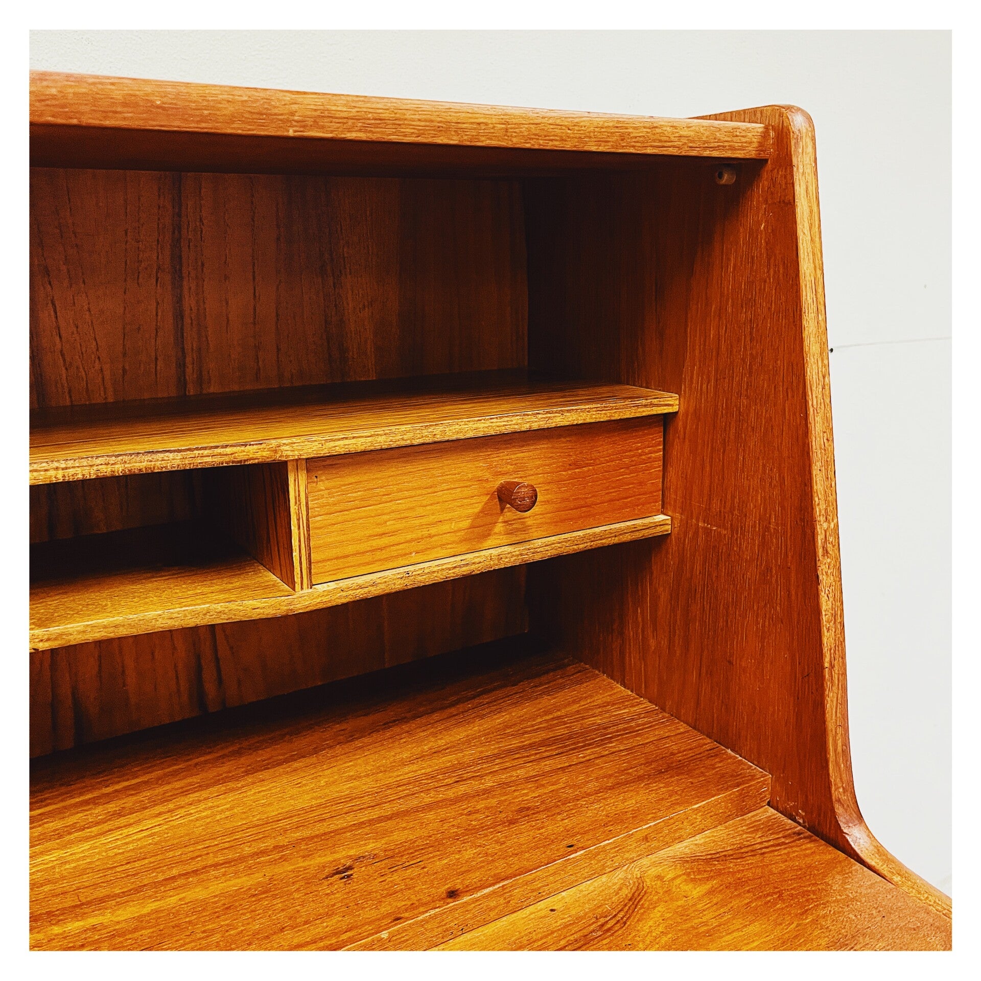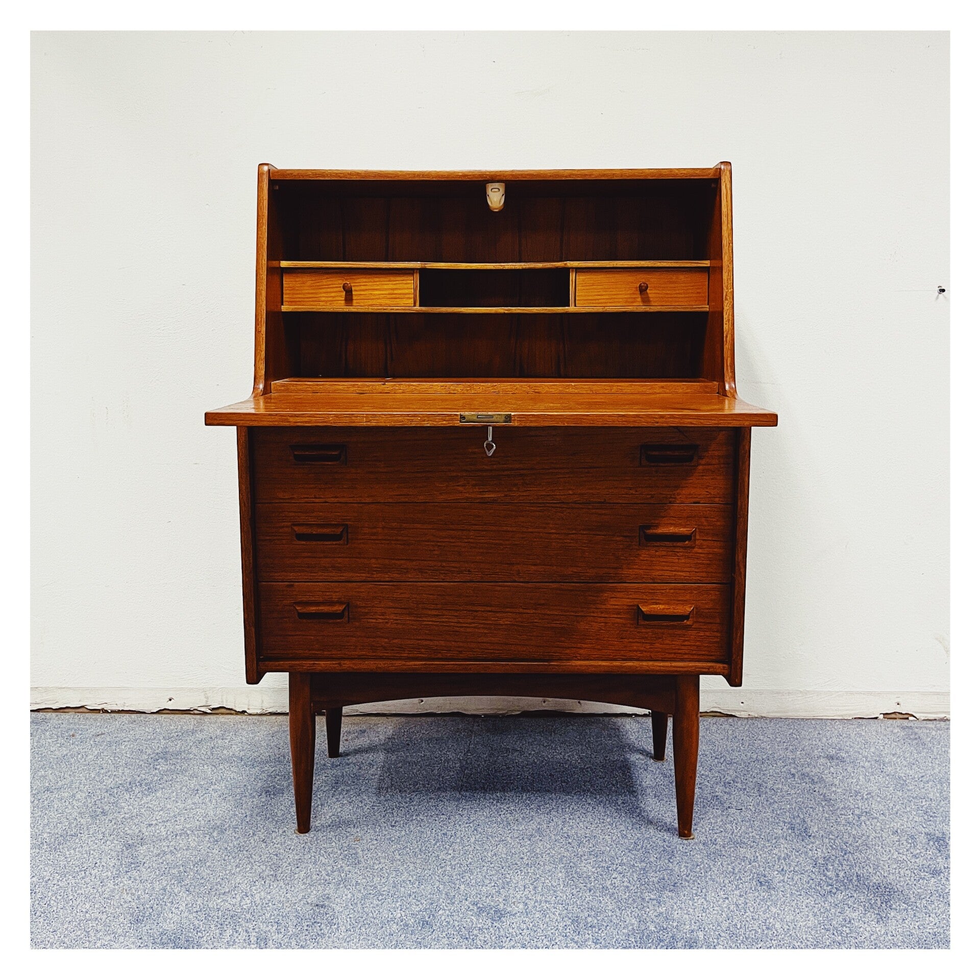 Scandinavische secretaire vervaardigd uit teakhout en fineer. De secretaire heeft een uitklapbaar blad waardoor het gebruikt kan worden als werktafel. Aan de onderzijde bevinden zich drie ruime lades die veel opbergruimte bieden. Het meubel verkeert in goede staat maar heeft hier en daar wel wat schade aan het fineer naar leeftijd!