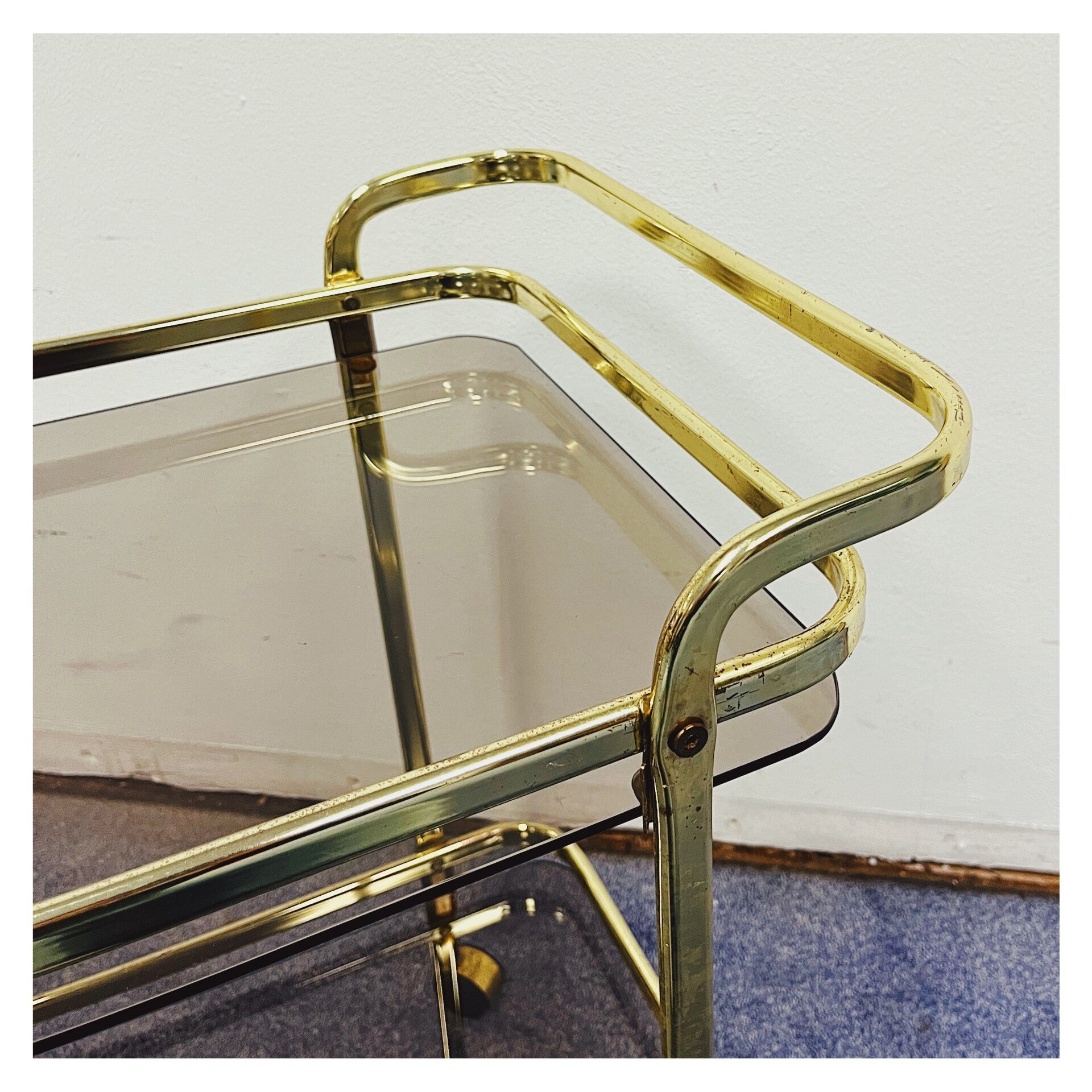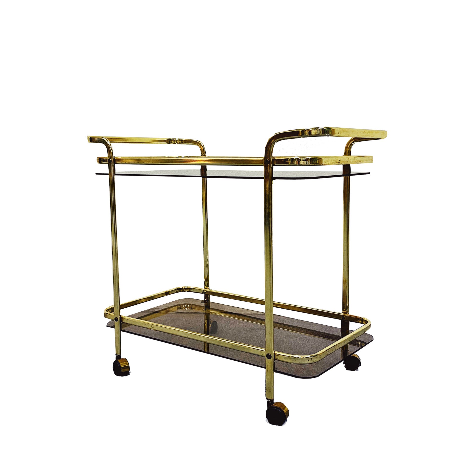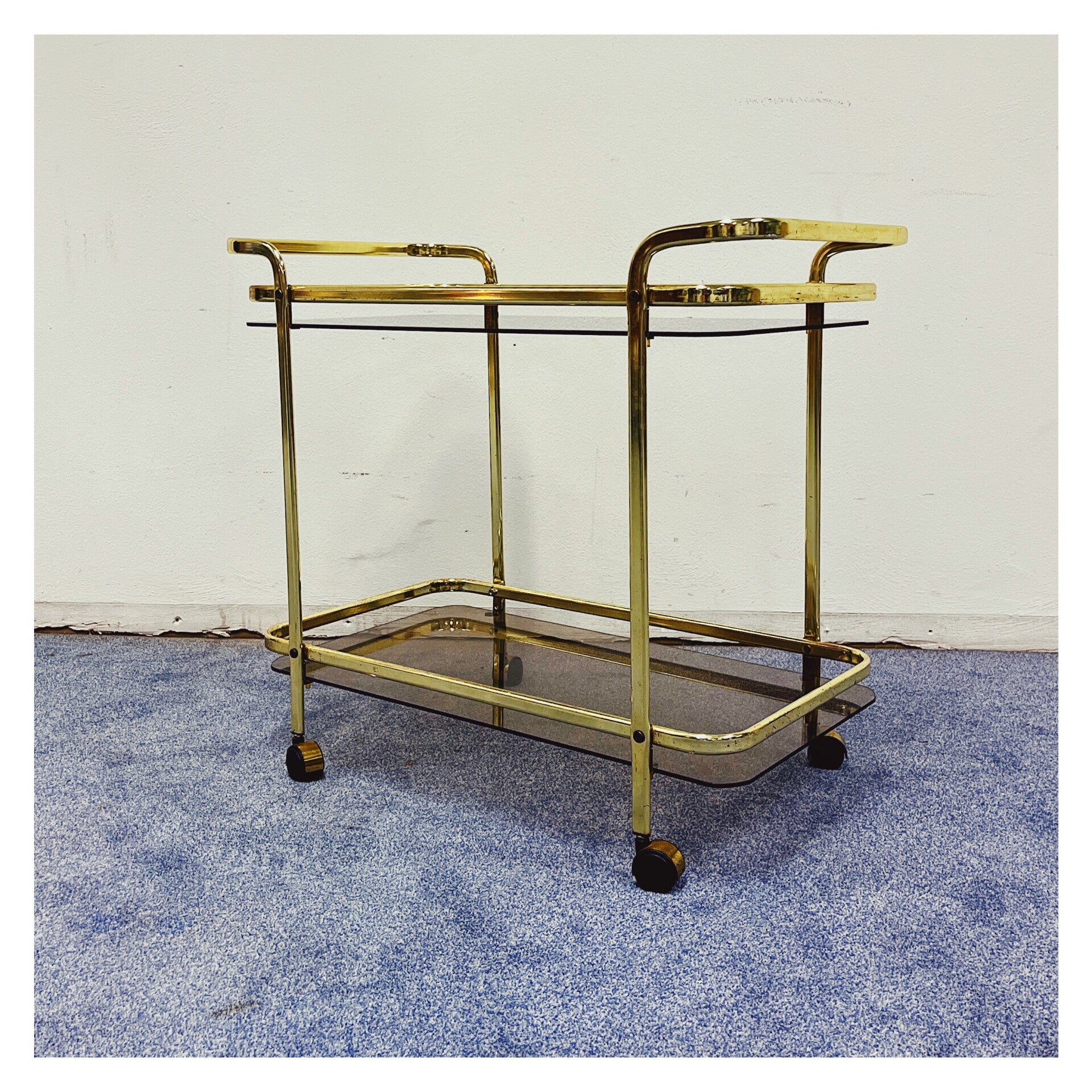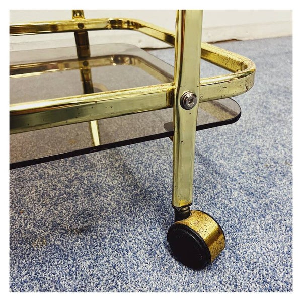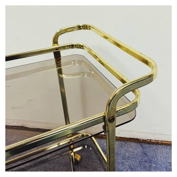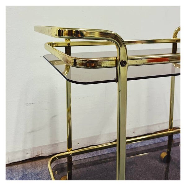 Vintage Gouden 70's Trolley. De bar-cart heeft een goud montuur. De trolley heeft twee lagen die elk een rookglazen blad hebben. De bar-cart is in goede vintage conditie met wat kleine gebruikssporen.