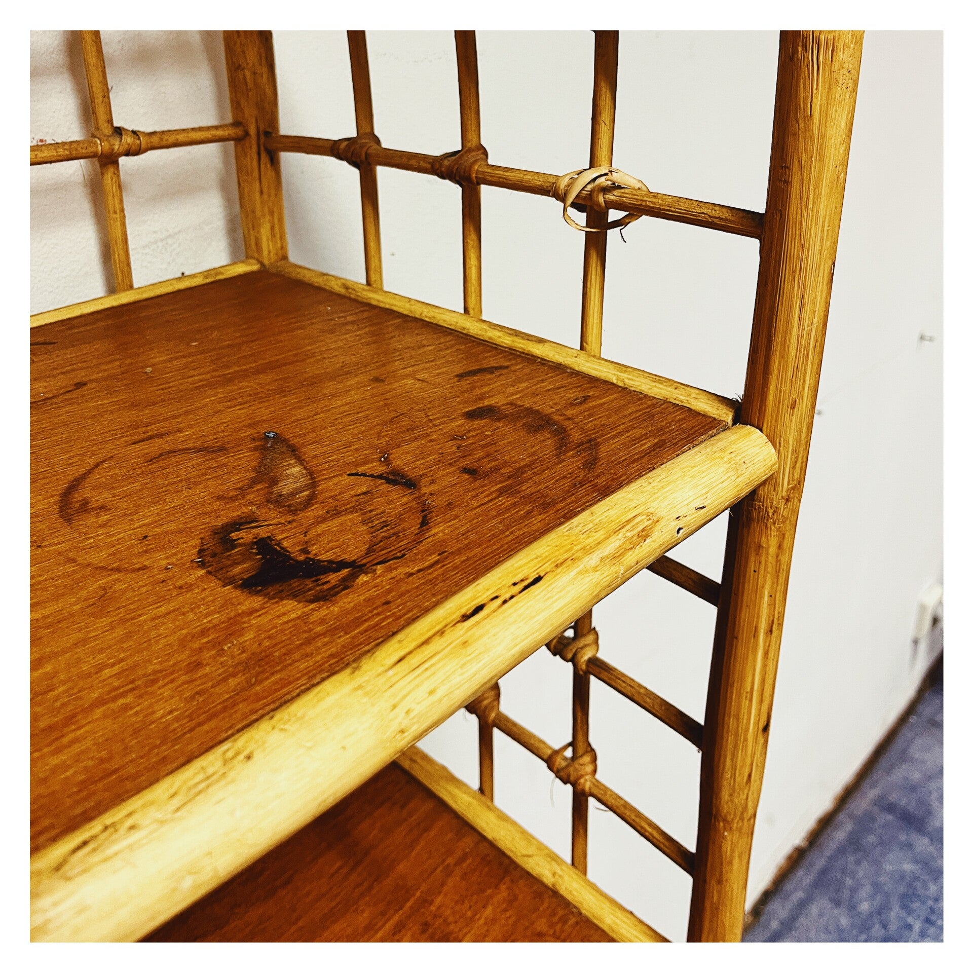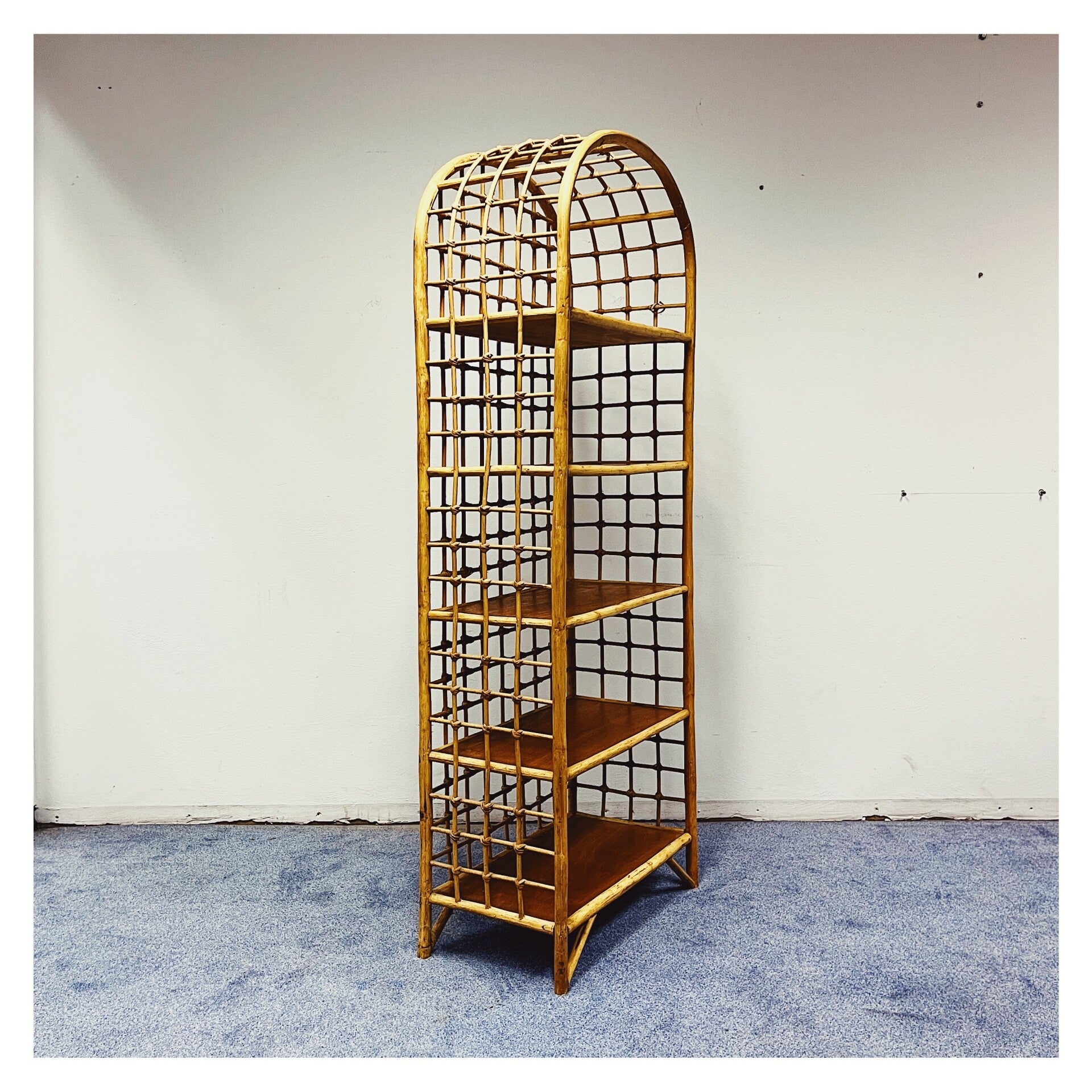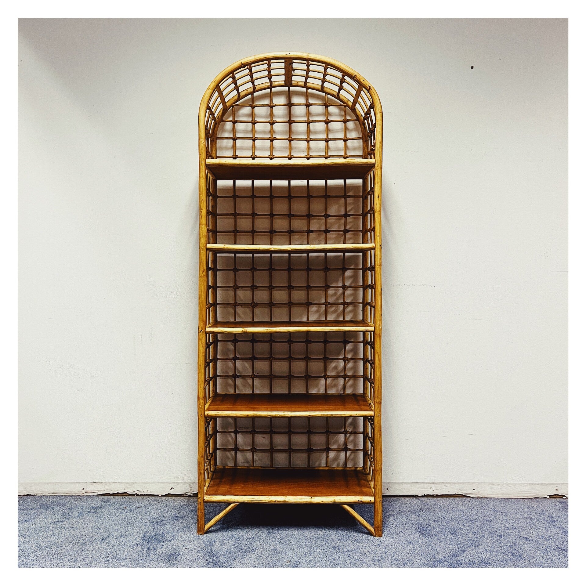 Open boho boogkast met 5 plateaus. De kast is in goede vintage conditie met wat gebruikssporen naar leeftijd en een verkleuring op de bovenste plank.