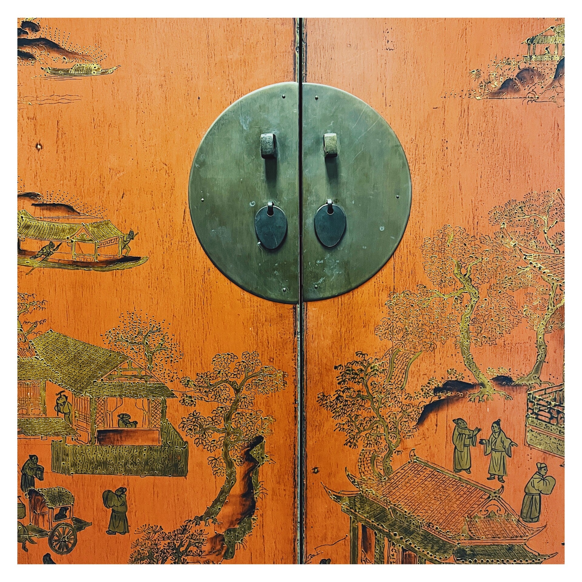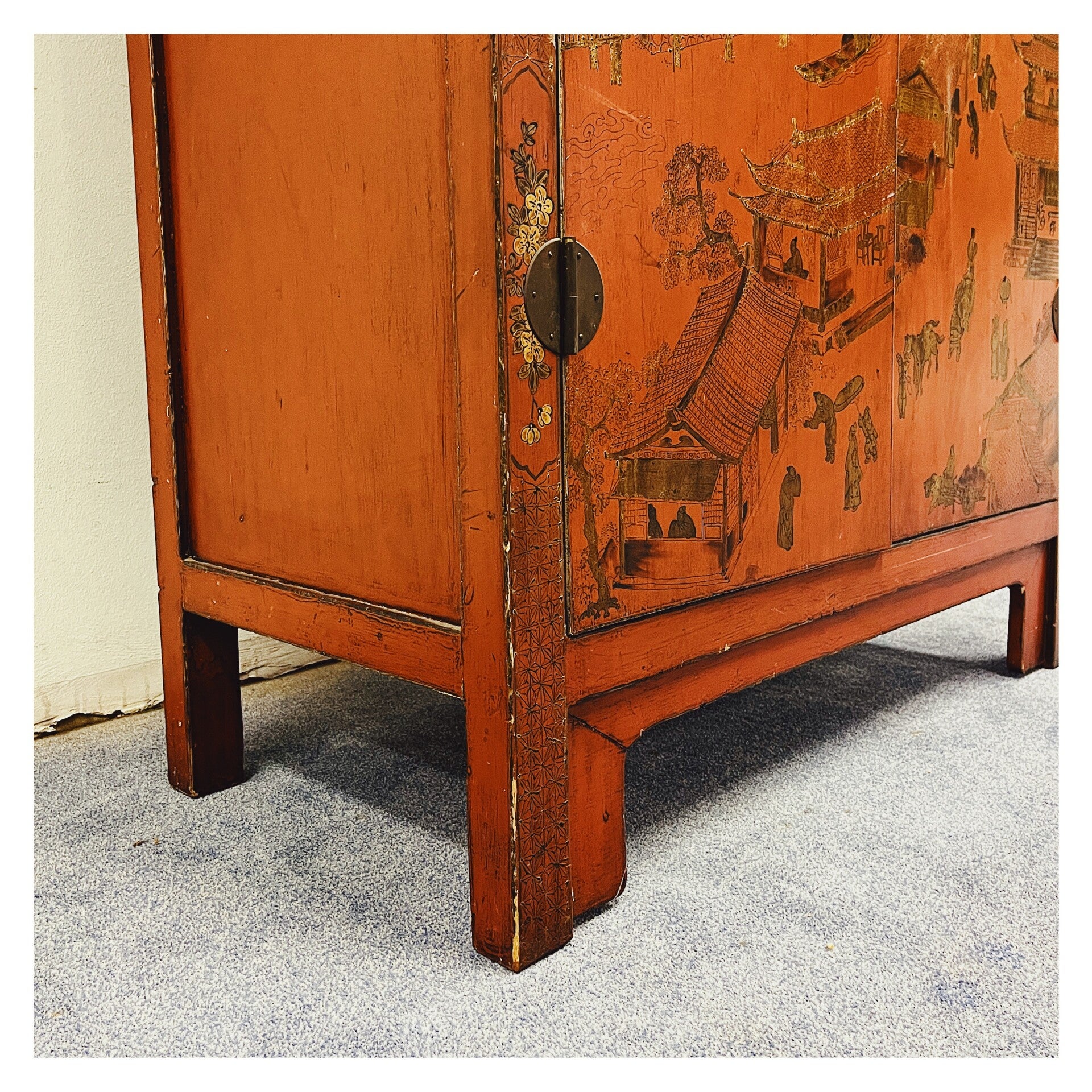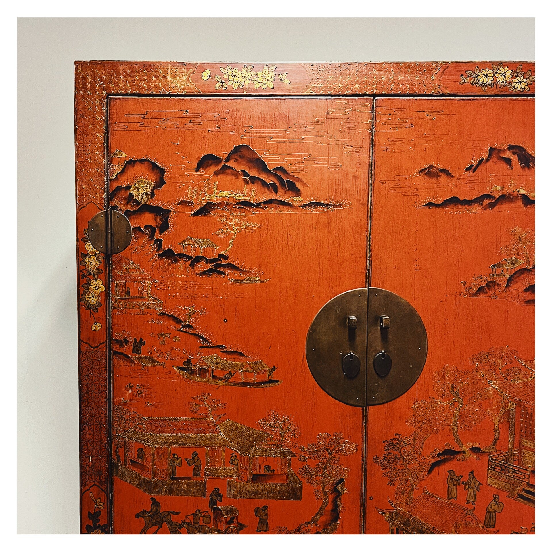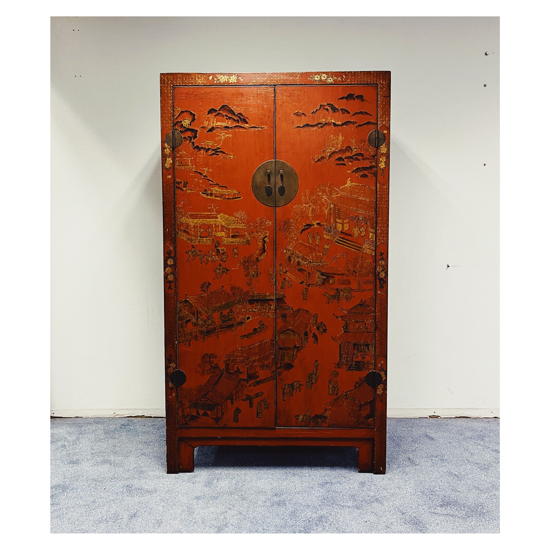 Antieke Chinese bruidskast. De hoge kast heeft een achtergrond van levendig rood, de kleur van geluk en voorspoed. Ook heeft de kast veel handgeschilderde motieven bestaande uit taferelen uit de natuur. In het midden van de kast bevind zich een afscheiding waar ook twee laden in zijn verwerkt. De kast heeft minimale gebruikssporen, maar heeft helaas wel een deur die niet helemaal nauw sluit. Desalniettemin een hele bijzondere aanwinst voor je interieur!