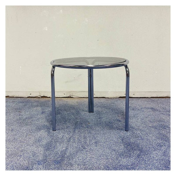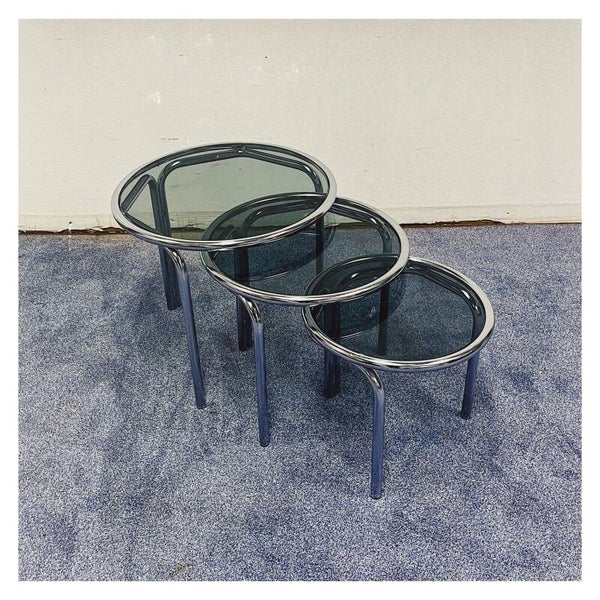 Vintage Nesting table set van drie. De bijzettafeltjes zijn vervaardigd in zilver chroom en hebben rookglazen bladen De glasplaten liggen los op het zilveren onderstel en hebben hier en daar wat kleine krasjes, het chroom daarentegen is in top staat!