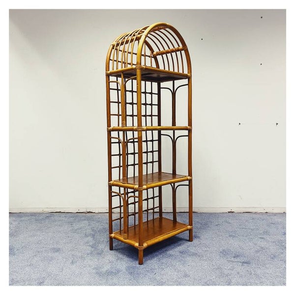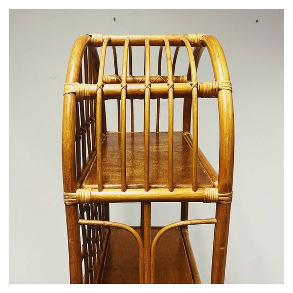 Vintage Rotan boogkast met vier plateaus. De boogkast is een prachtig stuk meubilair dat zowel functionaliteit als esthetiek combineert. Gemaakt van natuurlijk rotan, een duurzaam materiaal dat afkomstig is van de palmplant, voegt deze kast een vleugje organische schoonheid toe aan elk interieur.