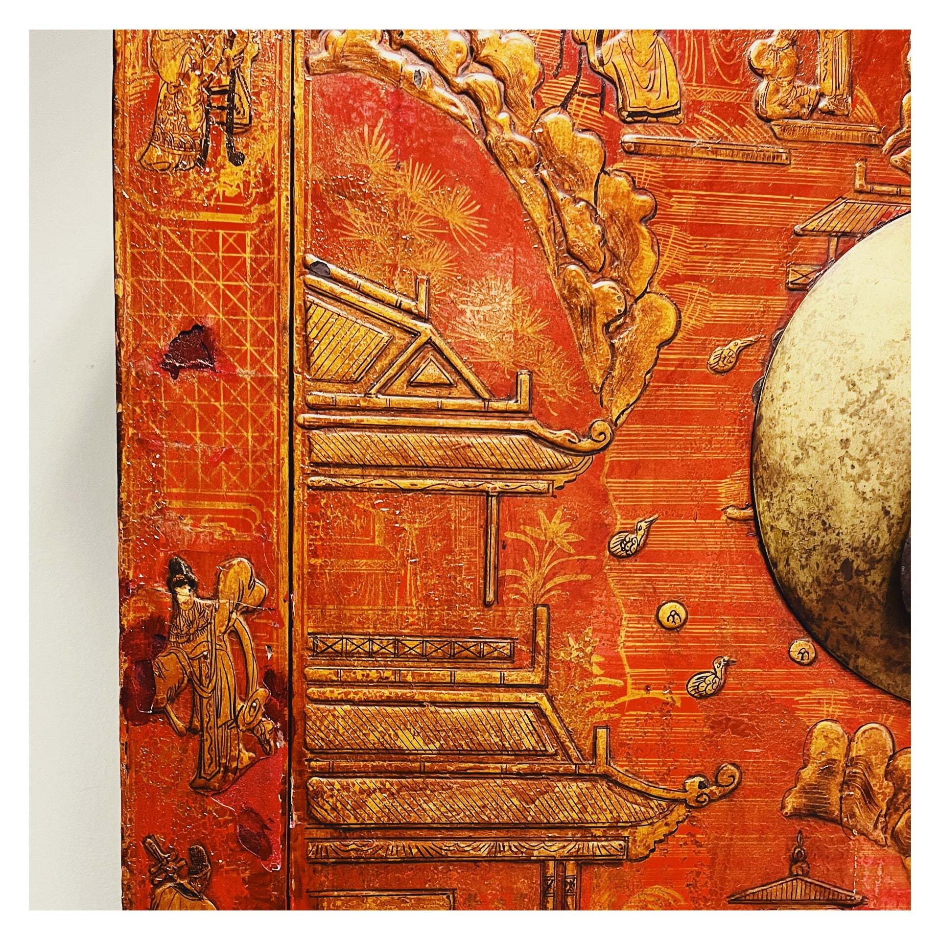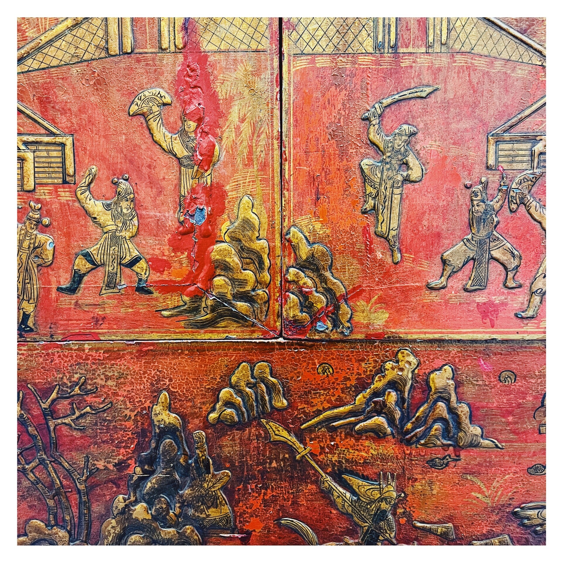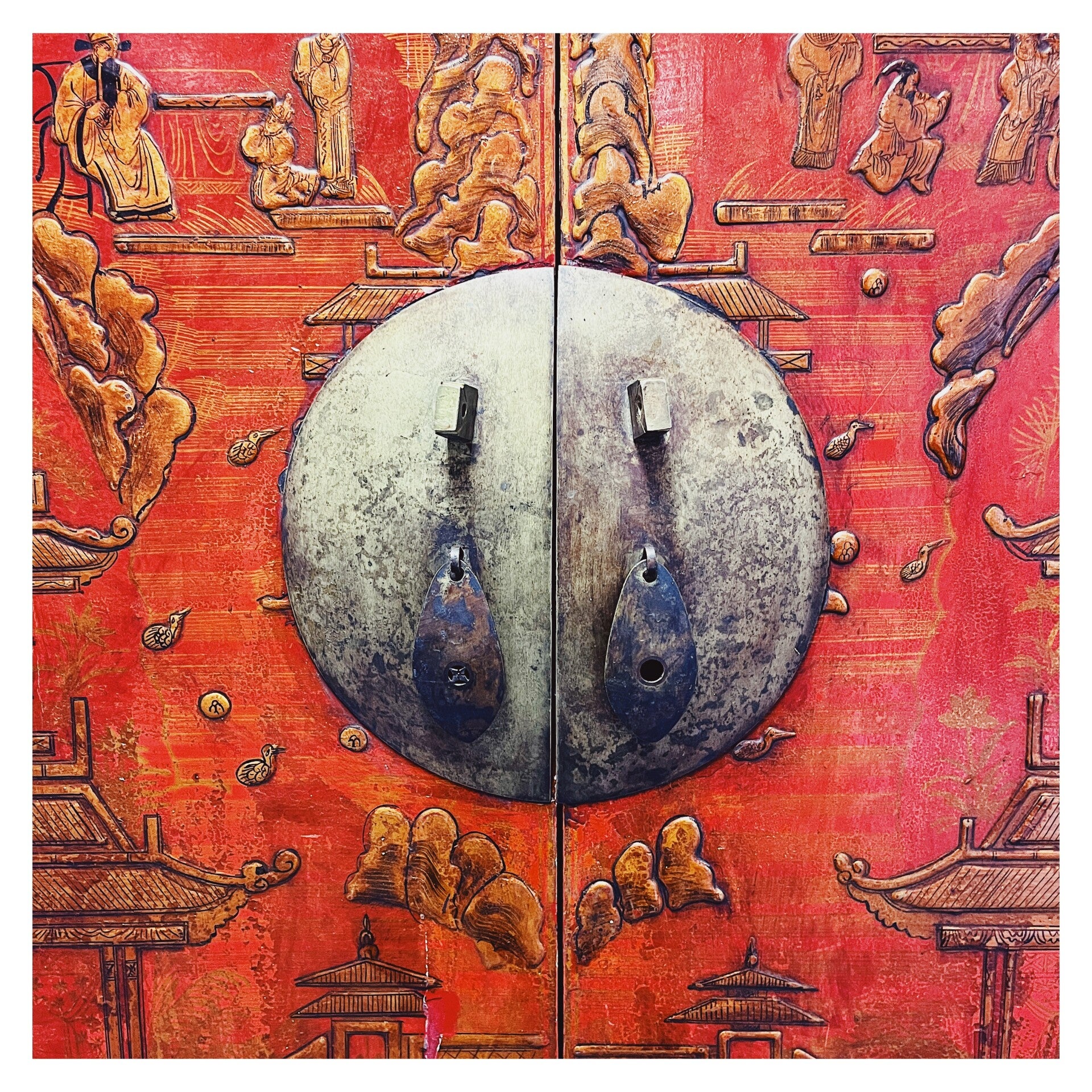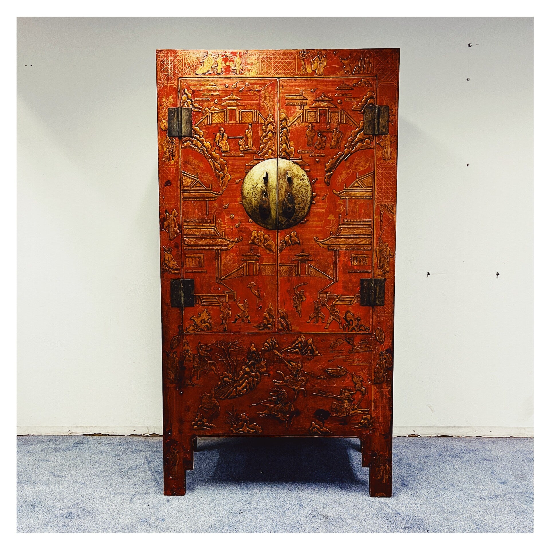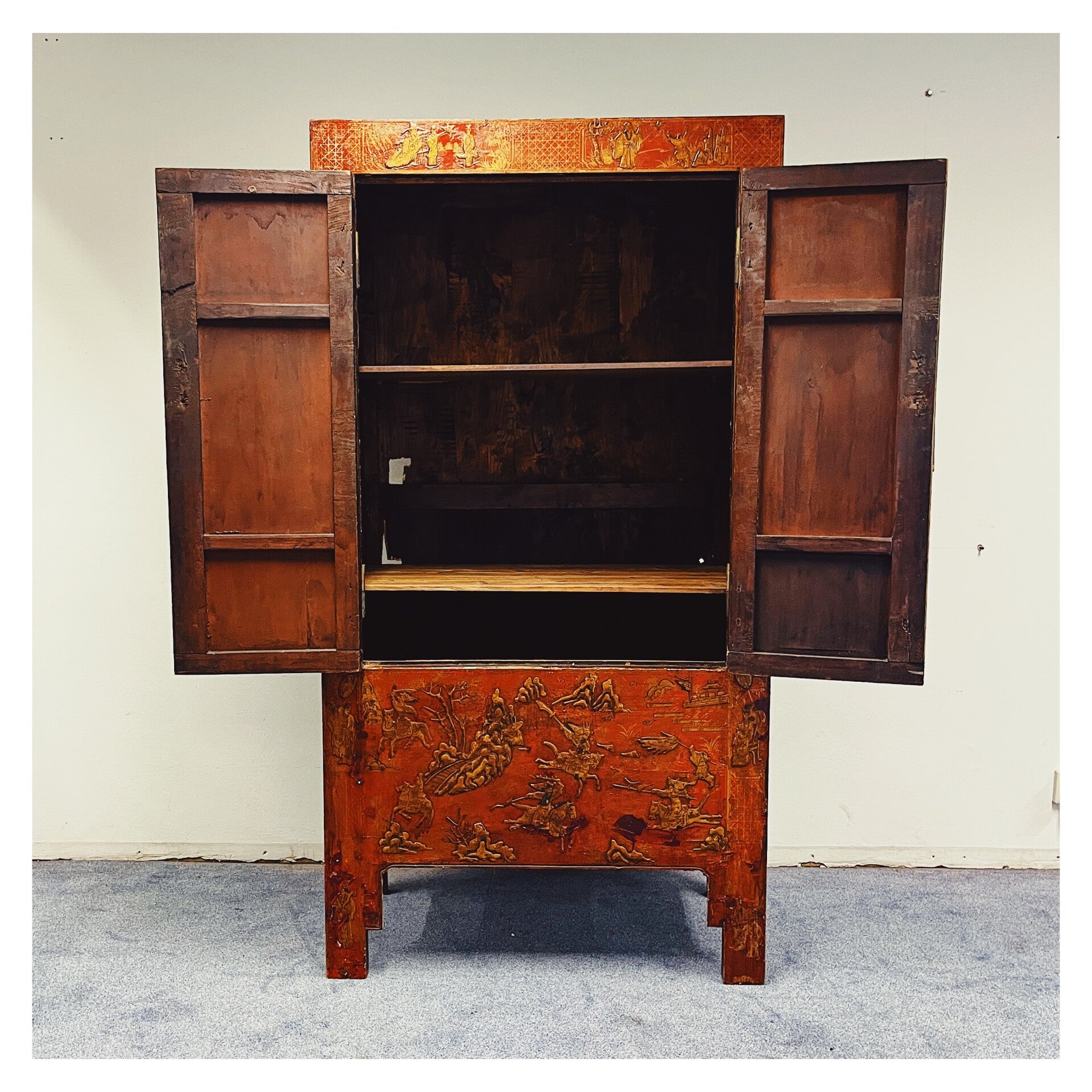 Antieke Chinese bruidskast. De hoge kast heeft een achtergrond van levendig rood, de kleur van geluk en voorspoed. Ook heeft de kast veel ingelegde motieven bestaande uit personen en veldslagen. In de kast bevinden zich twee planken en een opbergvak. De kast heeft wel wat gebruikssporen naar leeftijd en een gat achterin voor kabels. Desalniettemin is het een waanzinnig exemplaar!