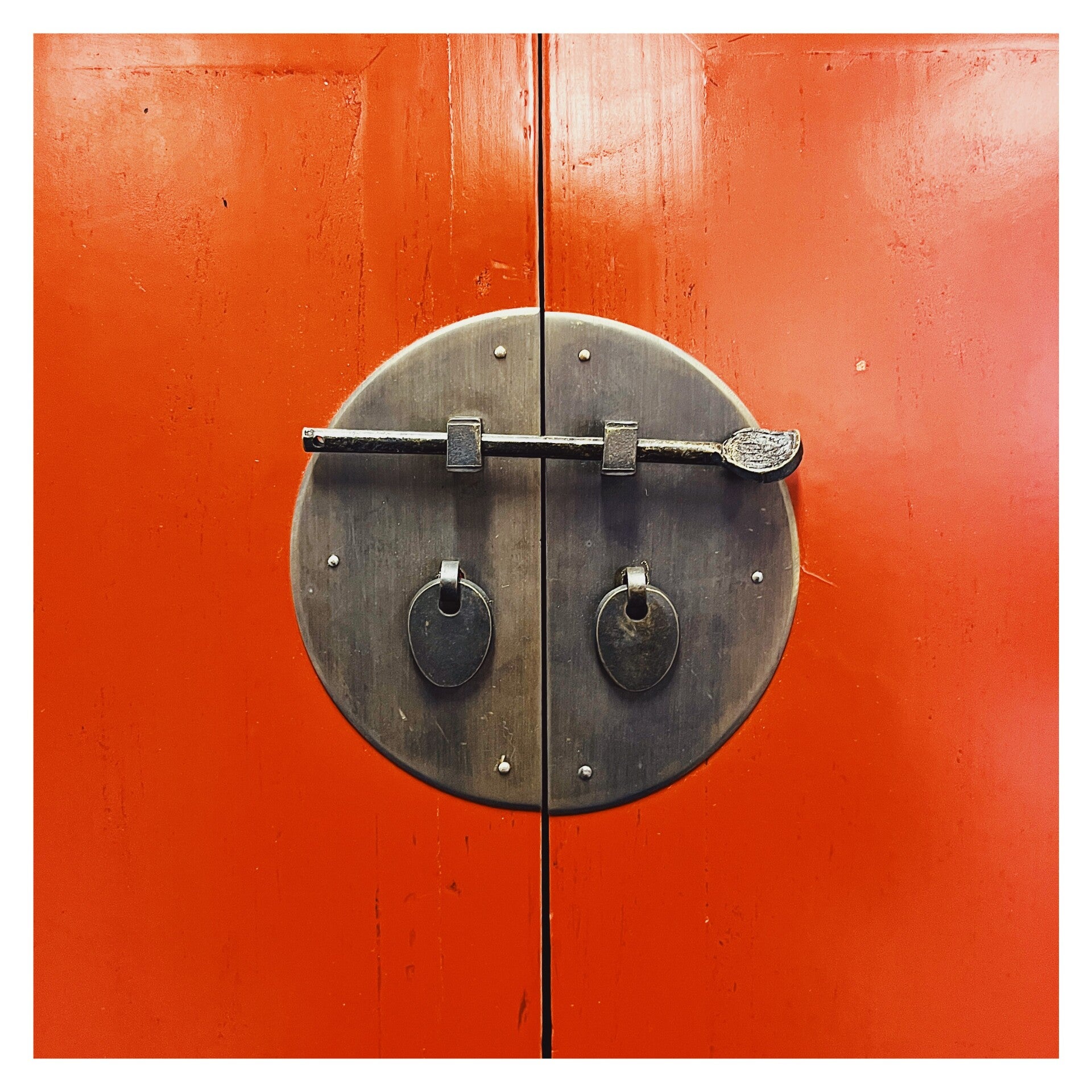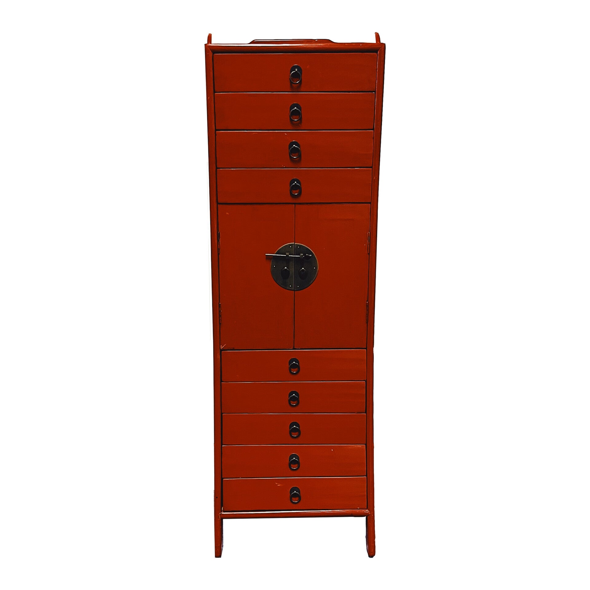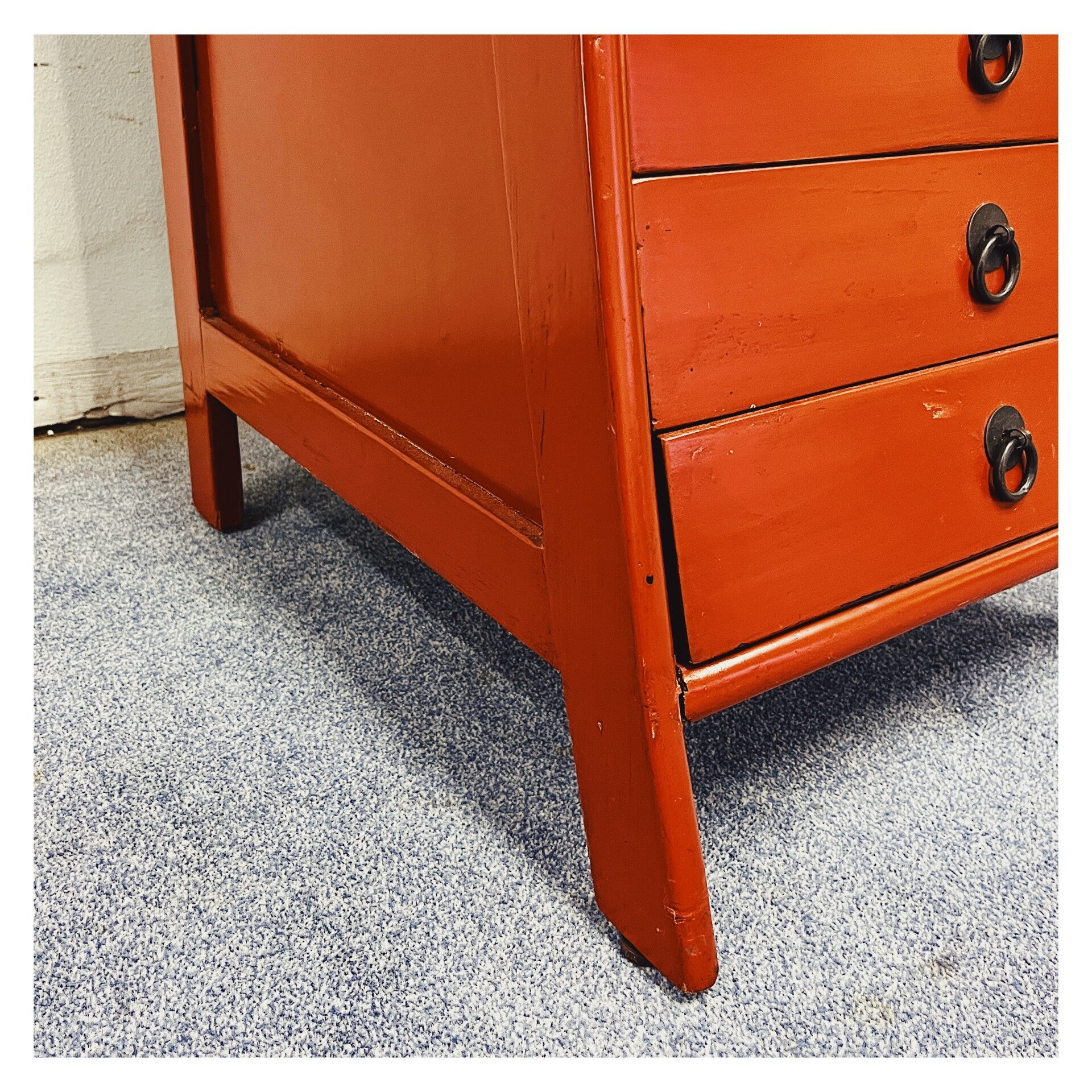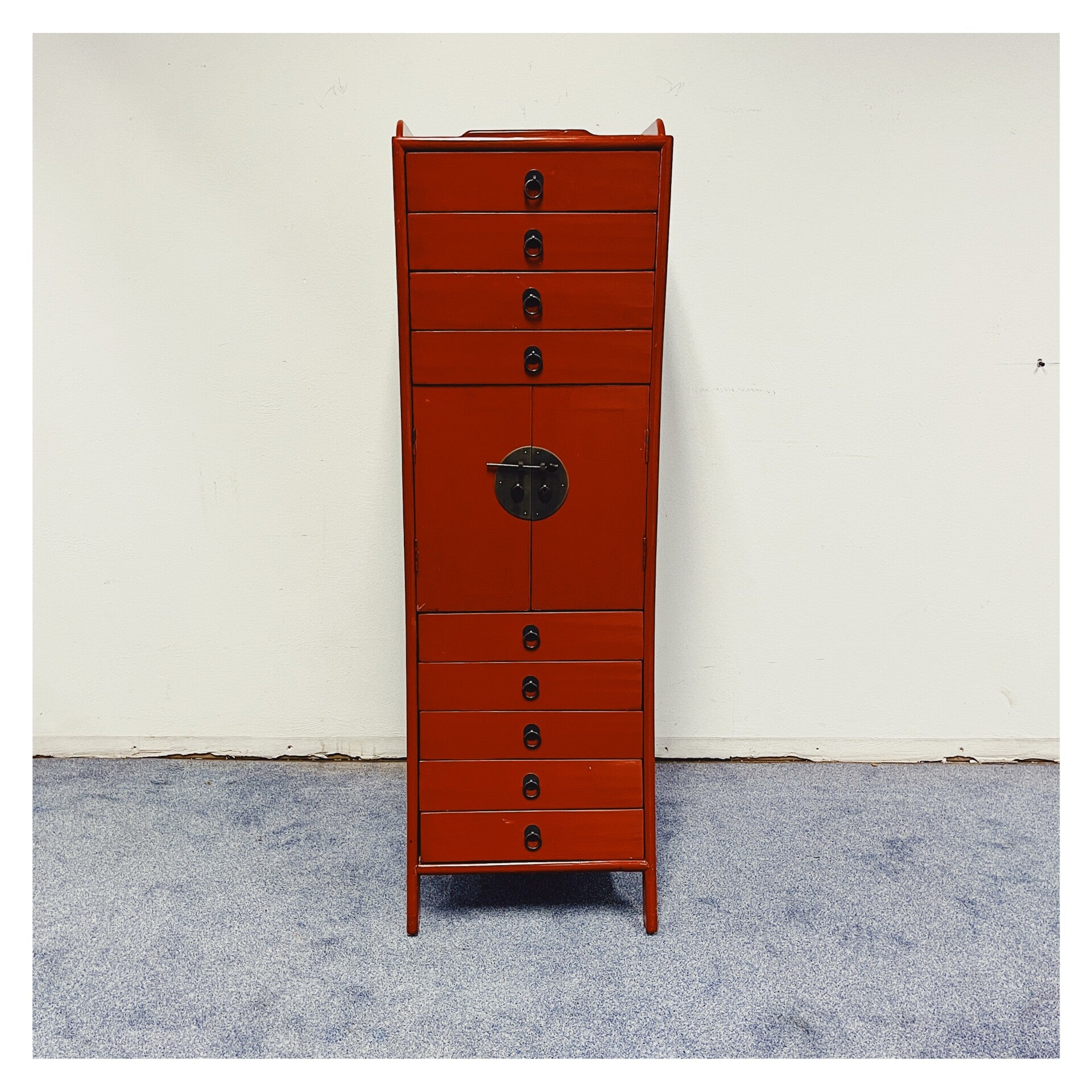 Chinese ladekast vervaardigd in rood lak. De kast heeft 9 kleine opbergladen en in het midden een ruim opbergvak, afgesloten door twee deuren. Dankzij de lades en lange smalle omvang is het een perfect opbergmeubel. De laden zijn voorzien van mooie bronzen ronde grepen. Het meubel verkeerd zich in hele goede conditie.