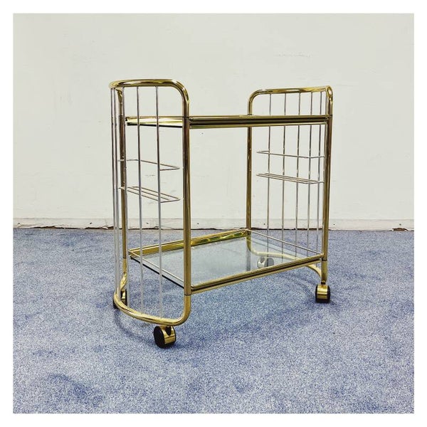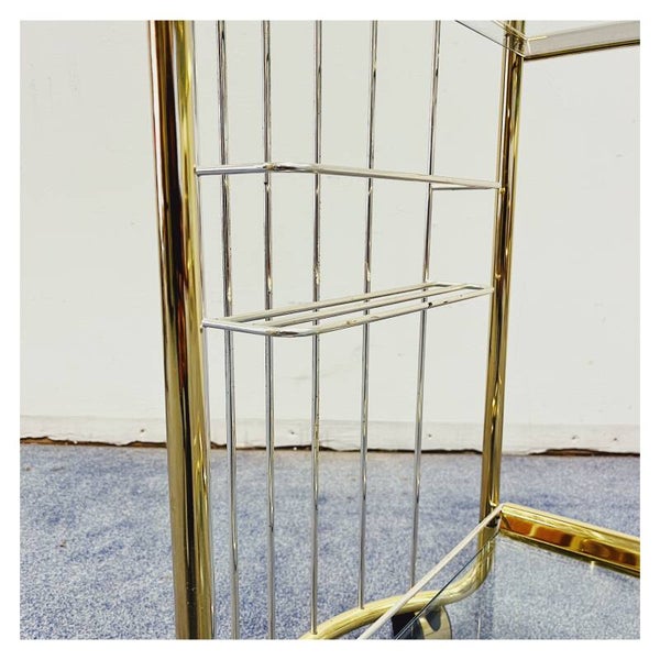 Leuke bar-cart met twee verdiepingen. Het frame is gemaakt van goudkleurig messing en de bladen zijn van glas. Daarnaast heeft de trolley aan beide zijkanten een vak gemaakt van zilver messing. Hier kunnen bijvoorbeeld tijfschriften in. Op het zilvere messing zitten een paar kleine roestplekken, maar de gebruikssporen zijn in het algemeen minimaal.