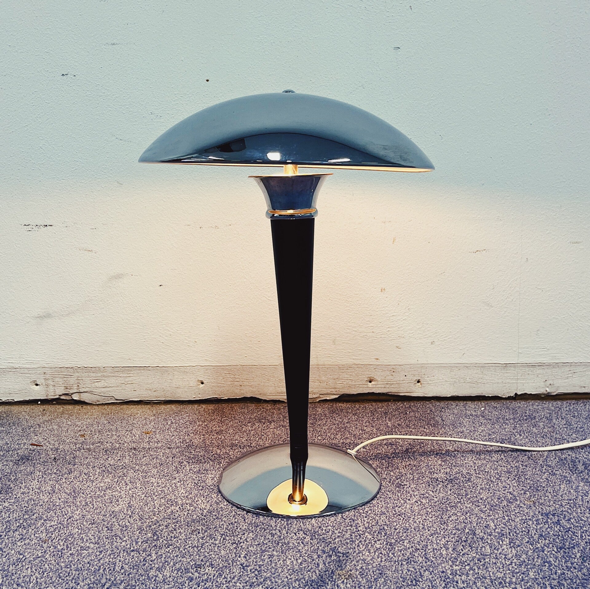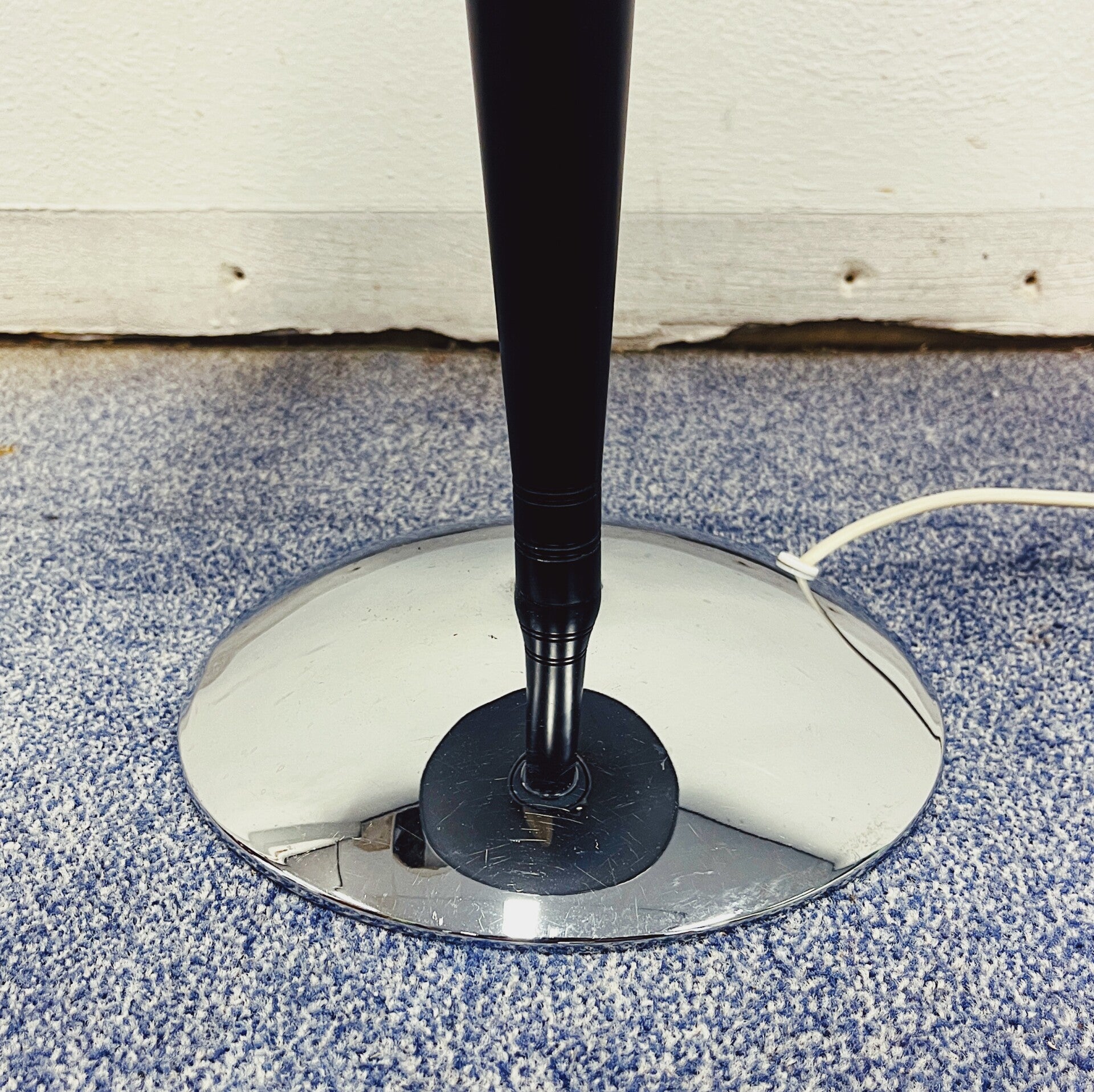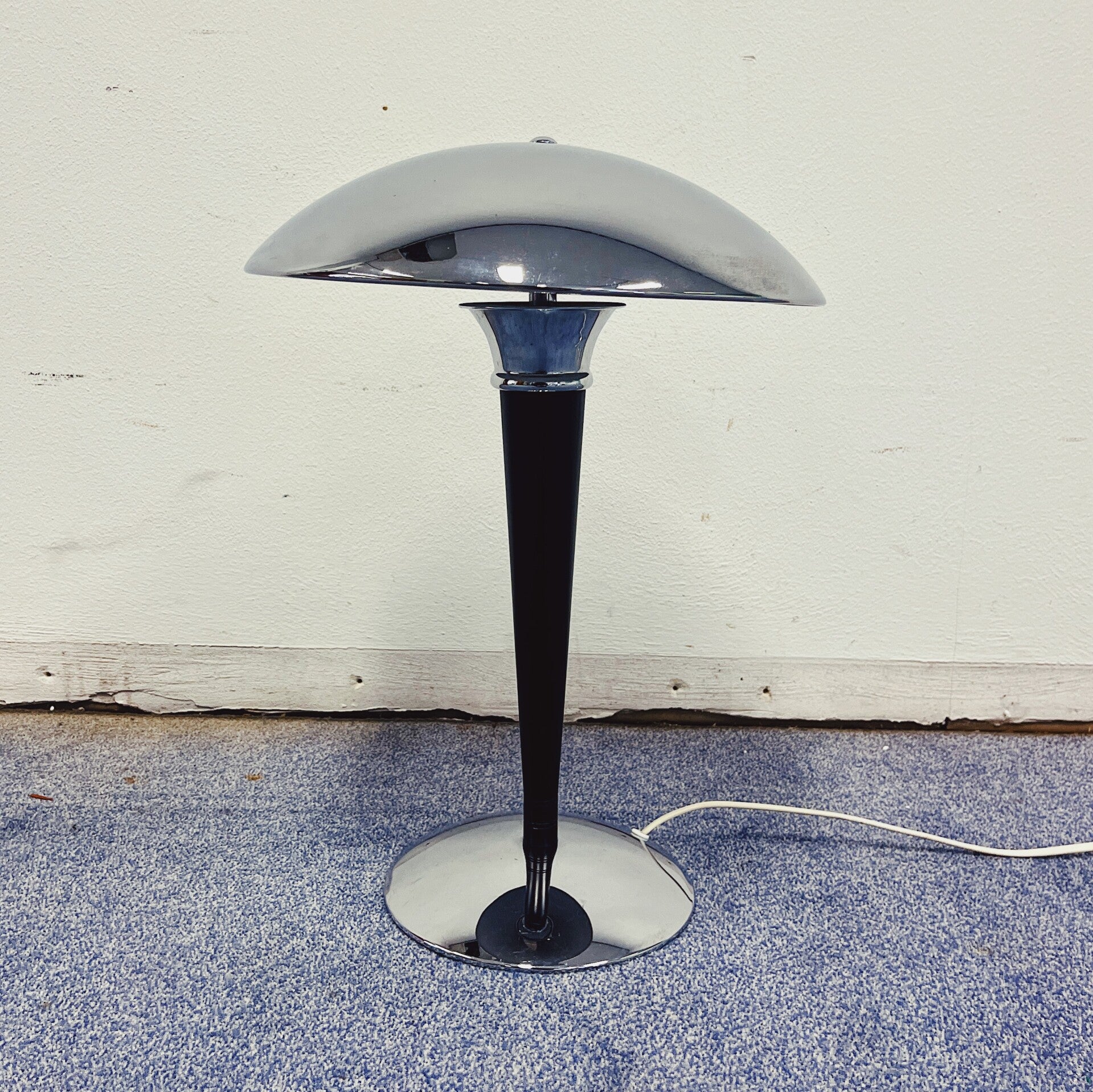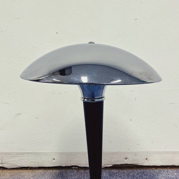 Elegante Ikea art-deco mushroom lamp (1980). De lamp heeft een gebogen verchroomde metalen (ijzeren) ronde voet, met daarboven een conische zwart gelakte staaf. De lampenkap is gemaakt van chroom in een paddestoelstijl, waarbij de binnenkant wit is geschilderd om het licht optimaal te reflecteren. Bovenop bevindt zich een chromen siermoer. De lamp bevat twee E14-fittingen voor de lichtbronnen.