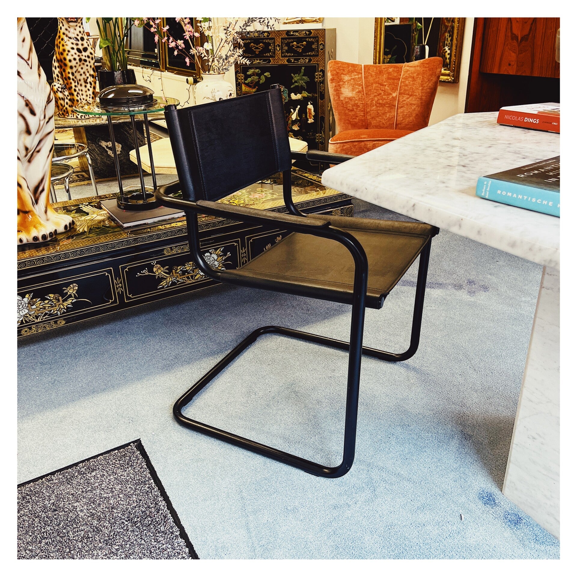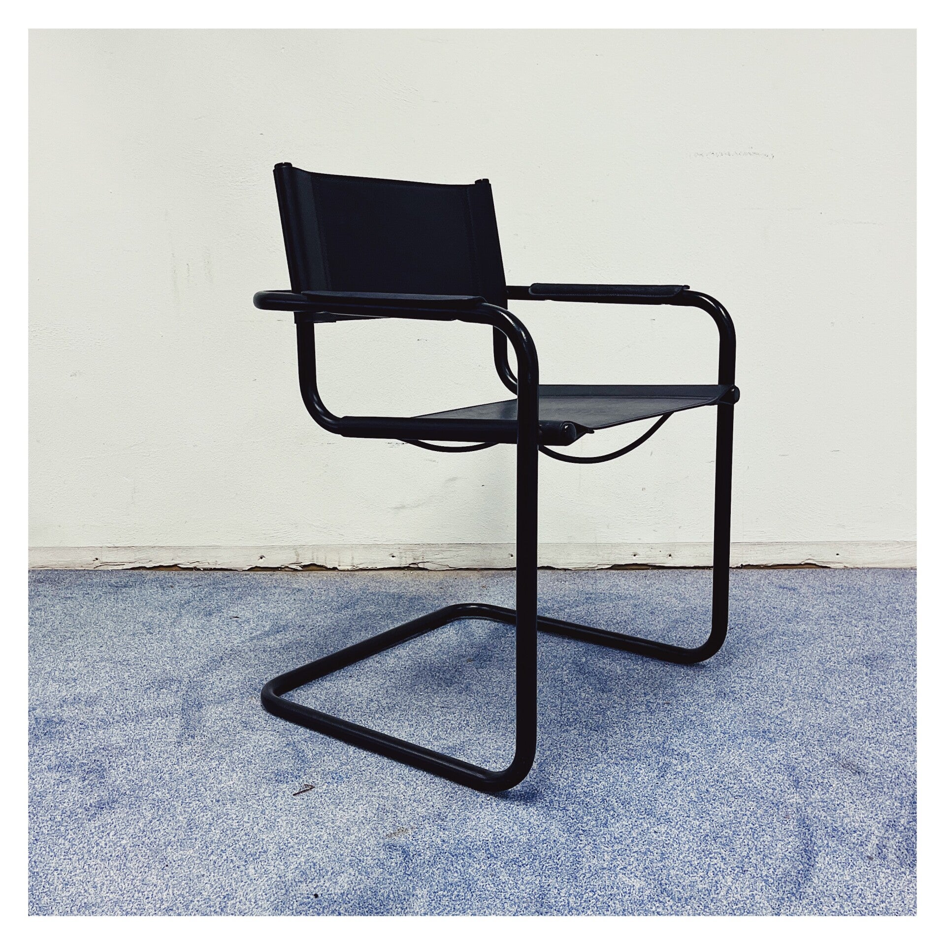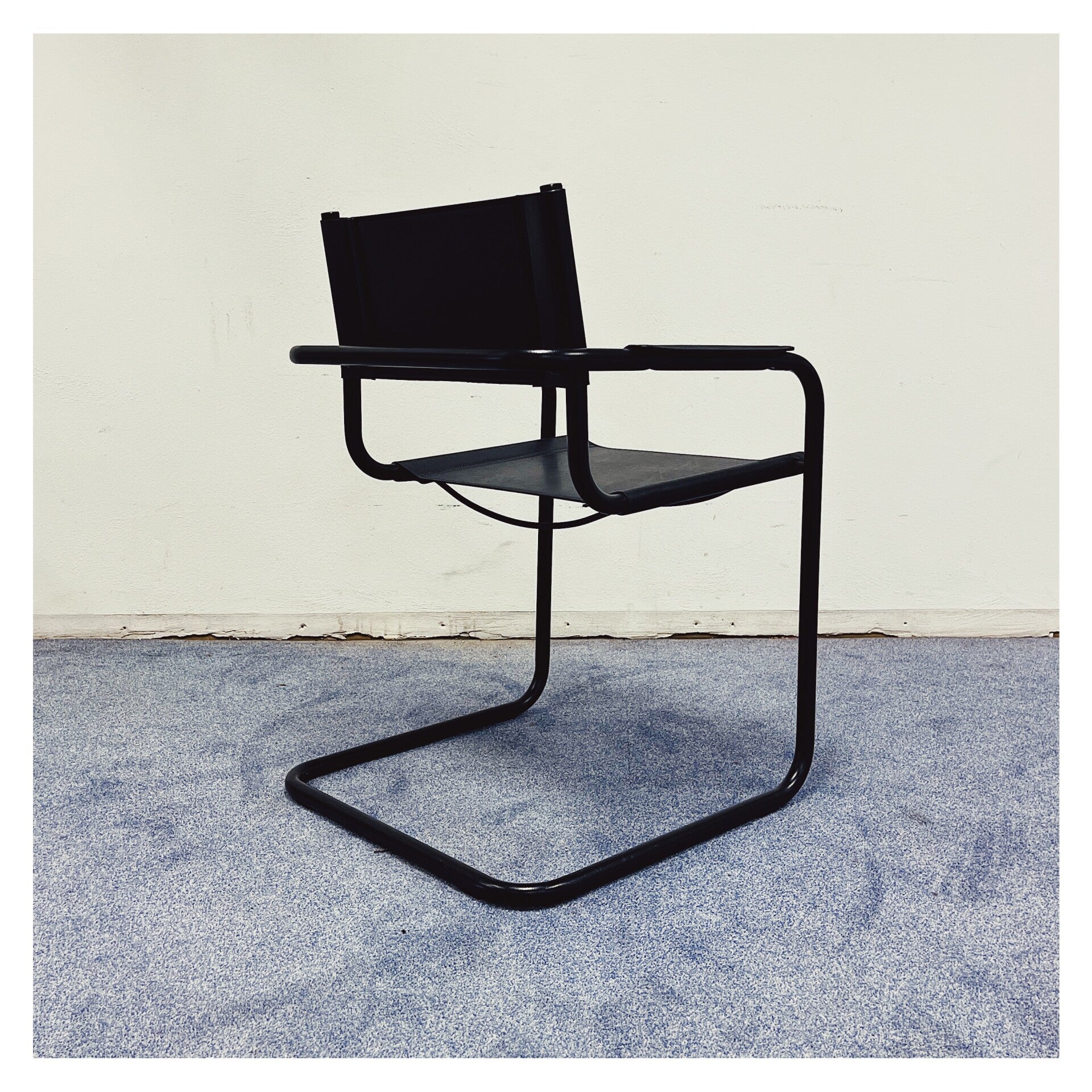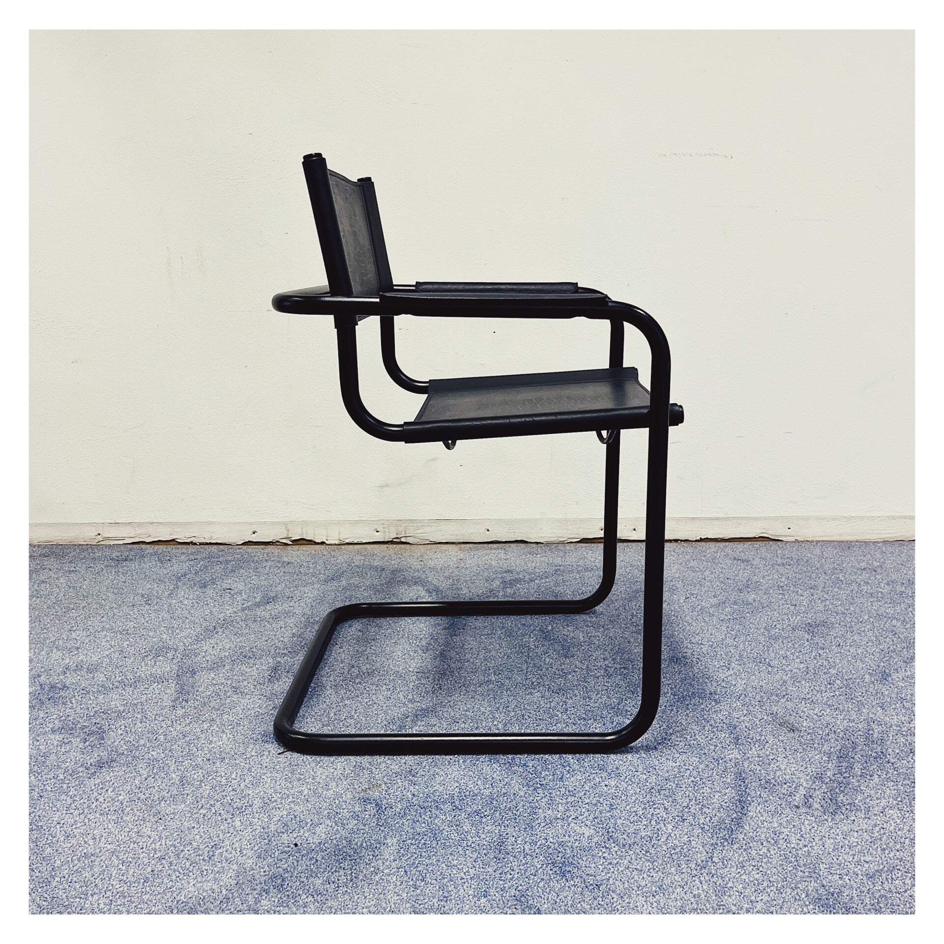 Vintage buisframe stoelen set van vier. De zitting van de stoelen is vervaardigd van hoogwaardig zwart kunstleer. Het frame is gemaakt van zwart verchroomde buizen. De stoelen zijn in hele goede staat en vertonen enkel wat kleine krasjes in het skai leer en wat roestplekjes aan de onderzijde.
