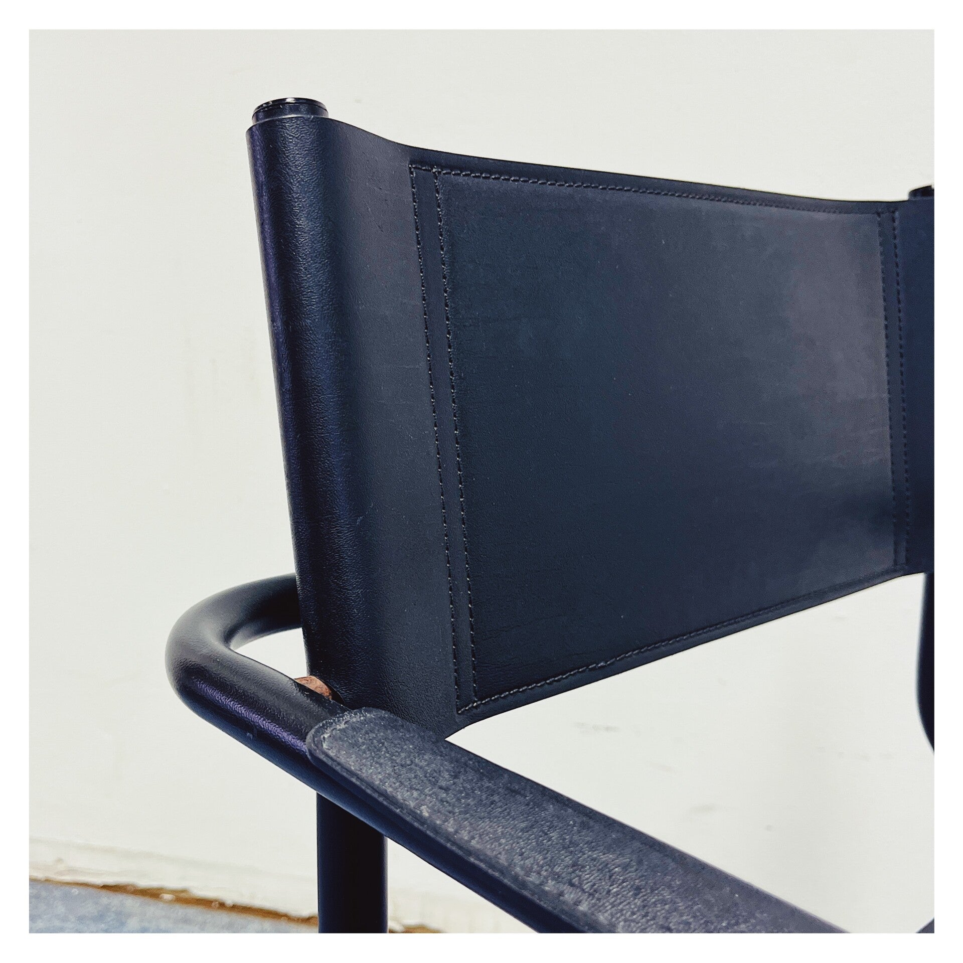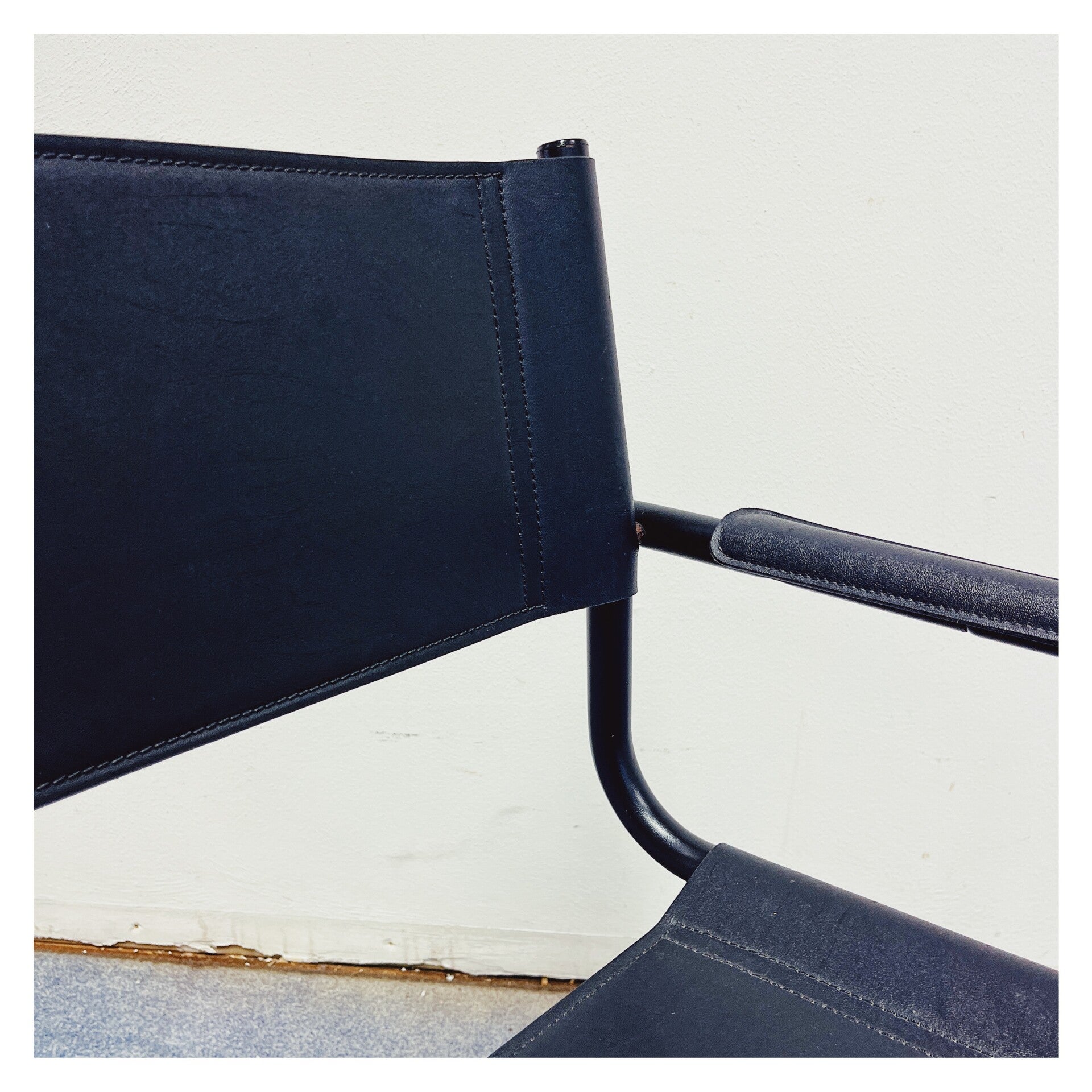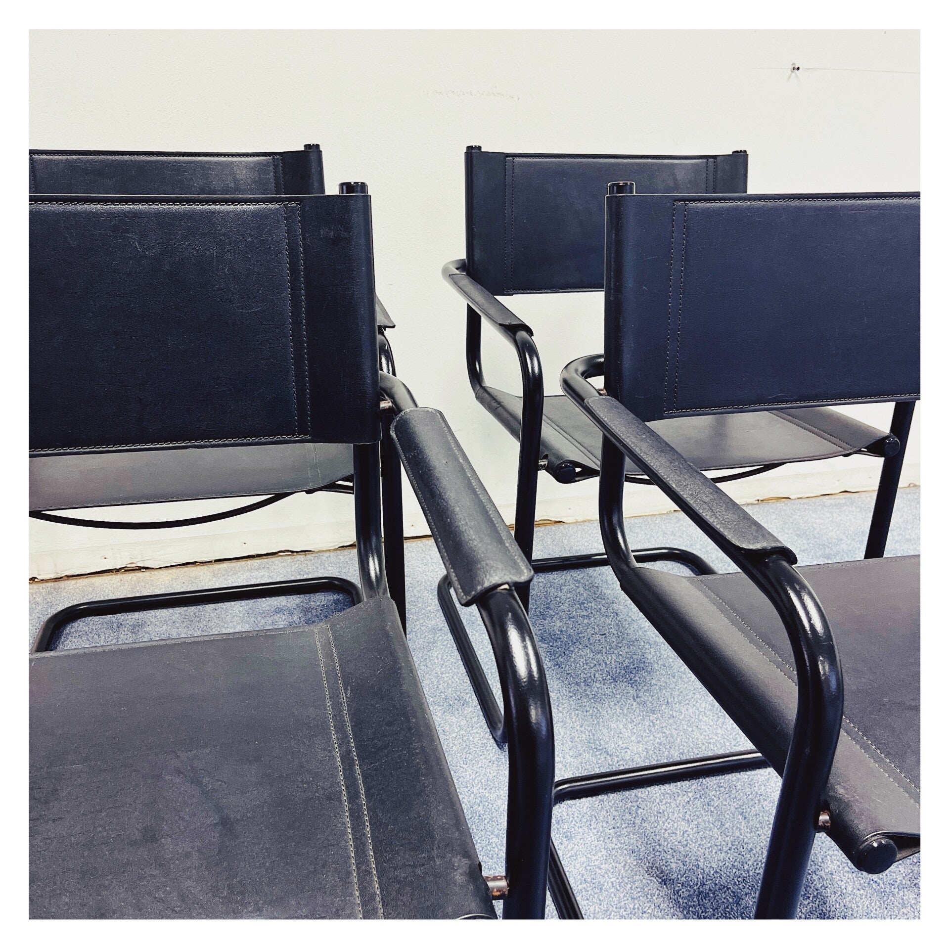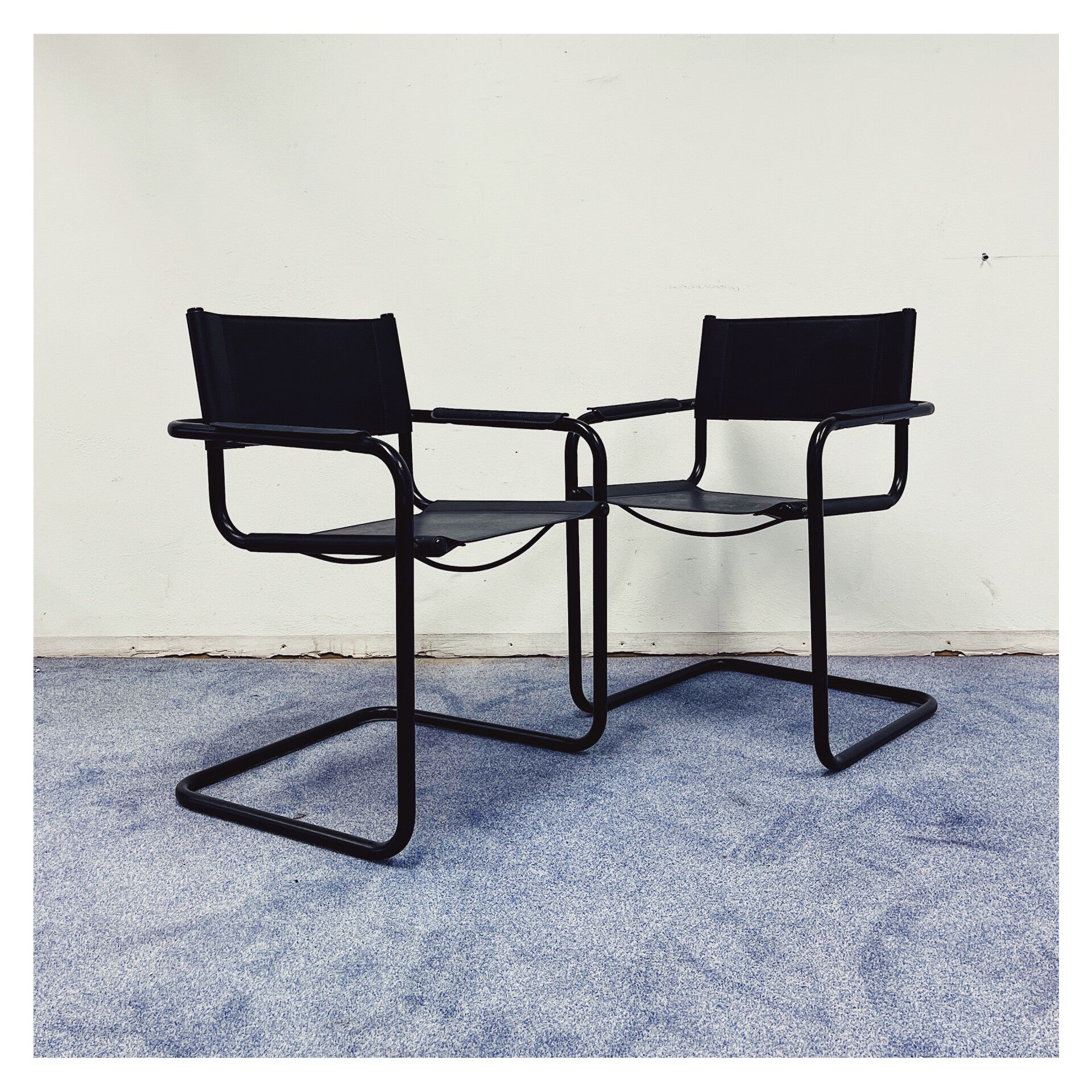 Vintage buisframe stoelen set van vier. De zitting van de stoelen is vervaardigd van hoogwaardig zwart kunstleer. Het frame is gemaakt van zwart verchroomde buizen. De stoelen zijn in hele goede staat en vertonen enkel wat kleine krasjes in het skai leer en wat roestplekjes aan de onderzijde.