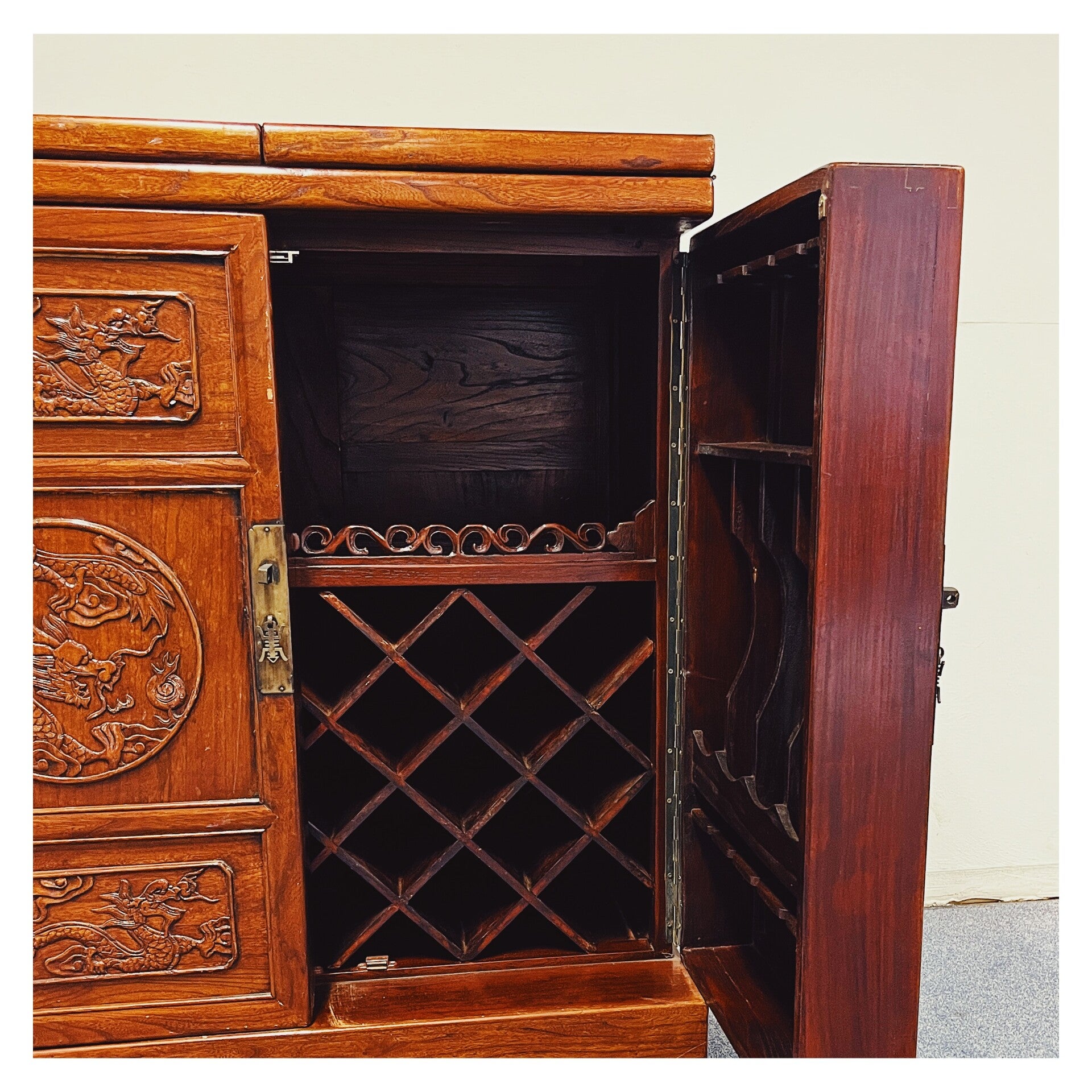 Deze bijzondere Chinese barkast heeft een paar deuren die toegang geven tot een speciaal ontworpen opslagcompartiment voor drank, waardoor de kast verandert in een prachtig gedetailleerde bar.