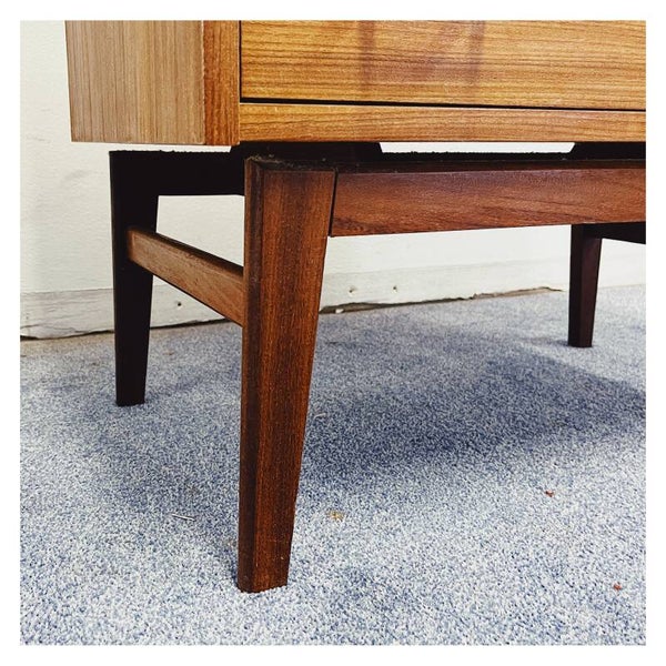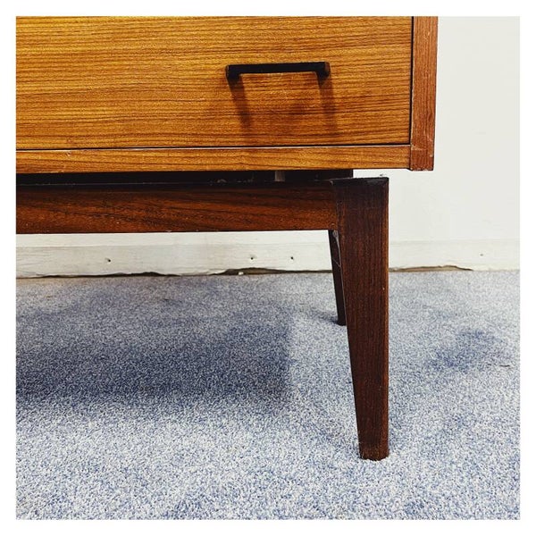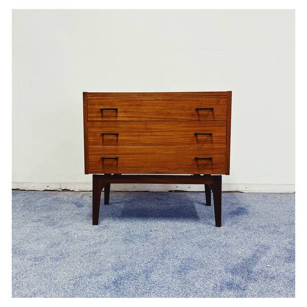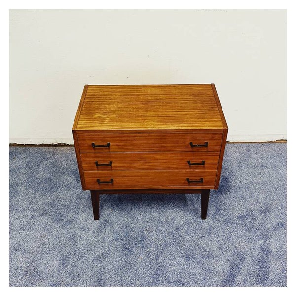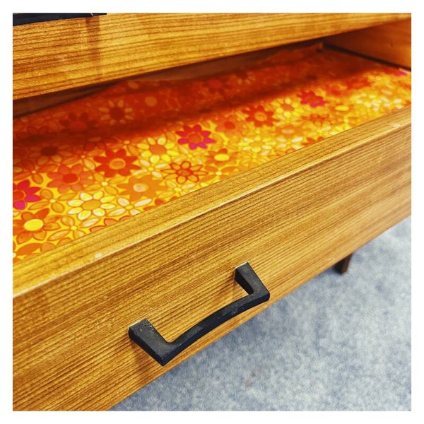 Mid-century ladekastje. Dit kastje heeft een typisch Scandinavisch design en lijkt als het ware te zweven op zijn onderstel. Het heeft drie opbergladen met een retro bloemenprint aan de binnenkant. Er zijn enkele kleine mankementen, zoals het stroef openen van de laden en wat verkleuringen en vlekjes door de leeftijd. We hebben de prijs van het kastje hierop aangepast, maar het kastje kan zeker nog een tijdje mee.