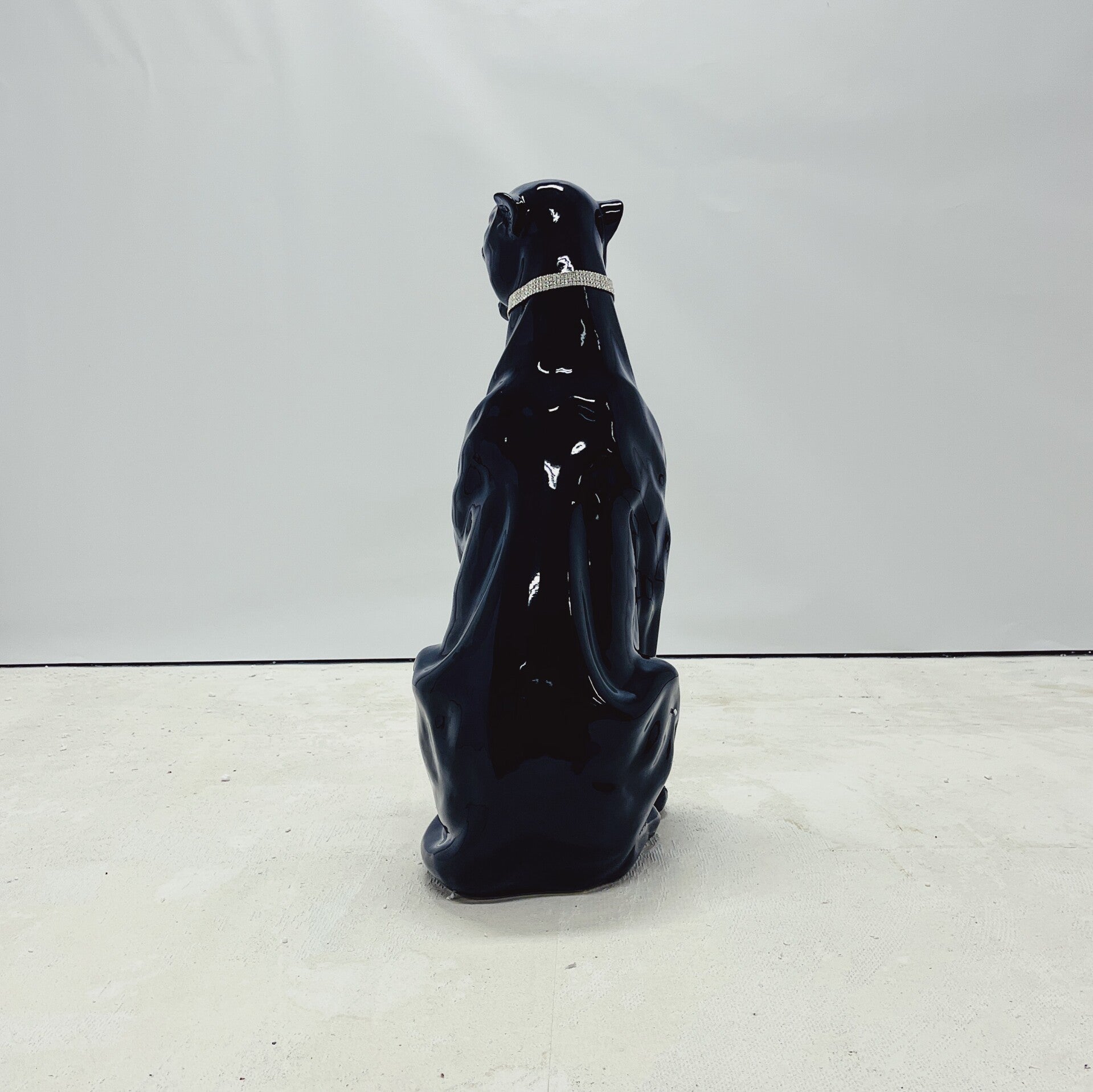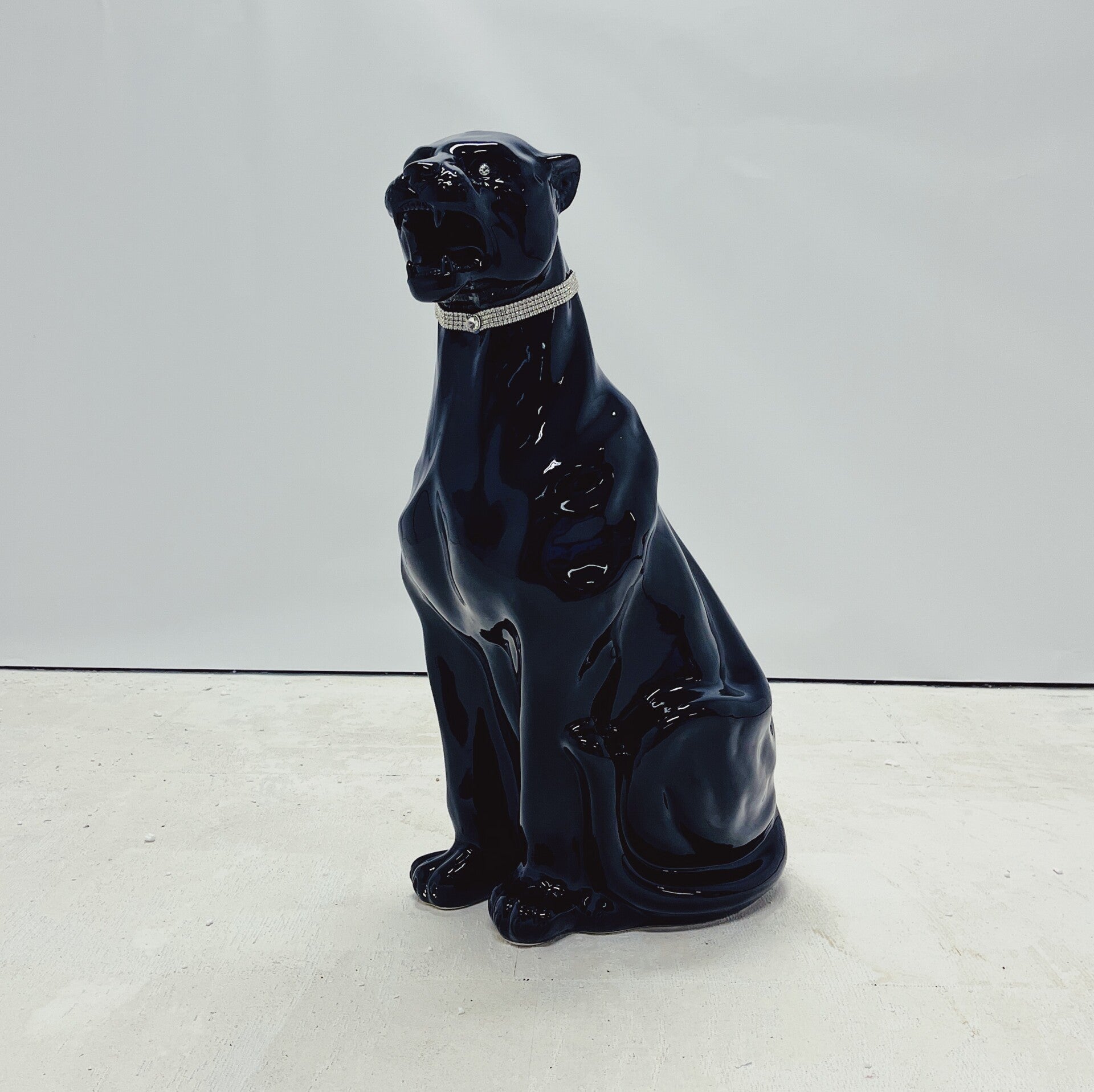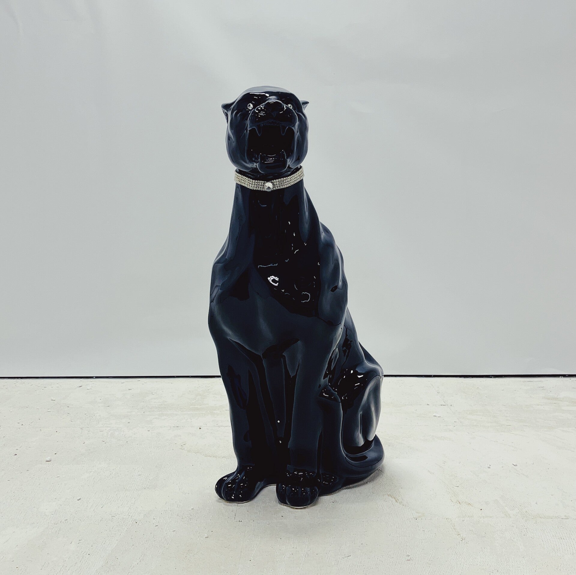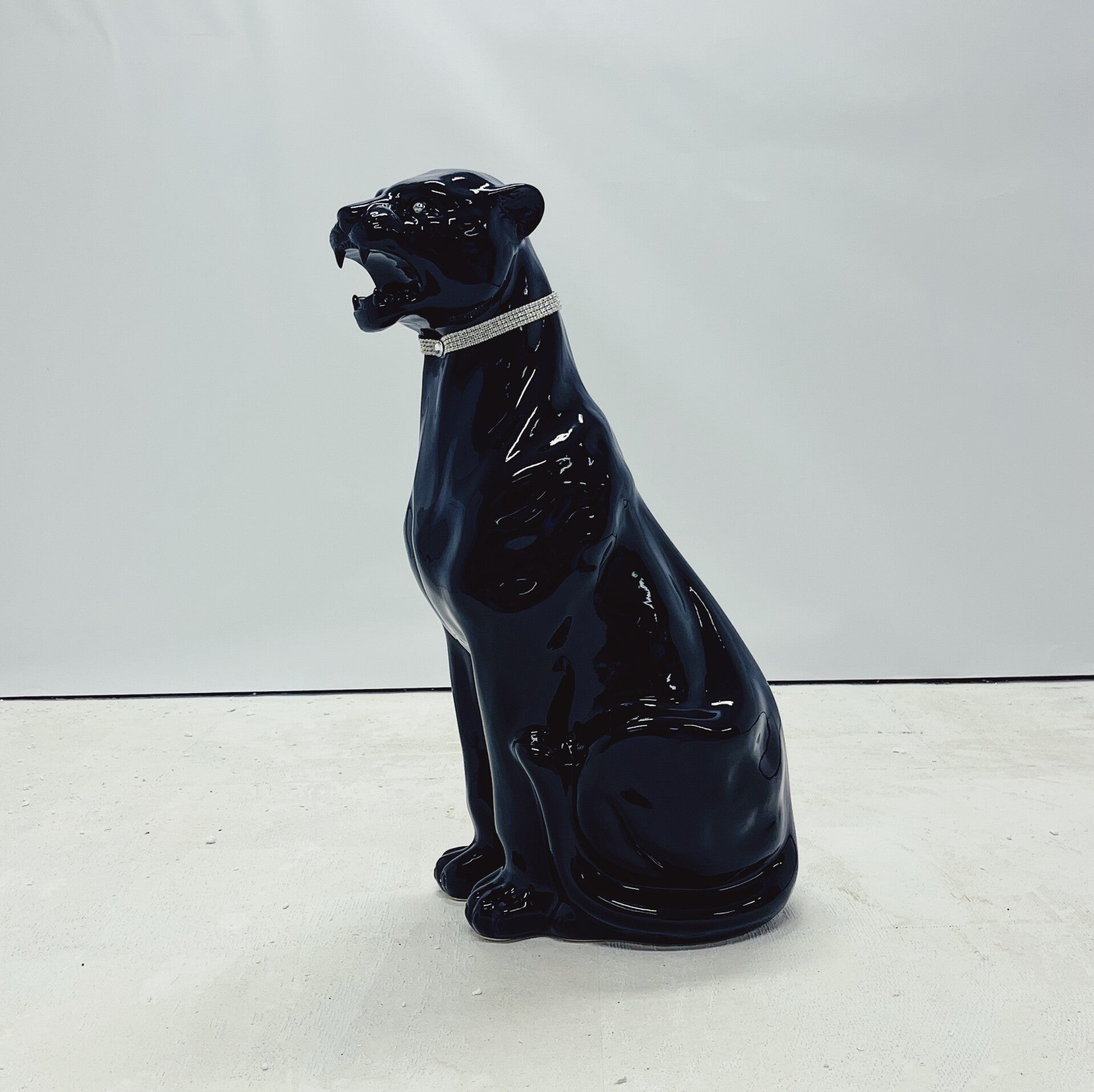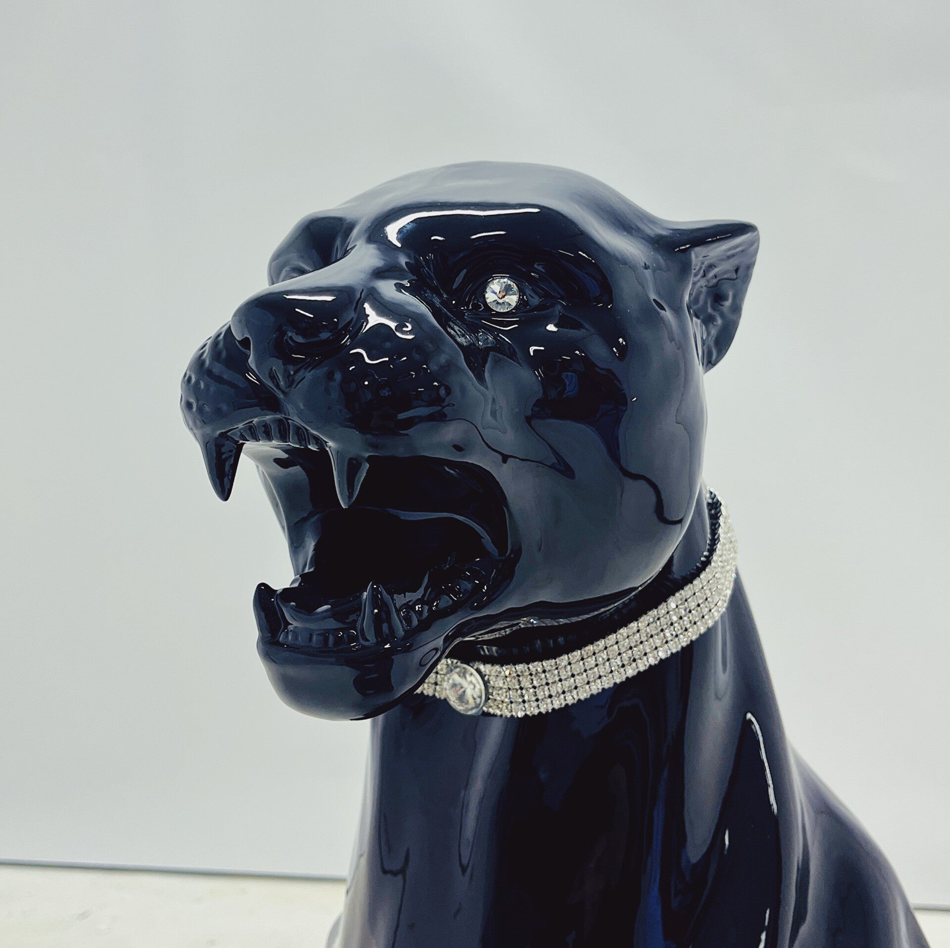 Uniek handgemaakt beeld van een zwarte panter. De panter heeft een halsband en ogen ingelegd met kleine kristalletjes. Dit Hollywood Regency beeld, vervaardigd van met de hand beschilderd keramiek en gemaakt in Italië, zal ongetwijfeld een verbluffende en stoere uitstraling aan je interieur toevoegen!