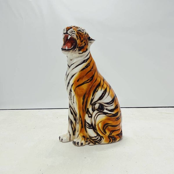 Uniek handgemaakt beeld van een tijger. Dit Hollywood Regency beeld, vervaardigd van met de hand beschilderd keramiek en gemaakt in Italië, zal ongetwijfeld een verbluffende en stoere uitstraling aan je interieur toevoegen!