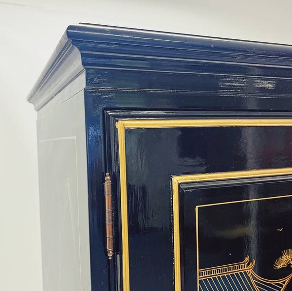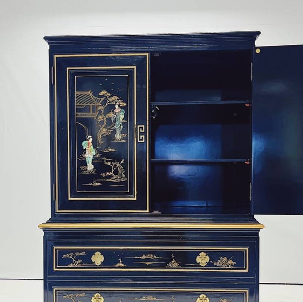Deze zwarte gelakte Chinese kast bestaat uit een boven- en ondergedeelte die los op elkaar staan, maar wel stevig en stabiel zijn.