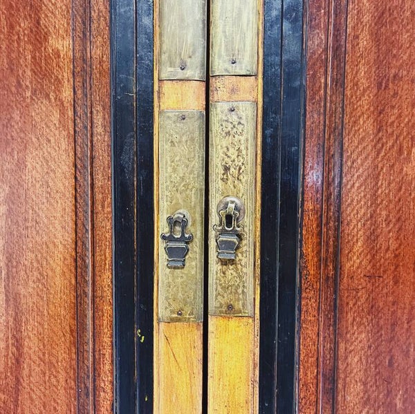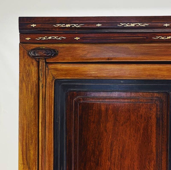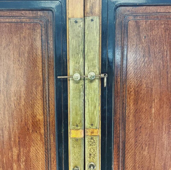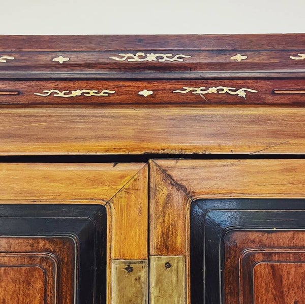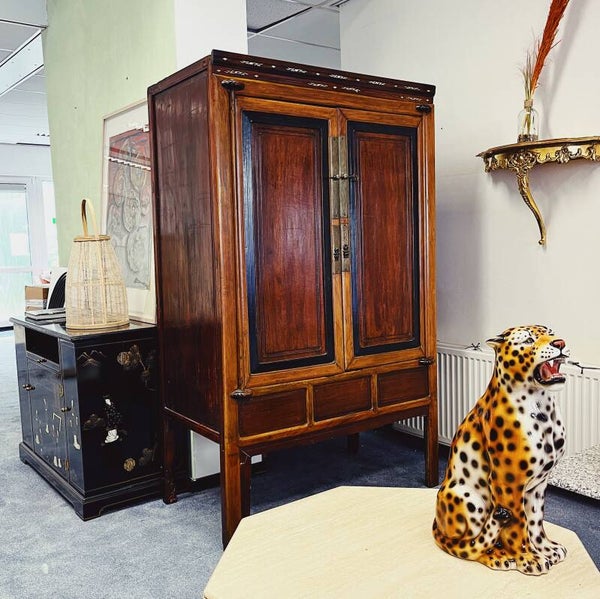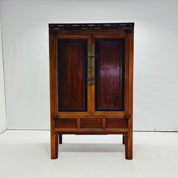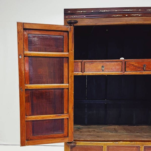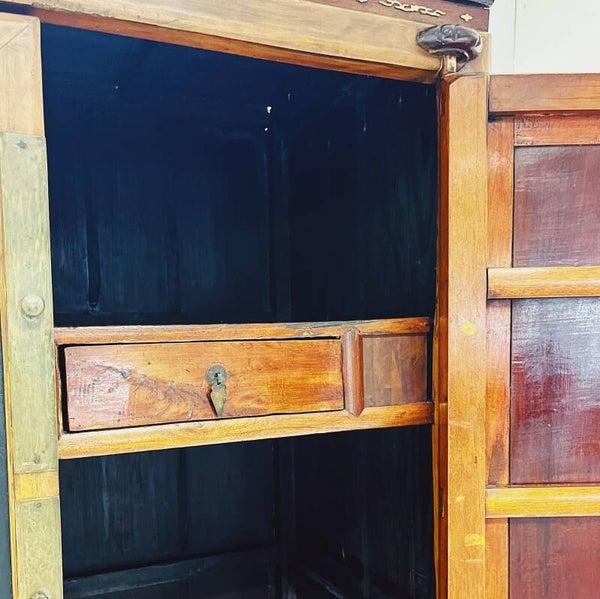 Antieke Chinese kast met twee deuren en traditioneel hang-en-sluitwerk. Aan de binnenkant van beide deuren bevindt zich een afscheidingsplank met twee ruime laden. De kast vertoont enige slijtage, passend bij een antieke kast. Maak gerust een afspraak om de kast te komen bekijken!