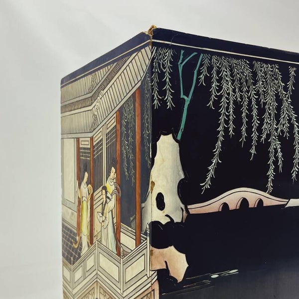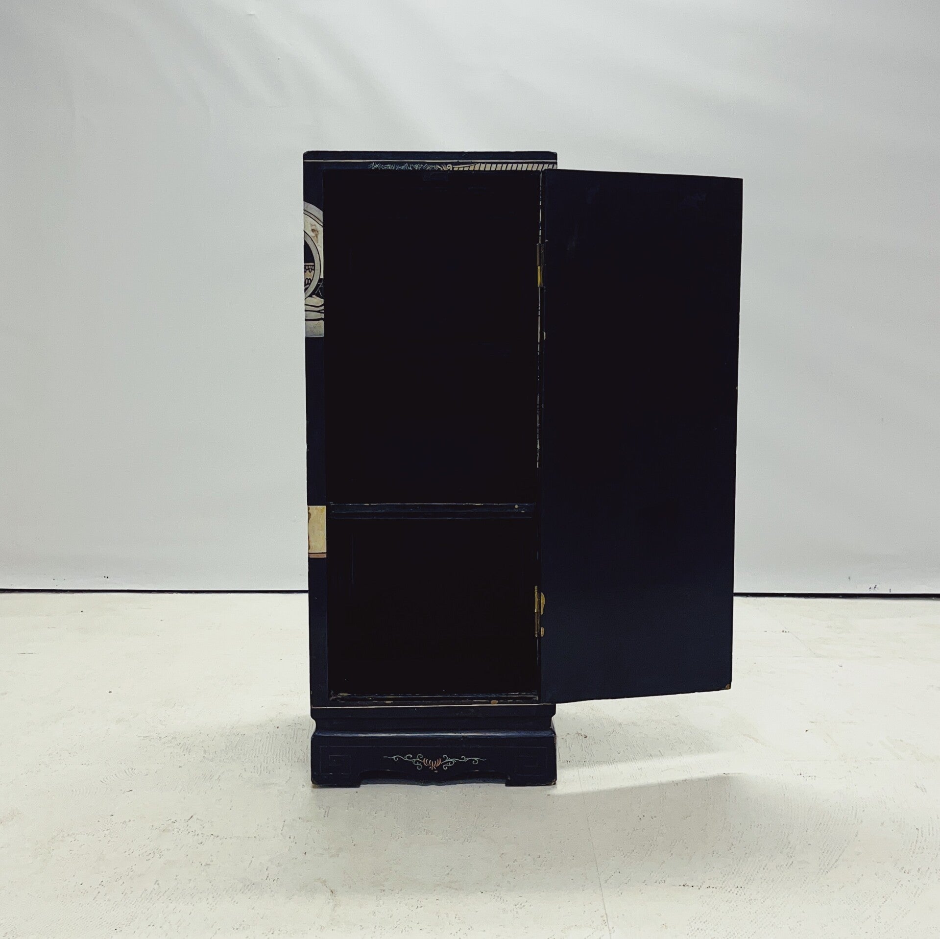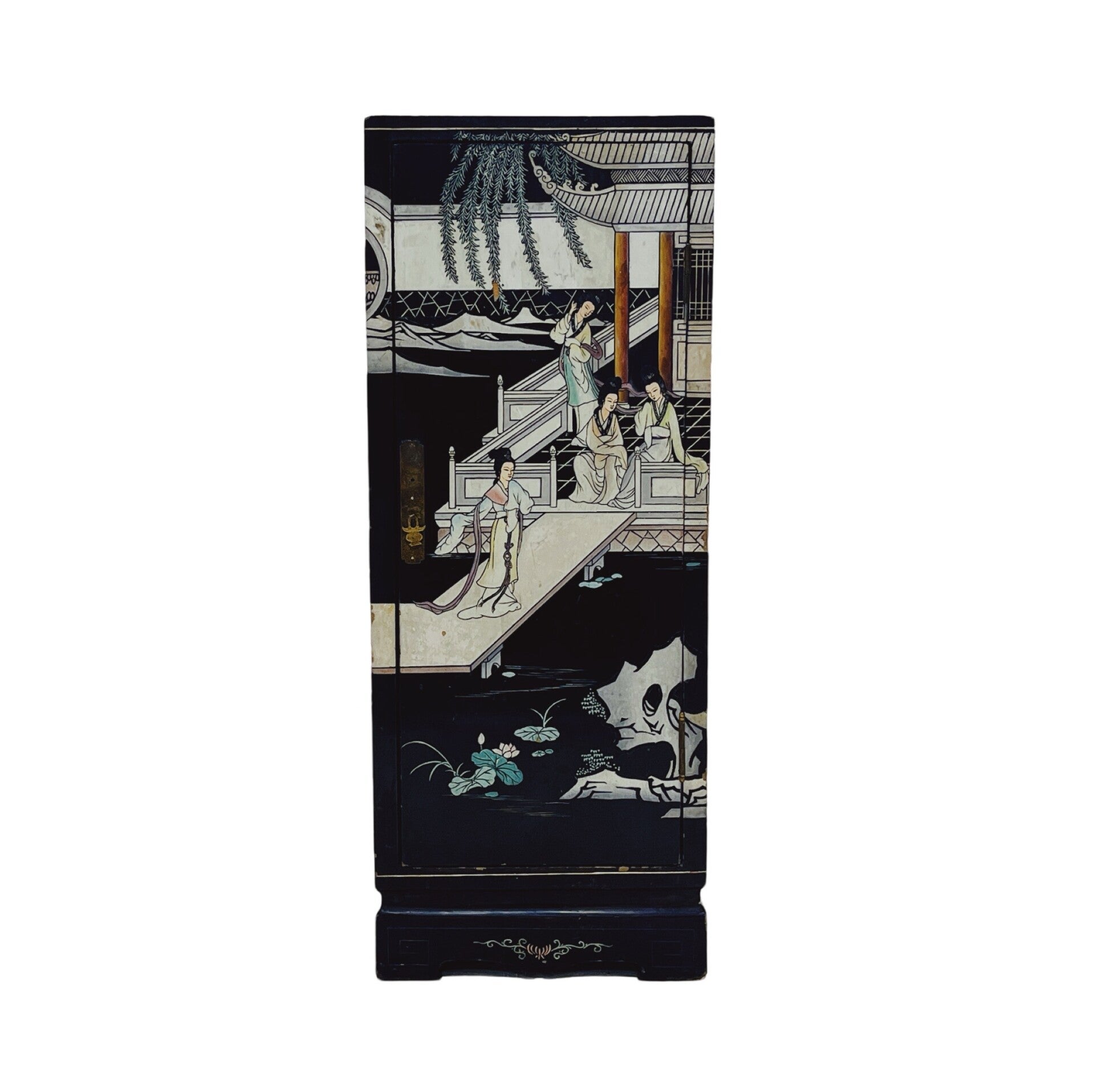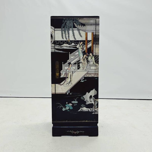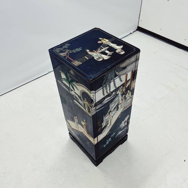 Elegant Aziatisch pedestal kastje met aan de binnenzijde twee ruime opbergvakken. Het kastje is voorzien van met de hand geschilderde decoraties. Het rechthoekige opbergmeubel is aan alle vier de zijden rijkelijk gedecoreerd en het deurtje is voorzien van een messing sluitwerk in goud. Het Chinese kastje heeft enkele zichtbare gebruikssporen en mist een pinnetje in het hang-en-sluitwerk.