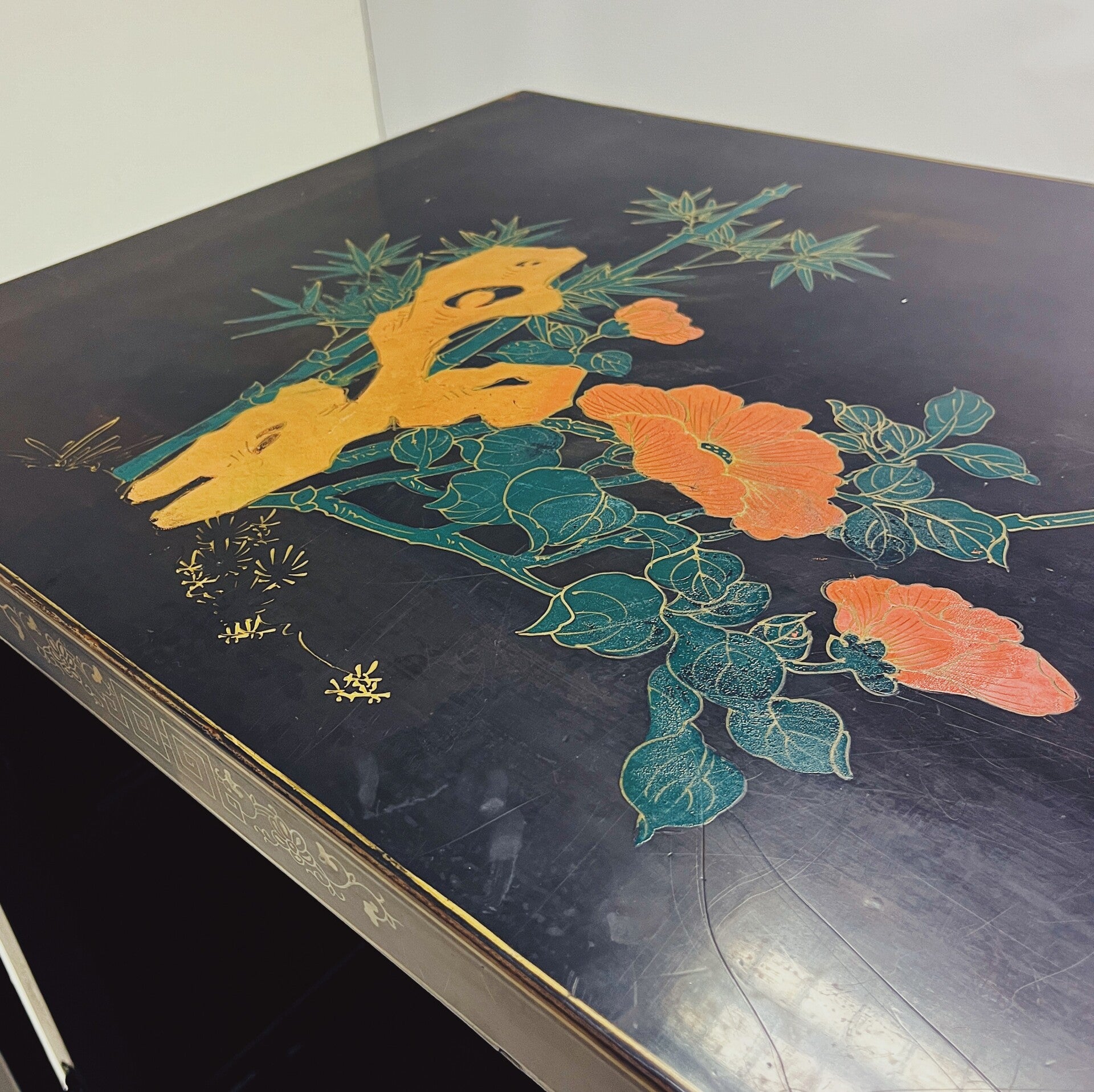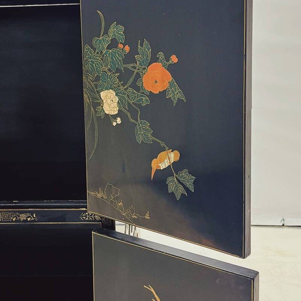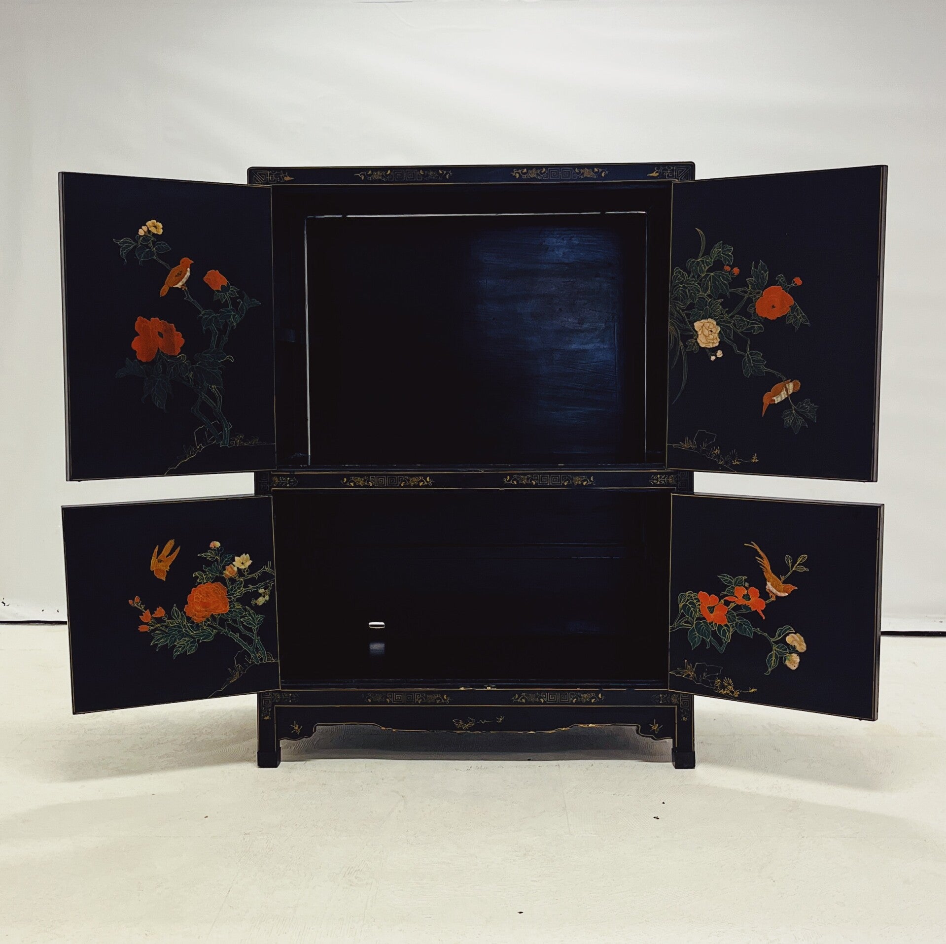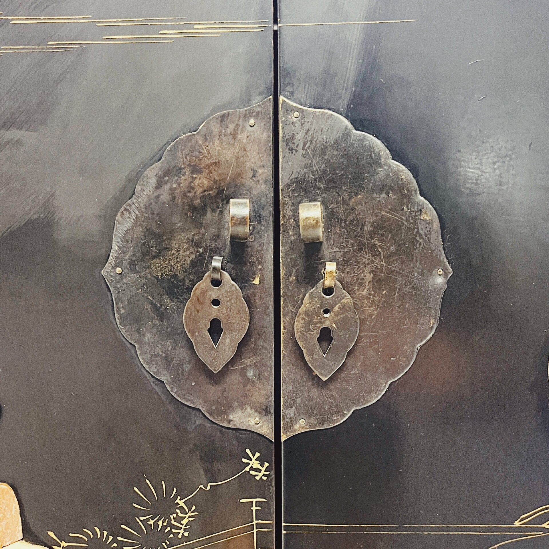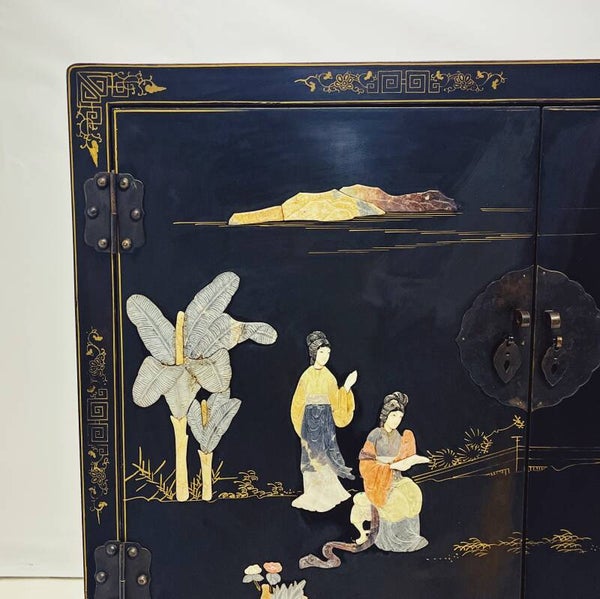 Vintage Chinese meidenkast met rijkelijke versieringen aan de buitenkant. De fraaie decoraties zijn onder andere gemaakt van speksteen. De kast heeft twee deuren en aan de binnenkant twee ruime opbergvakken. Daarnaast heeft de kast een handig, mediumhoog formaat. De kast vertoont hier en daar wat kleine slijtageplekken en gebruikssporen door de leeftijd.