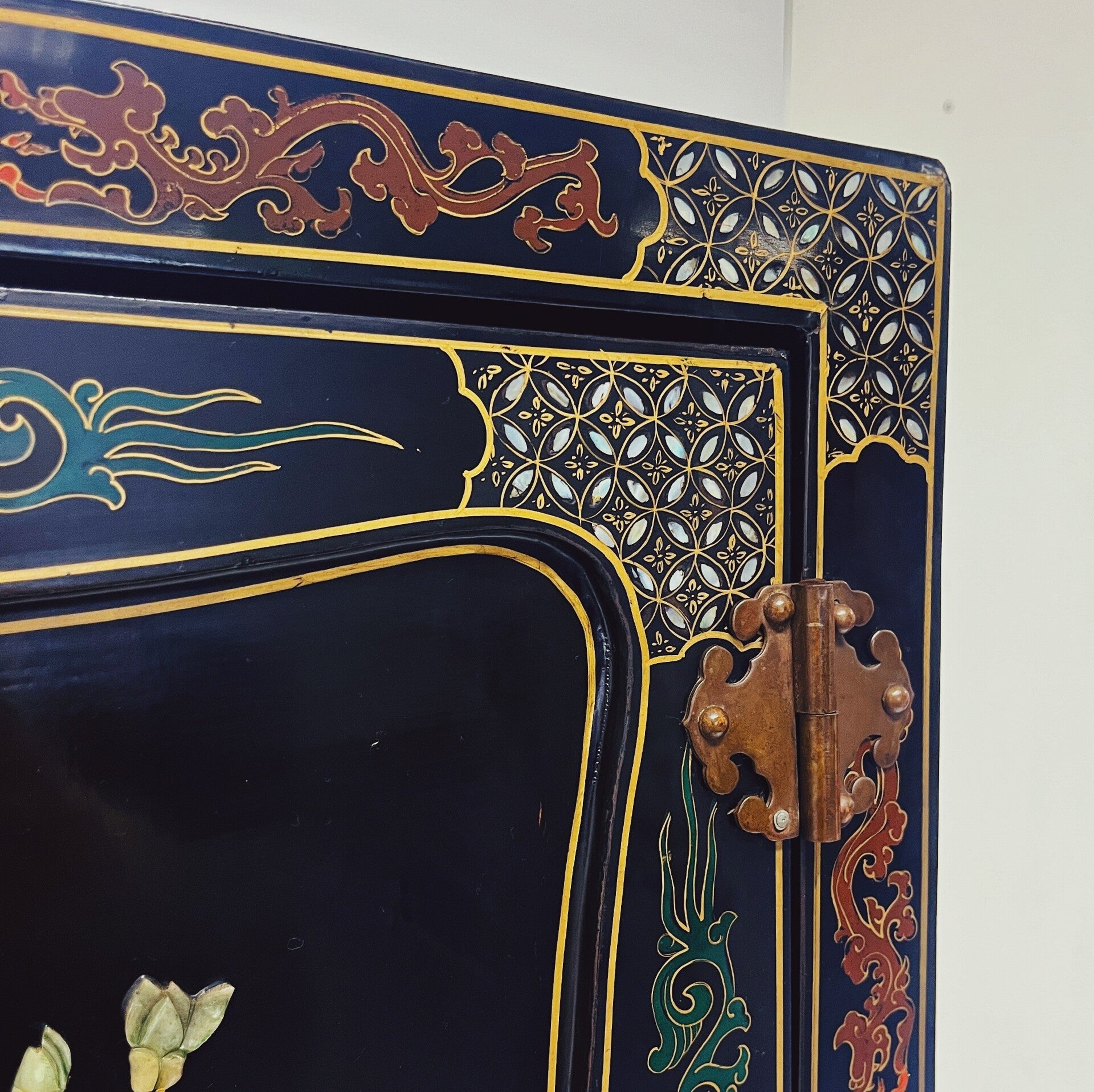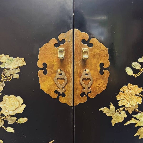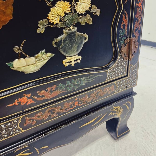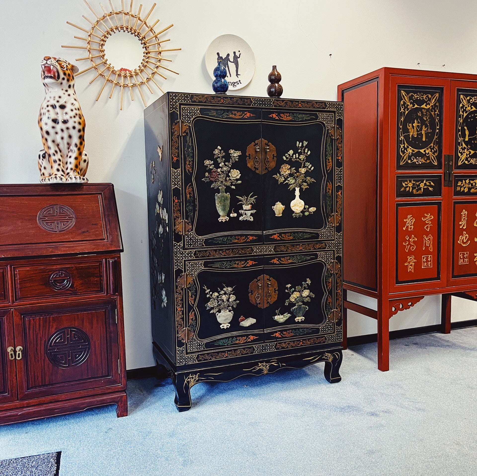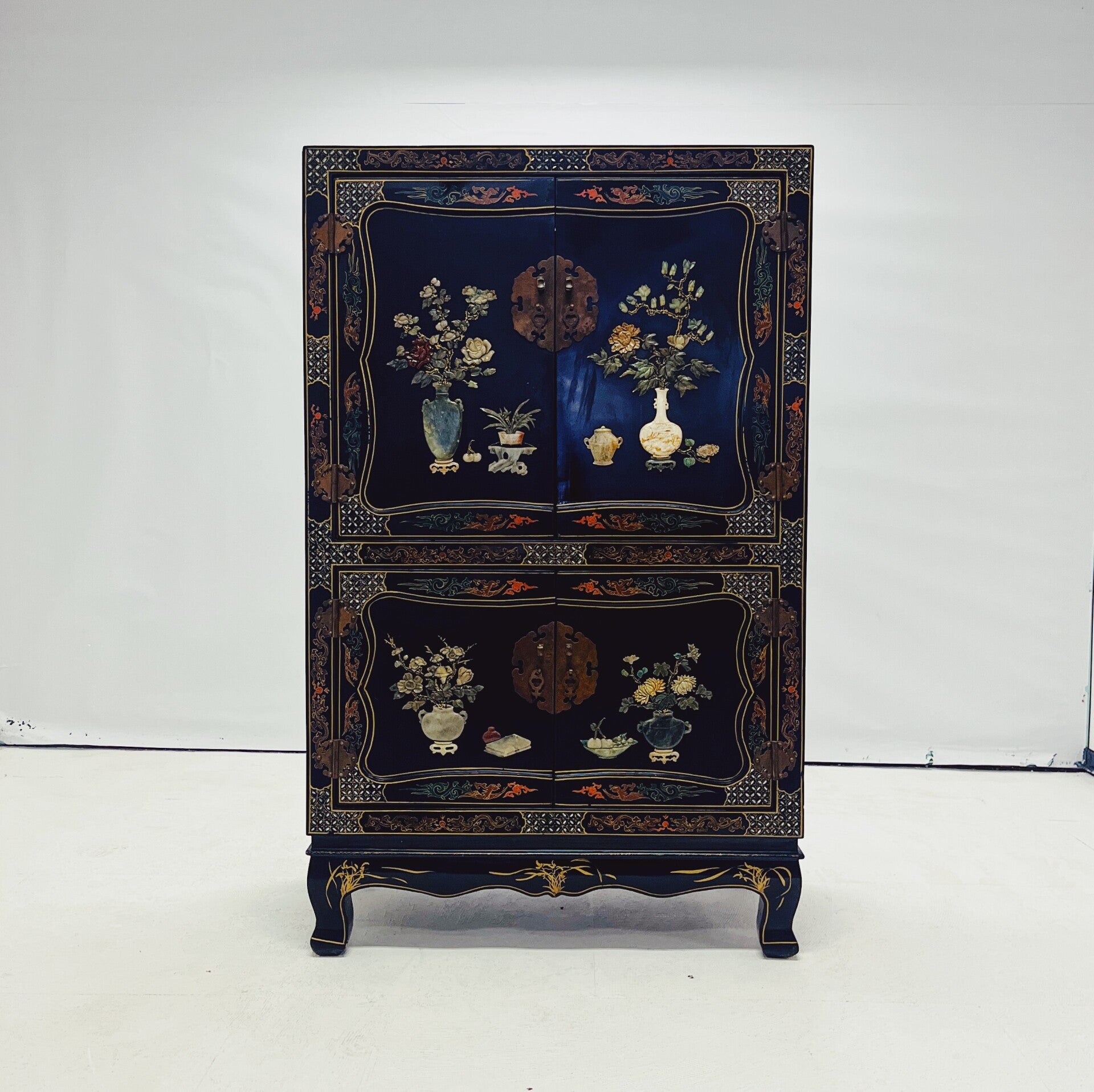 Chinese kast vervaardigd uit massief hout en geschilderd in zwarte matte lak. De kast is voorzien van verschillende handgeschilderde schilderingen en decoraties met bloemen. De bloemornamenten zijn ingelegd met speksteen. Zowel aan de boven- als onderzijde heeft de kast twee compartimenten die veel opbergruimte bieden. De kast verkeert in goede vintage conditie!