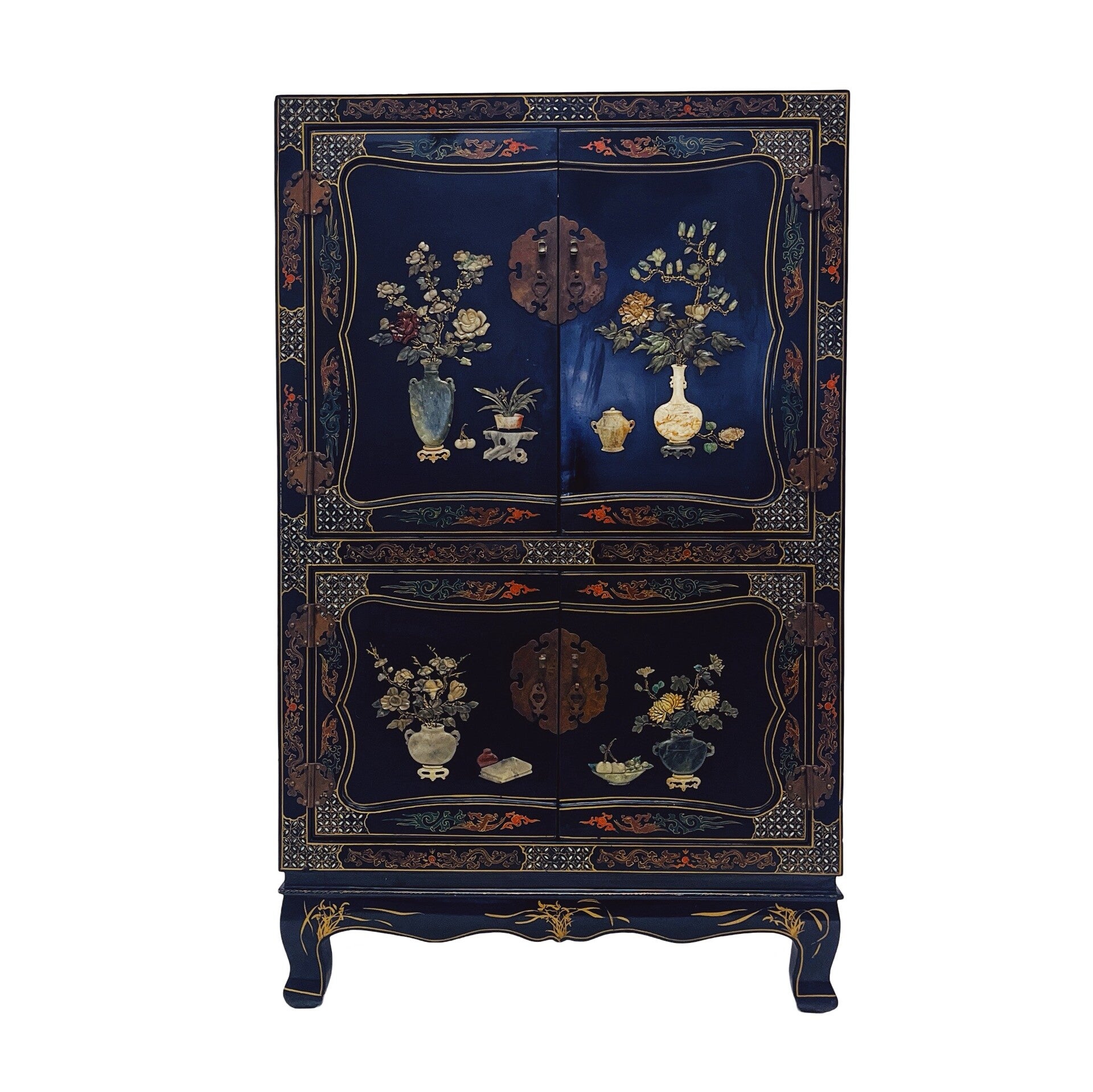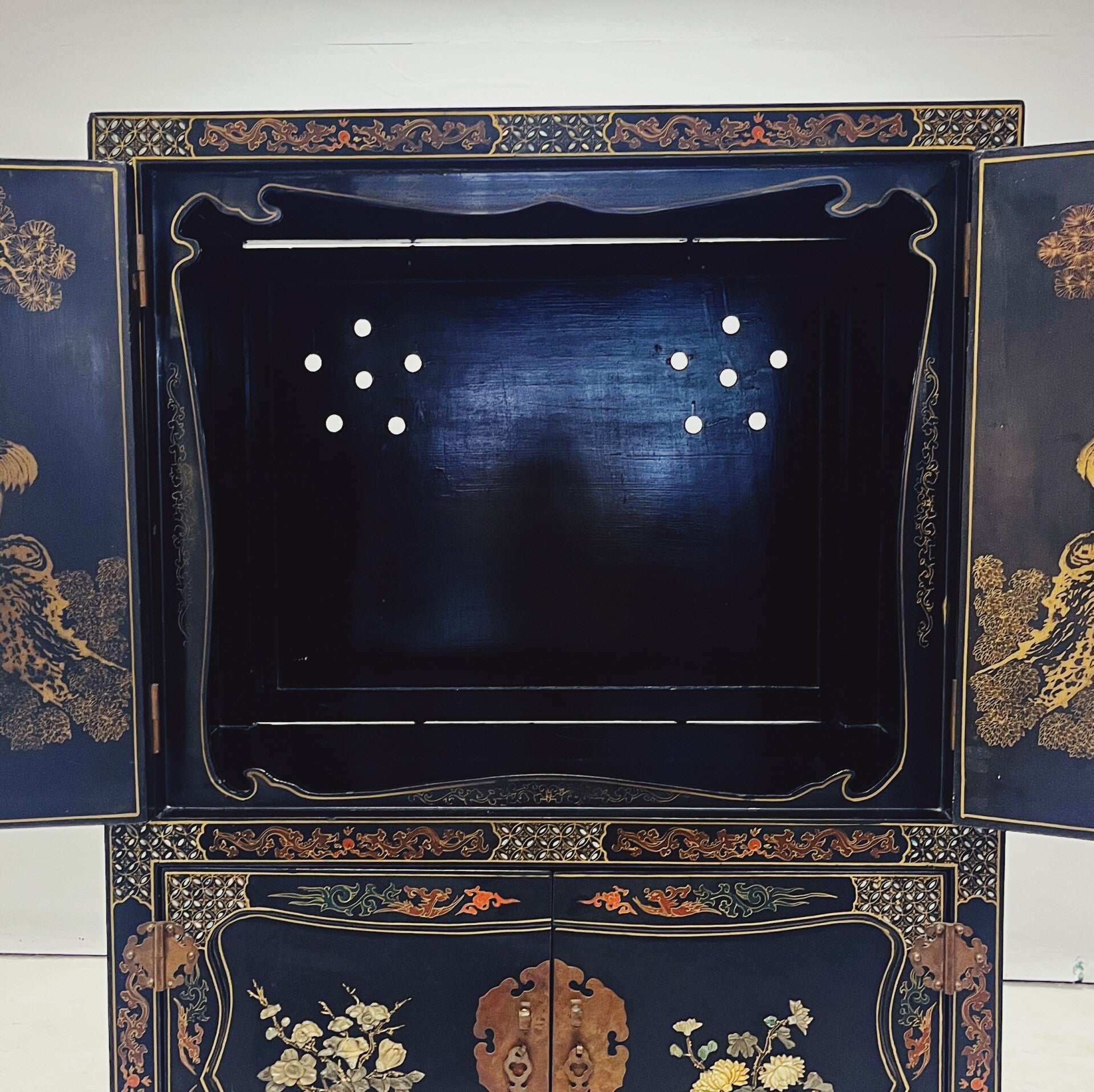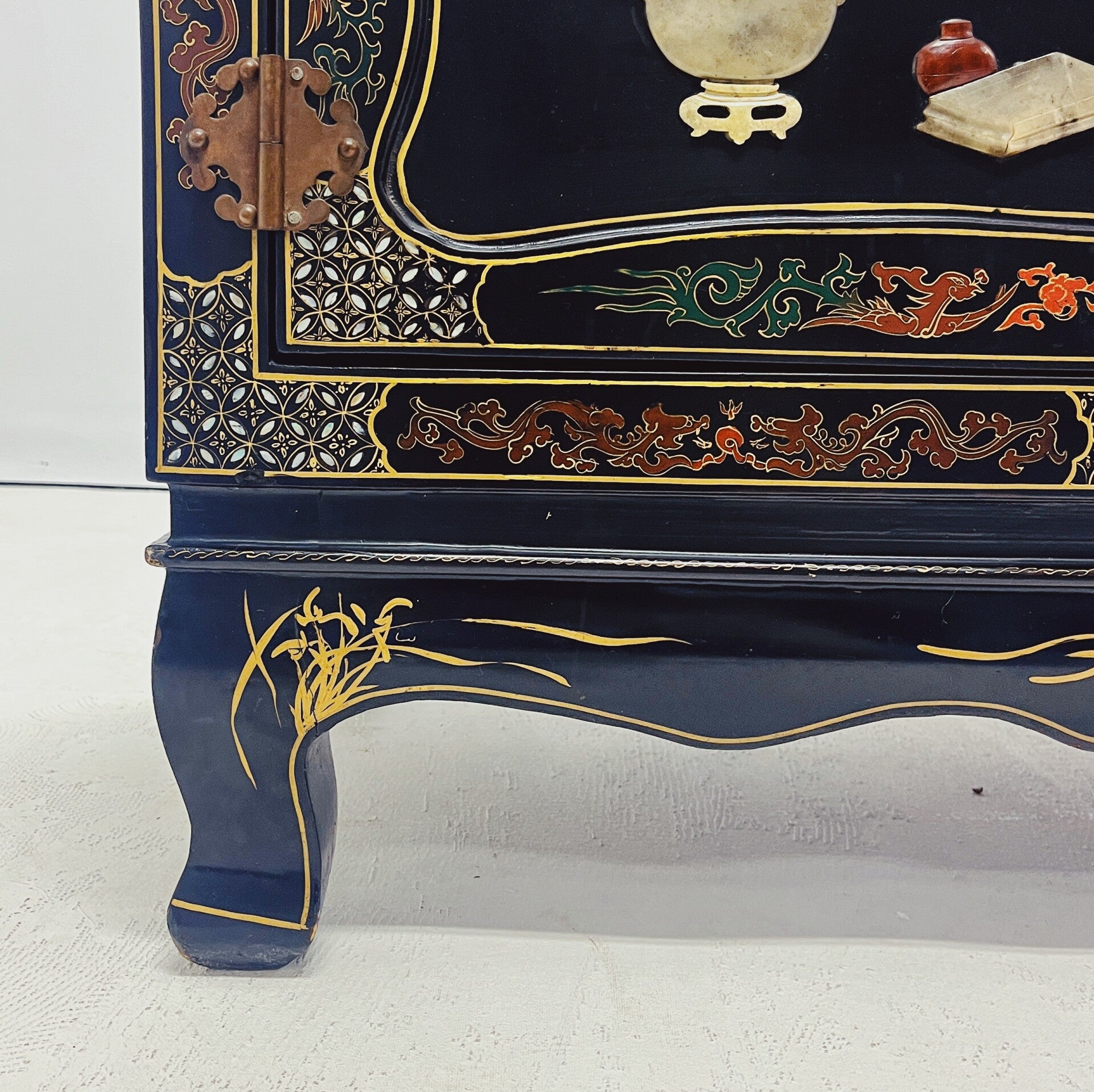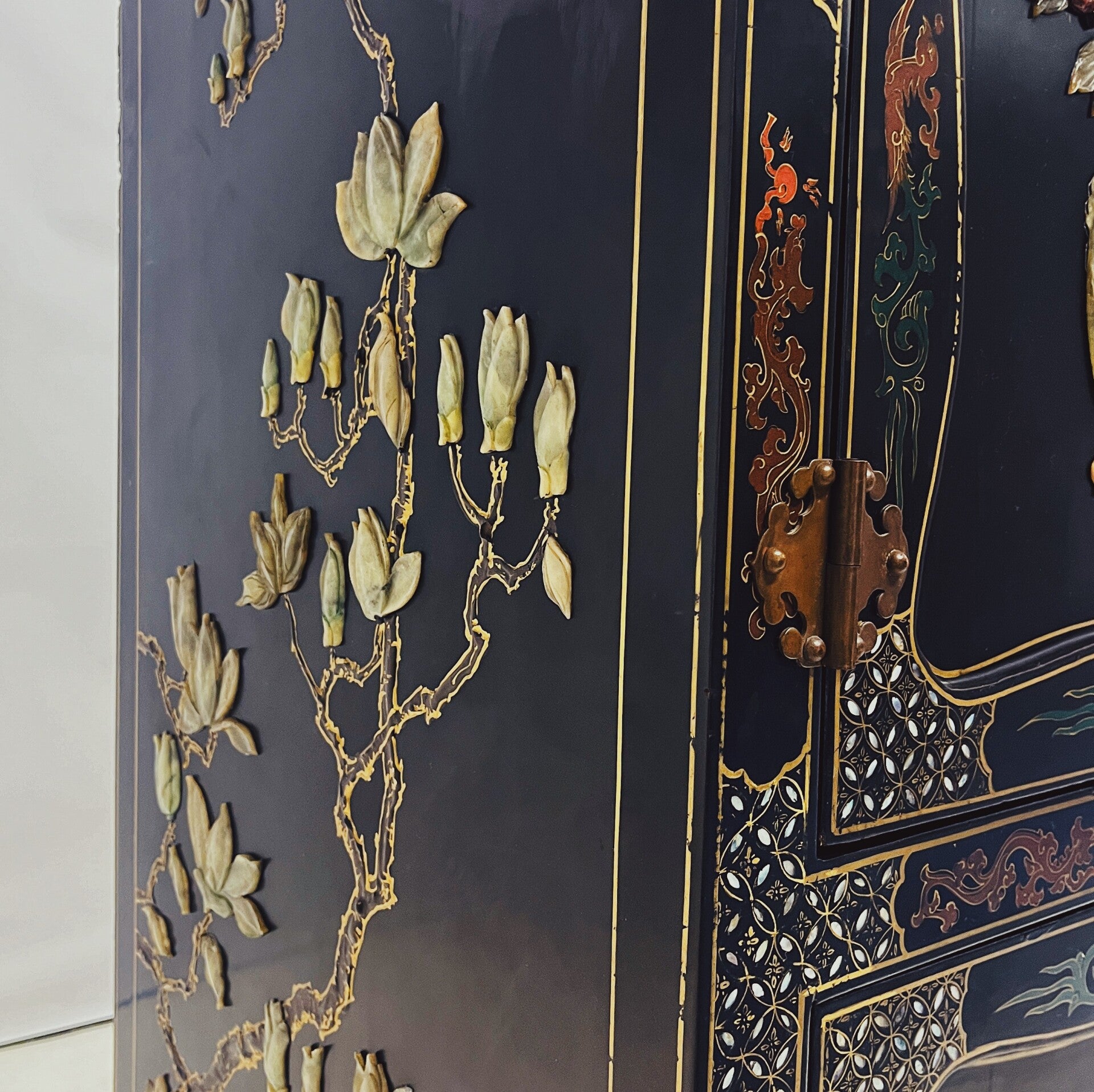 Chinese kast vervaardigd uit massief hout en geschilderd in zwarte matte lak. De kast is voorzien van verschillende handgeschilderde schilderingen en decoraties met bloemen. De bloemornamenten zijn ingelegd met speksteen. Zowel aan de boven- als onderzijde heeft de kast twee compartimenten die veel opbergruimte bieden. De kast verkeert in goede vintage conditie!