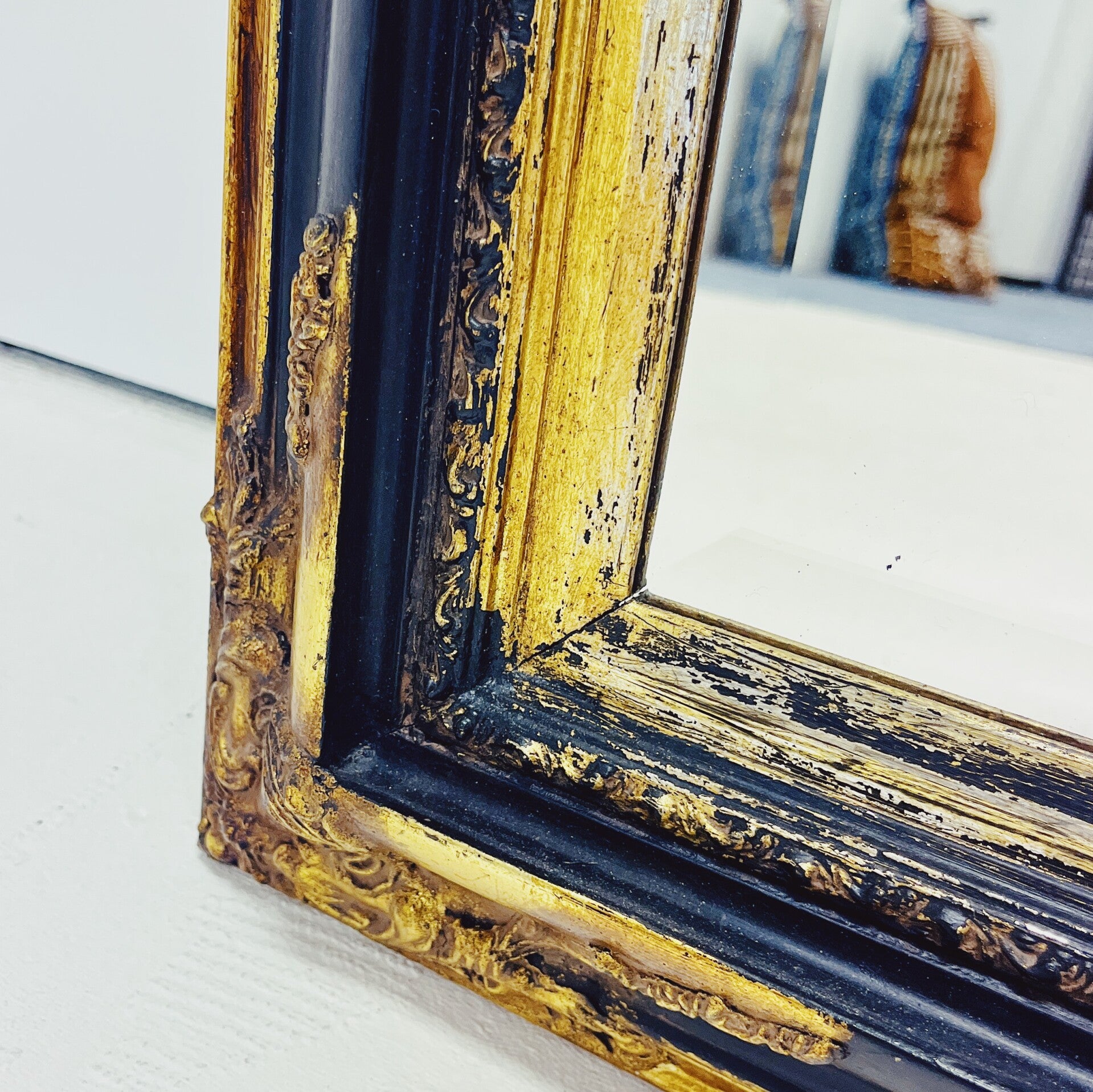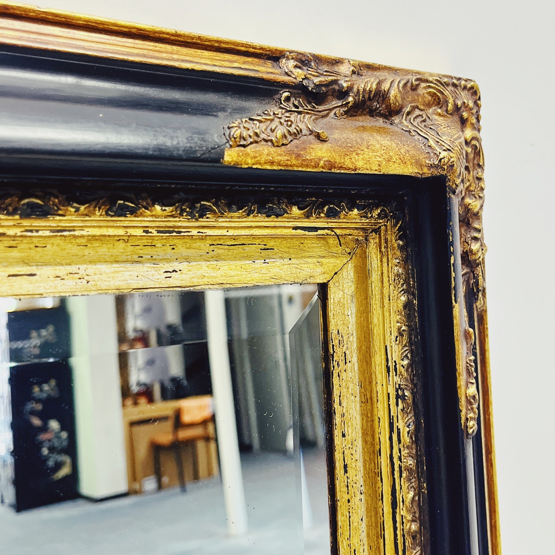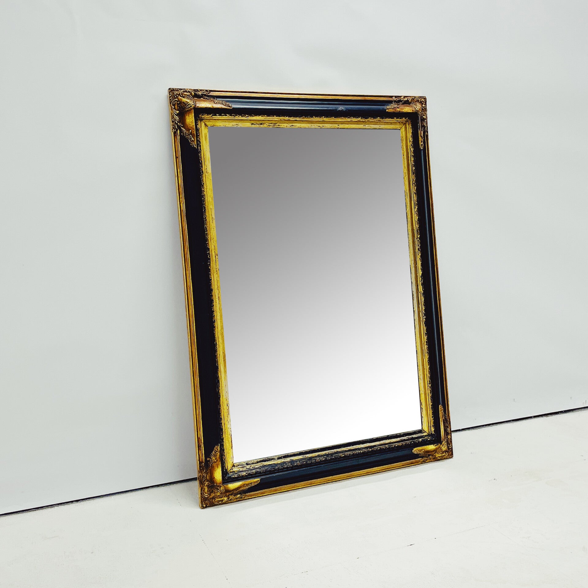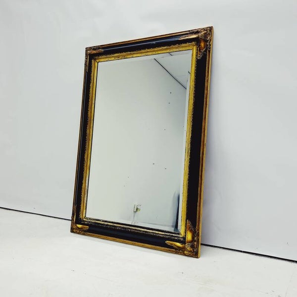 Barok spiegel met decoratief houten frame. Deze rechthoekige spiegel heeft een sierlijk, uit hout gesneden frame in de kleuren zwart en goud. De spiegel is voorzien van een stevig ophangsysteem en vertoont enkele gebruikssporen, passend bij de leeftijd.