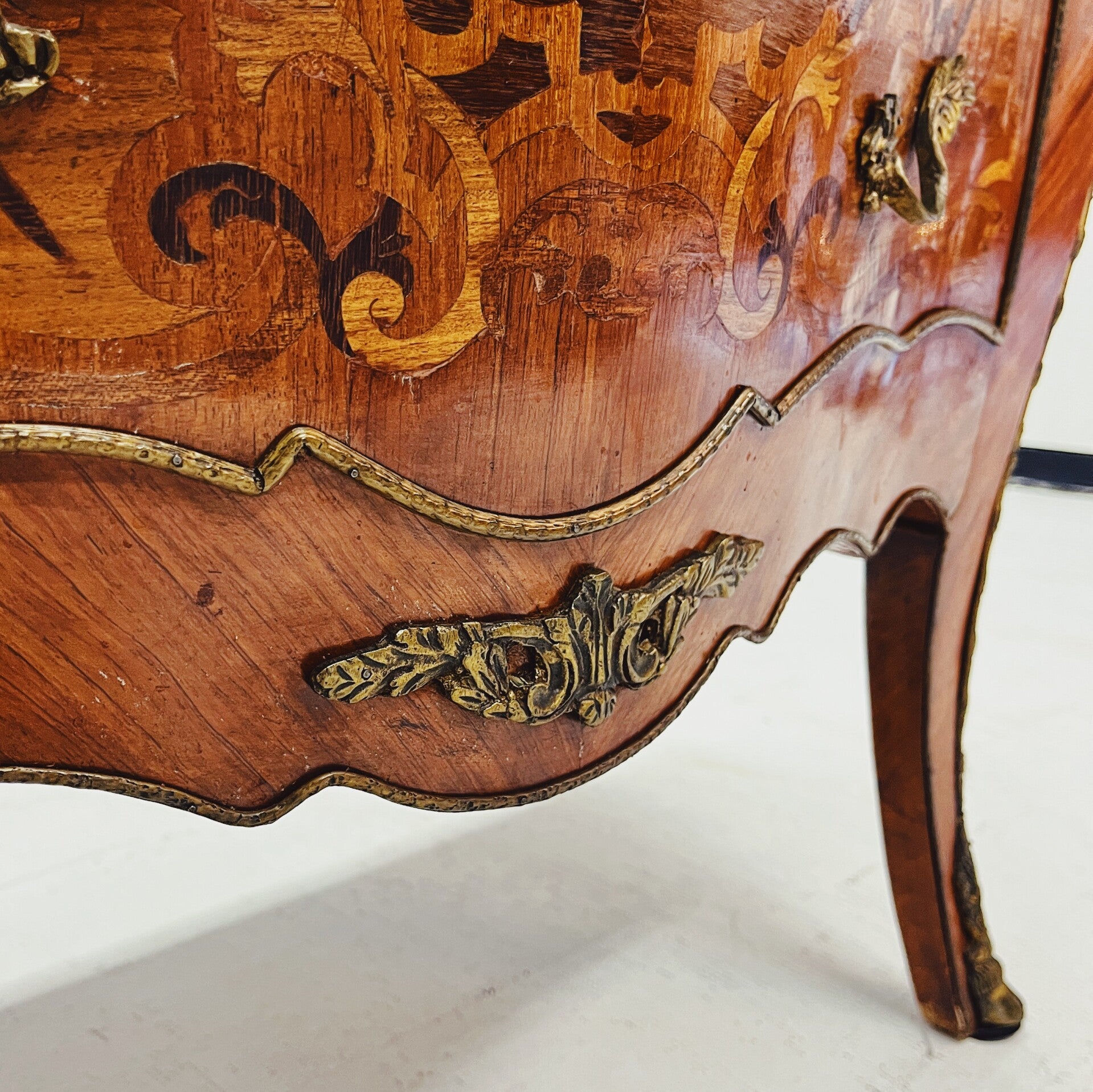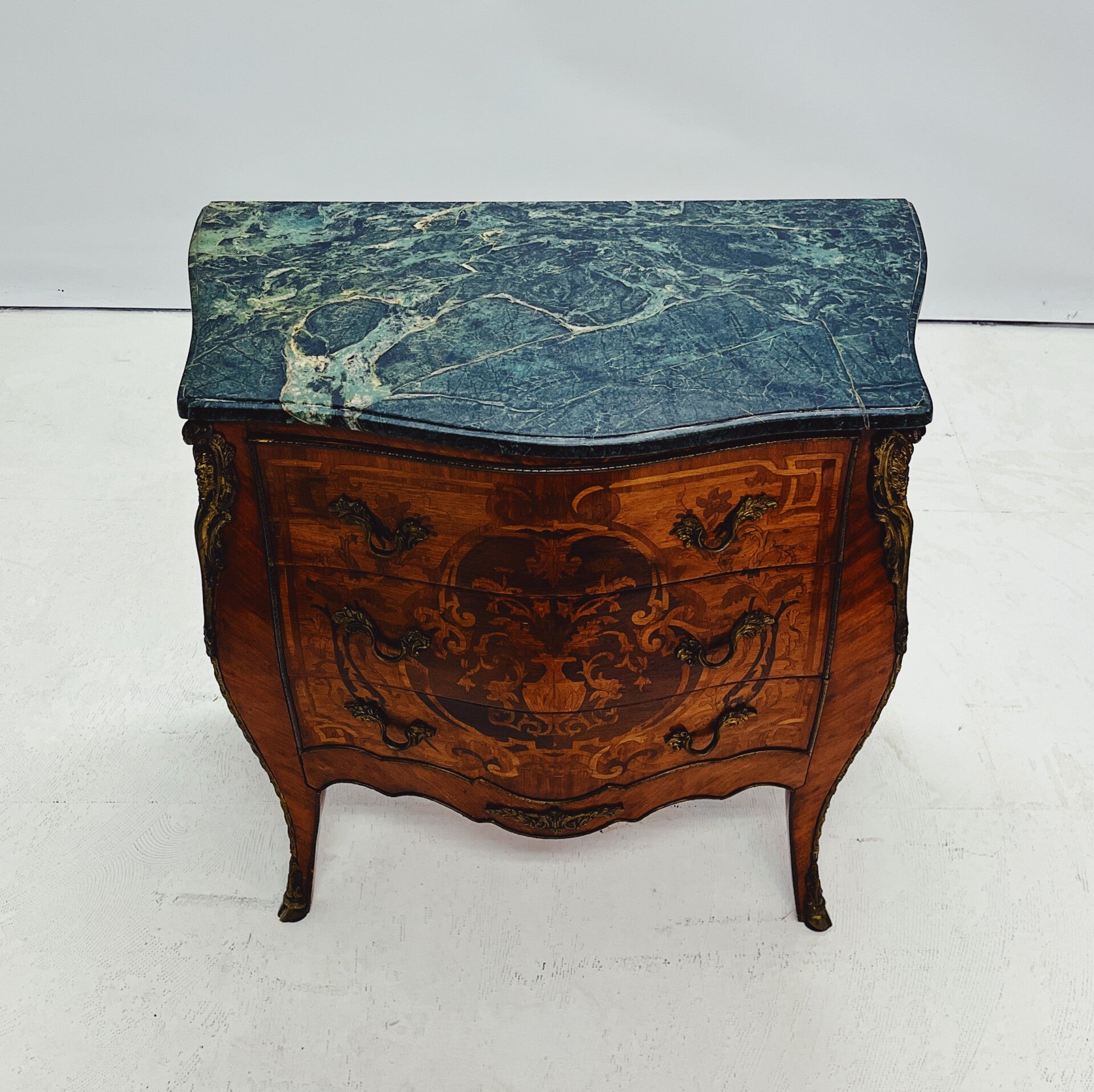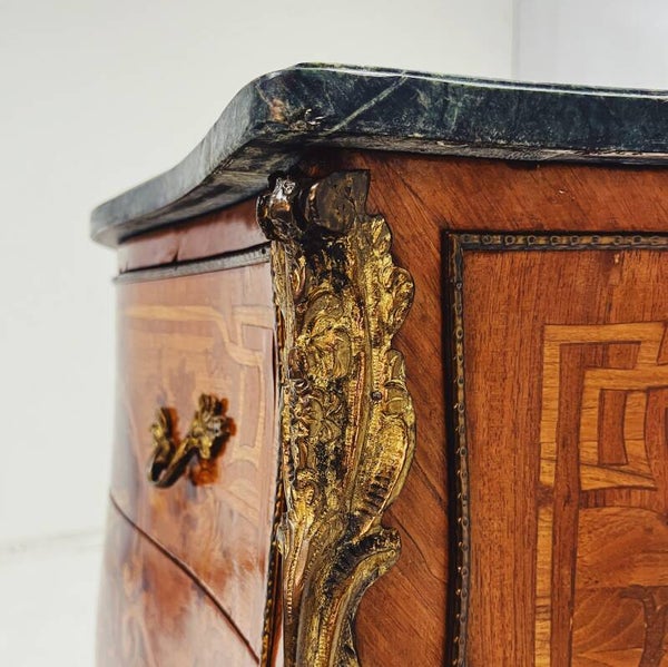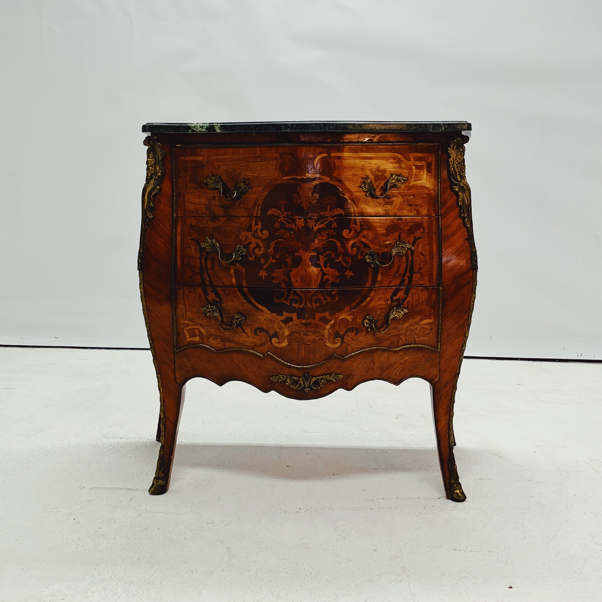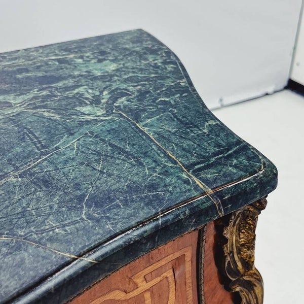 Deze gebombeerde notenhouten commode is voorzien van drie opbergladen, afgewerkt met elegante handgrepen, en wordt bekroond door een groen marmeren blad. Het blad ligt los op de kast. De kast vertoont lichte gebruikssporen aan beide zijkanten. Deze antieke commode in Louis XV-stijl voegt een chique uitstraling toe aan je interieur. Prachtig om te plaatsen in een hal, gecombineerd met een klassieke spiegel erboven.