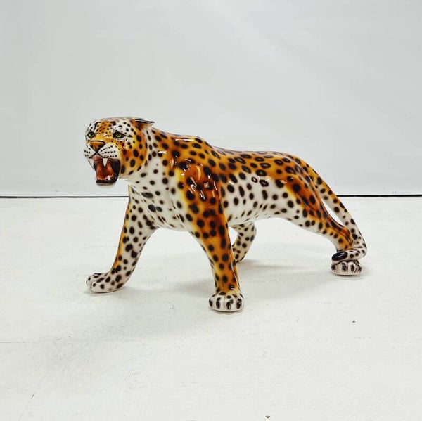 Uniek handgemaakt beeld van een luipaard. Dit Hollywood Regency beeld, vervaardigd van met de hand beschilderd keramiek en gemaakt in Italië, zal ongetwijfeld een verbluffende en stoere uitstraling aan je interieur toevoegen!